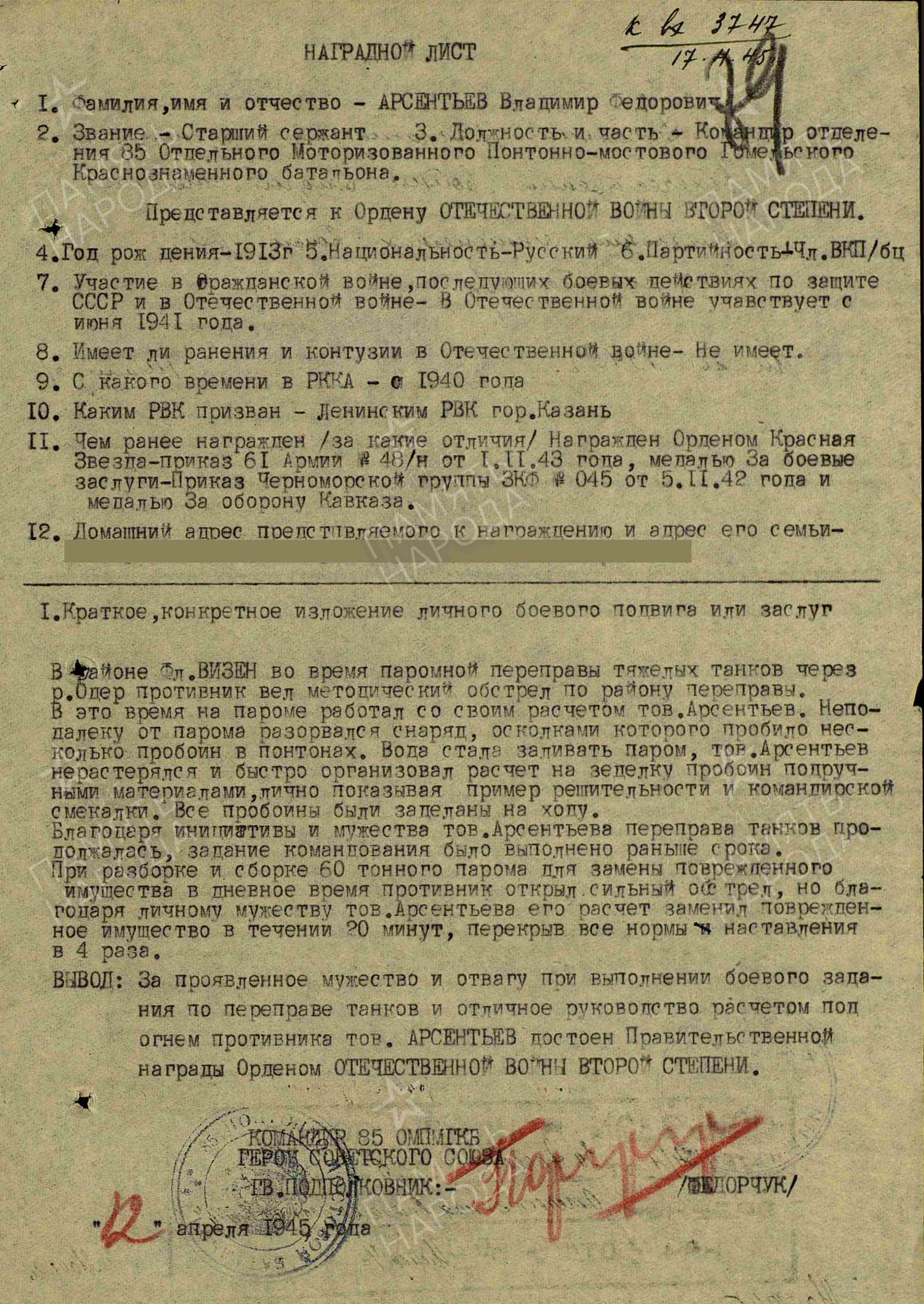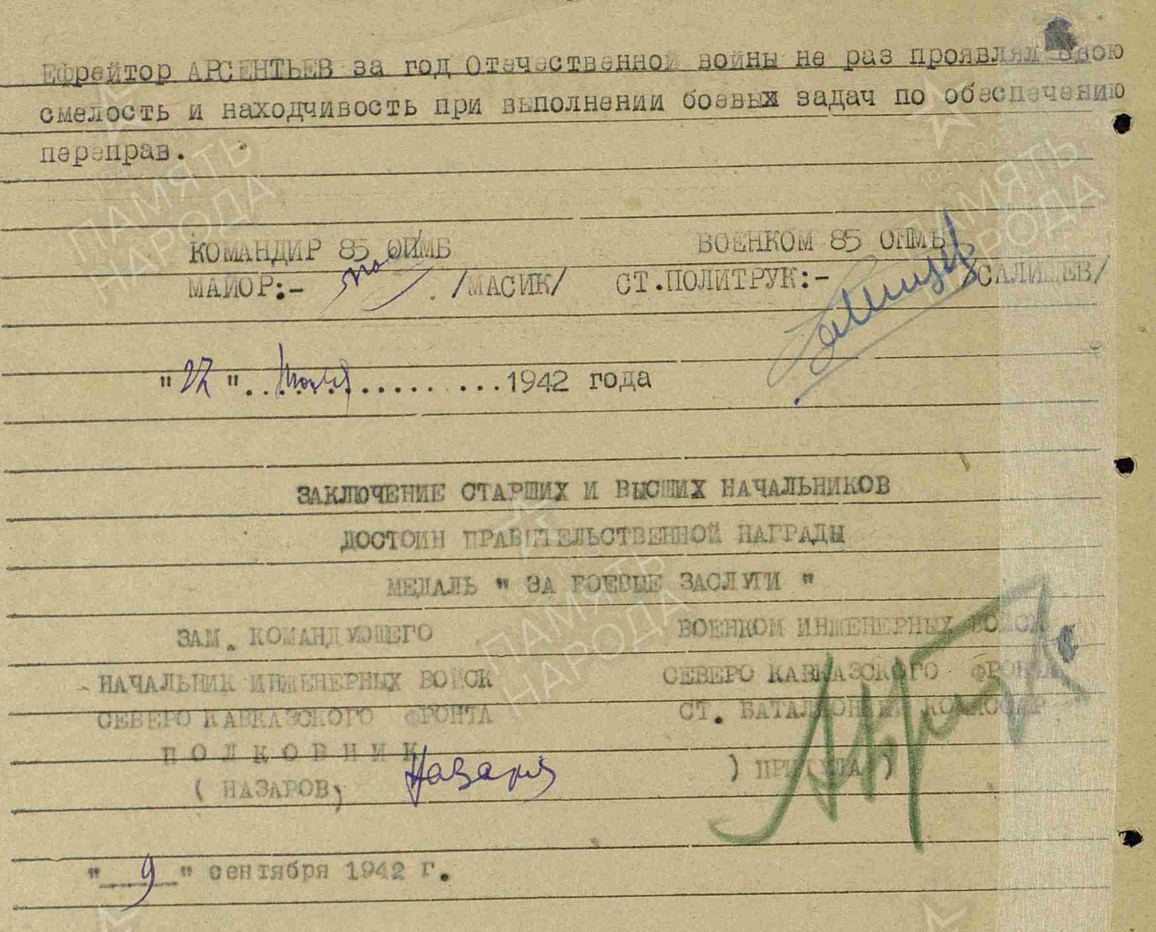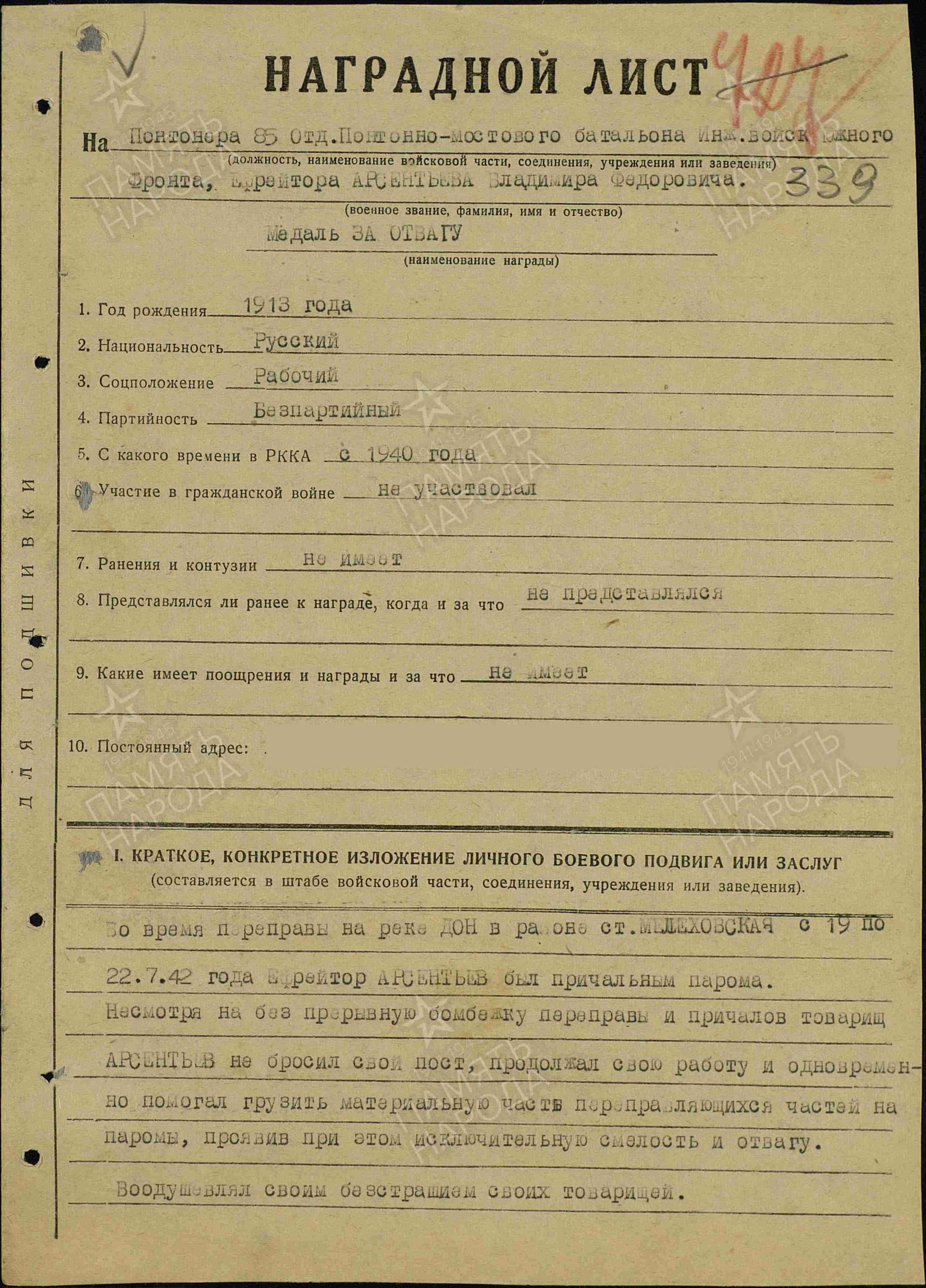 АРСЕНТЬЕВ Владимир Фёдорович, 1913, д. Старое Муллино. Мобилизован Ленинским РВК г. Казань в 1940. Член ВКП(б). Ст. сержант, понтонёр 85 отд. понтонно-мостового батальона Управления инженерных войск Южного фронта, Черноморской группы Закавказского фронта, 9 гв. СК Белорусского фронта, 69 А 1 БелФ. Участник войны с июня 1941, обороны Кавказа, форсирования Днепра и Одера. Награждён медалями «За боевые заслуги», «За оборону Кавказа», орденами Красной Звезды, Отечественной войны 2 ст. (1945).