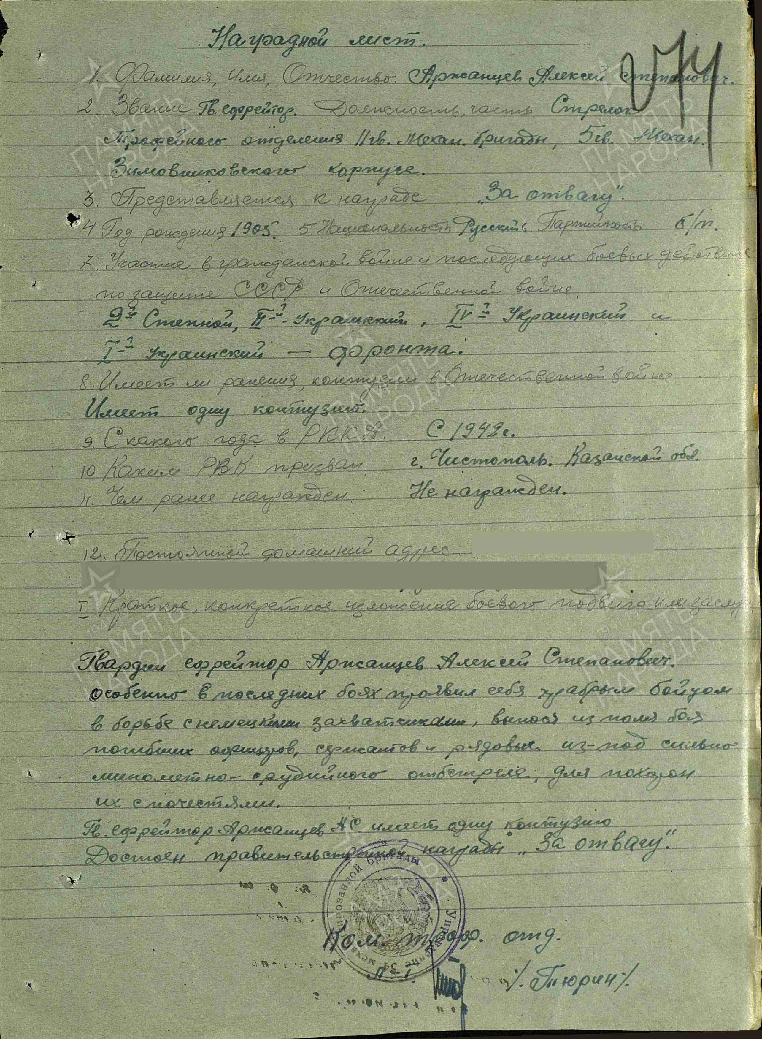 Алексей Степанович Аржанцев родился в 1905 г. в г.Чистополе Татарской АССР. В 1942 г. призван в ряды Красной Армии Чистопольским районным военным комиссариатом. Служил в звании гвардии ефрейтор в должности стрелка Трофейного отделения 11 гв. Механической бригады 5 Гв. Механ.Зимовицковского корпуса. Был ранен, контужен.