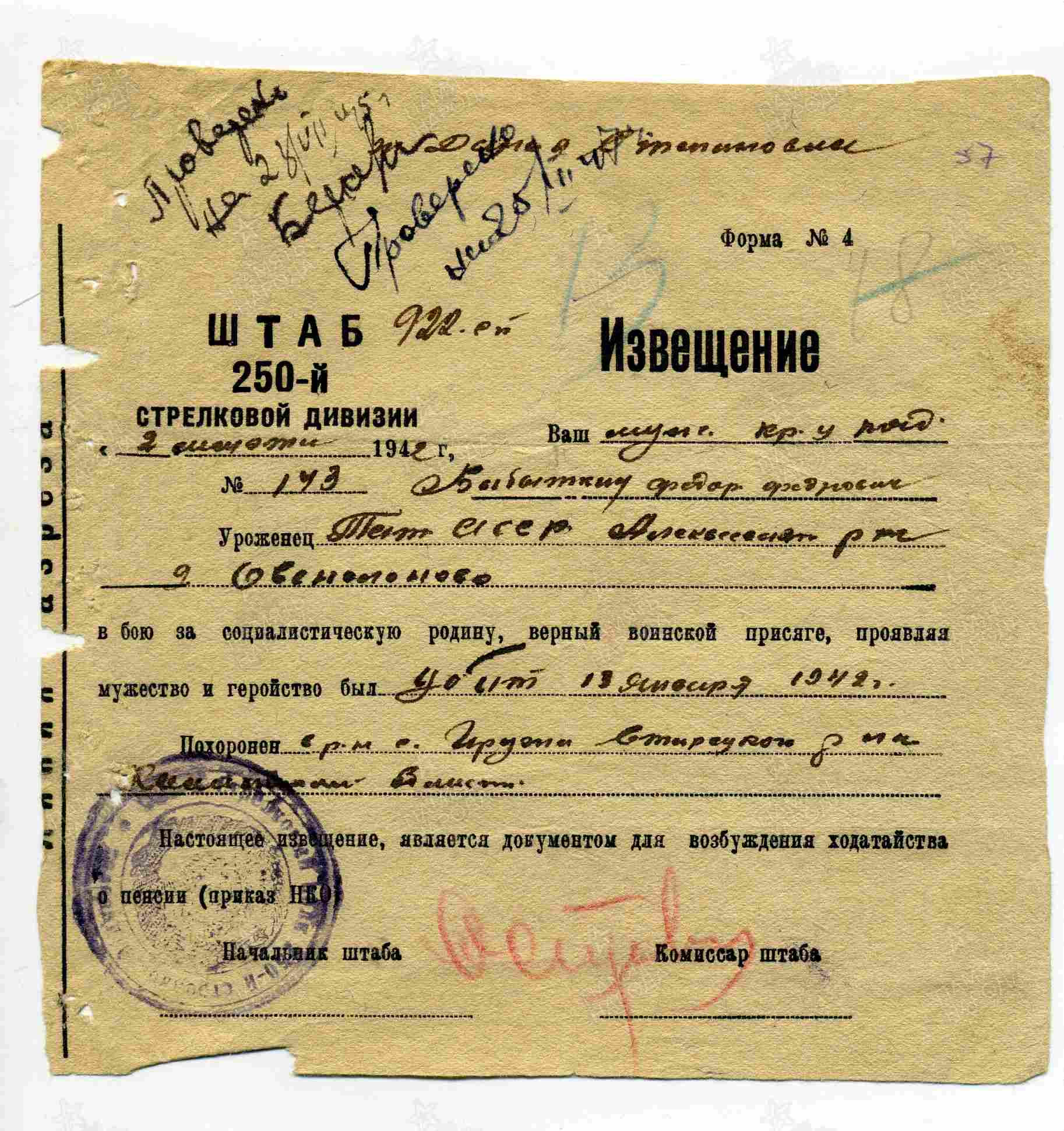 БАБЫКИН Фёдор Фёдорович, 1903, с. Остолопово. Мобилизован Алексеевским РВК 26 сент. 1941. Красноармеец, 922 СП 250 СД 31 А Калининского фронта. Убит 13 янв. 1942 близ с. Иружи, Старицкий р-н, Калининская (Тверская) обл.