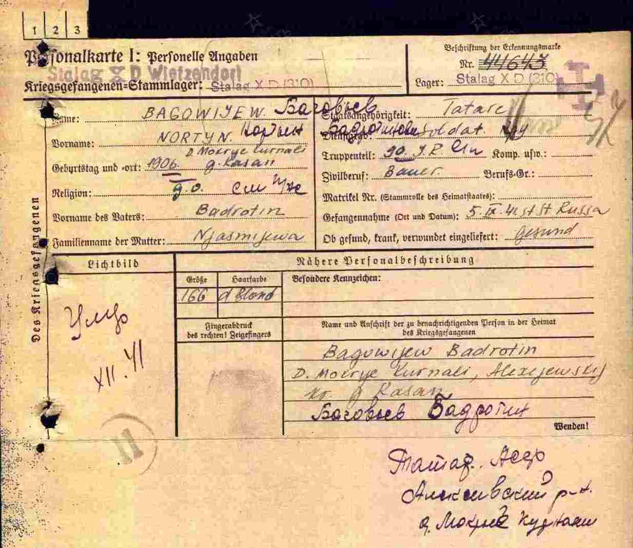 БАГАВЕЕВ Нурутдин Бадрутдинович, 1906, с. Мокрые Курнали. Мобилизован Алексеевским РВК. Красноармеец. Попал в плен под г. Старая Русса 5 сент. 1941. Содержался в лагере XD (310), Витцендорф, Мюнстер, Северная Рейн-Вестфалия, Германия. Умер в дек. 1941.