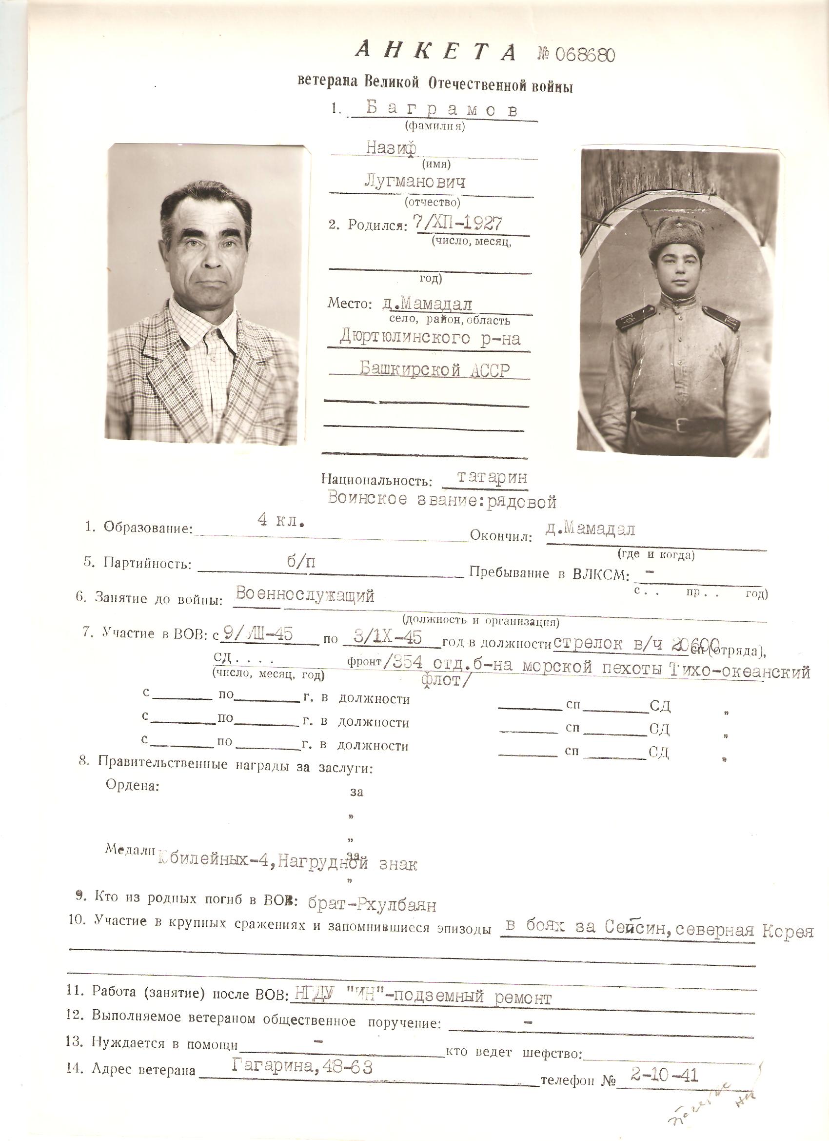 Призван 18.11.1944г. Дюртюлинским РВК, Башкирская АССР. В Великой Отечественной войне участвовал с августа по сентябрь 1945 года. Воинское звание красноармеец стрелок. Воинская часть 354 отдельный батальон морской пехоты Тихоокеанский флот.
