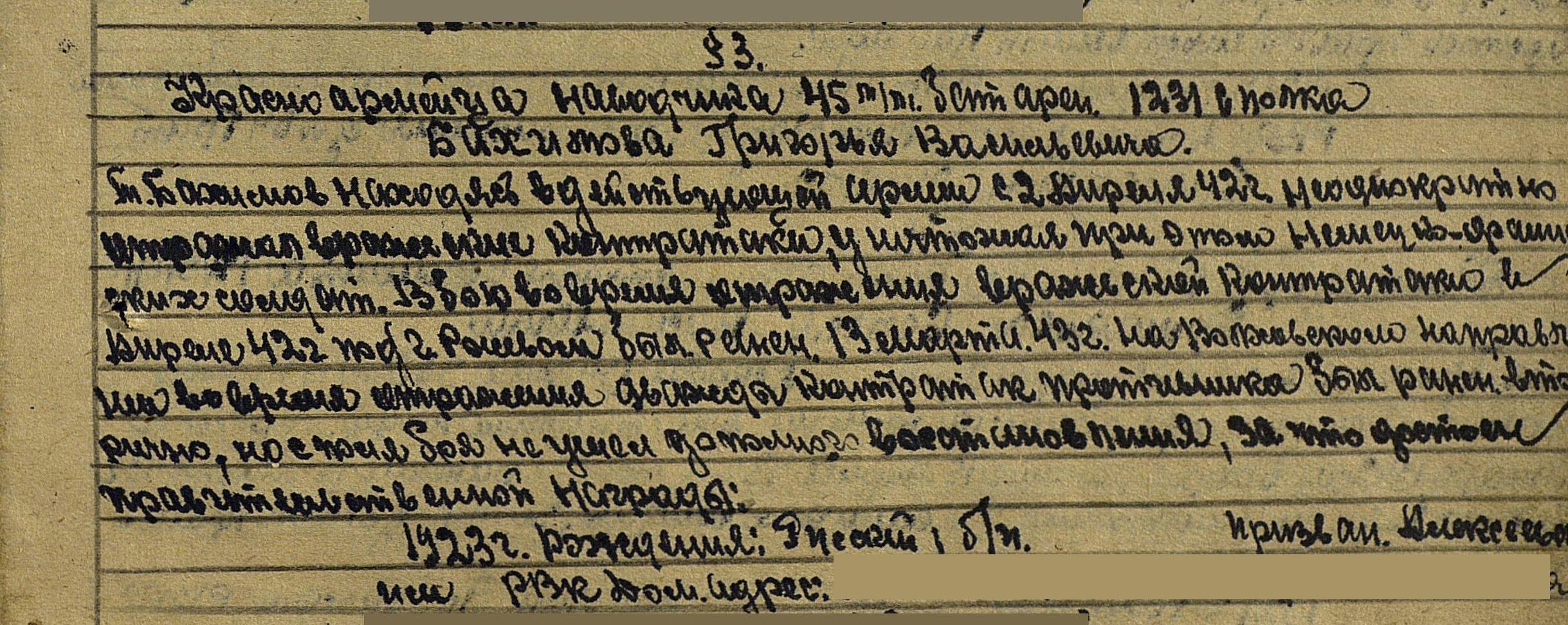БАХИМОВ Григорий Васильевич, 1923, с. Алексеевское. Мобилизован Алексеевским РВК в 1942 г. На фронте с апреля 1942 г., воевал на Калининском и Западном фронтах в составе 1231 СП 371 СД 30 и 31 А, красноармеец, наводчик 45мм пушки. В боях был дважды ранен: на Ржевском направлении в 1942 г. и под г. Холм в 1943 г. Награждён медалью "За отвагу" (1943), орденом Отечественной войны 2 ст. (1985).