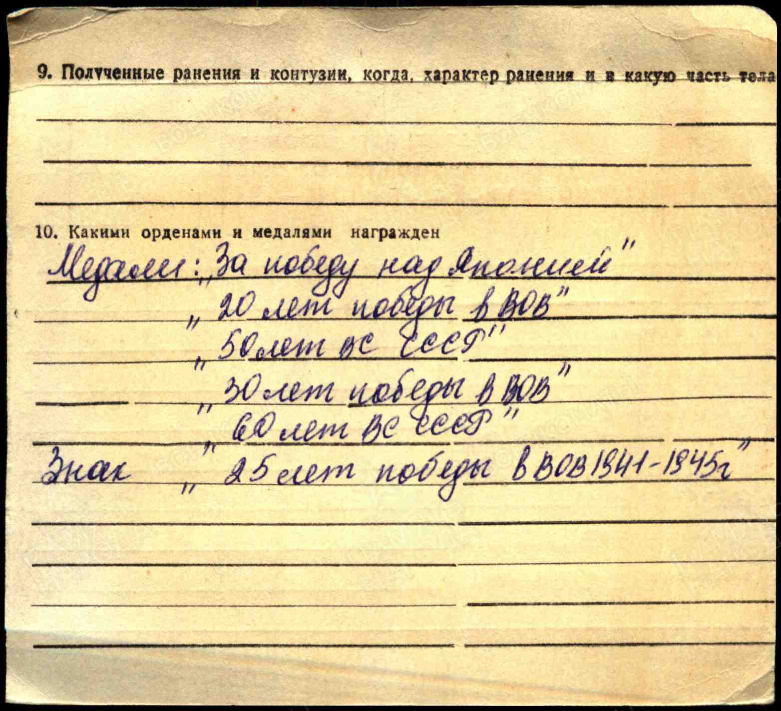 Призван 17.10.1940г.Сретенским РВК, Читинская область. В Великой Отечественной войне участвовал с августа по сентябрь 1945 года. Старшина штурманской боевой части эсминца «Ретивый» 27 береговая батарея БО Тихоокеанский флот. Дата окончания службы: 25.05.1947г.