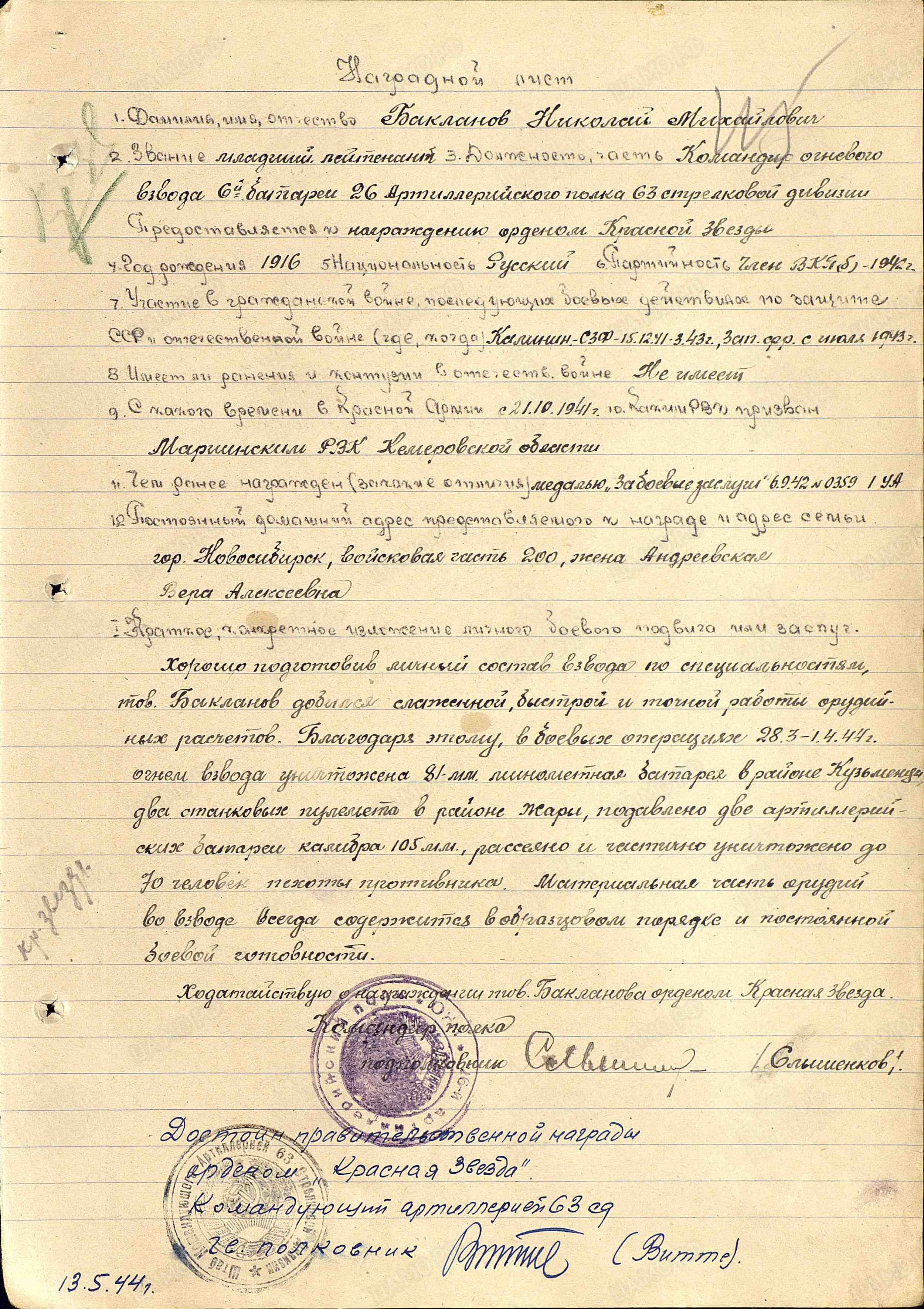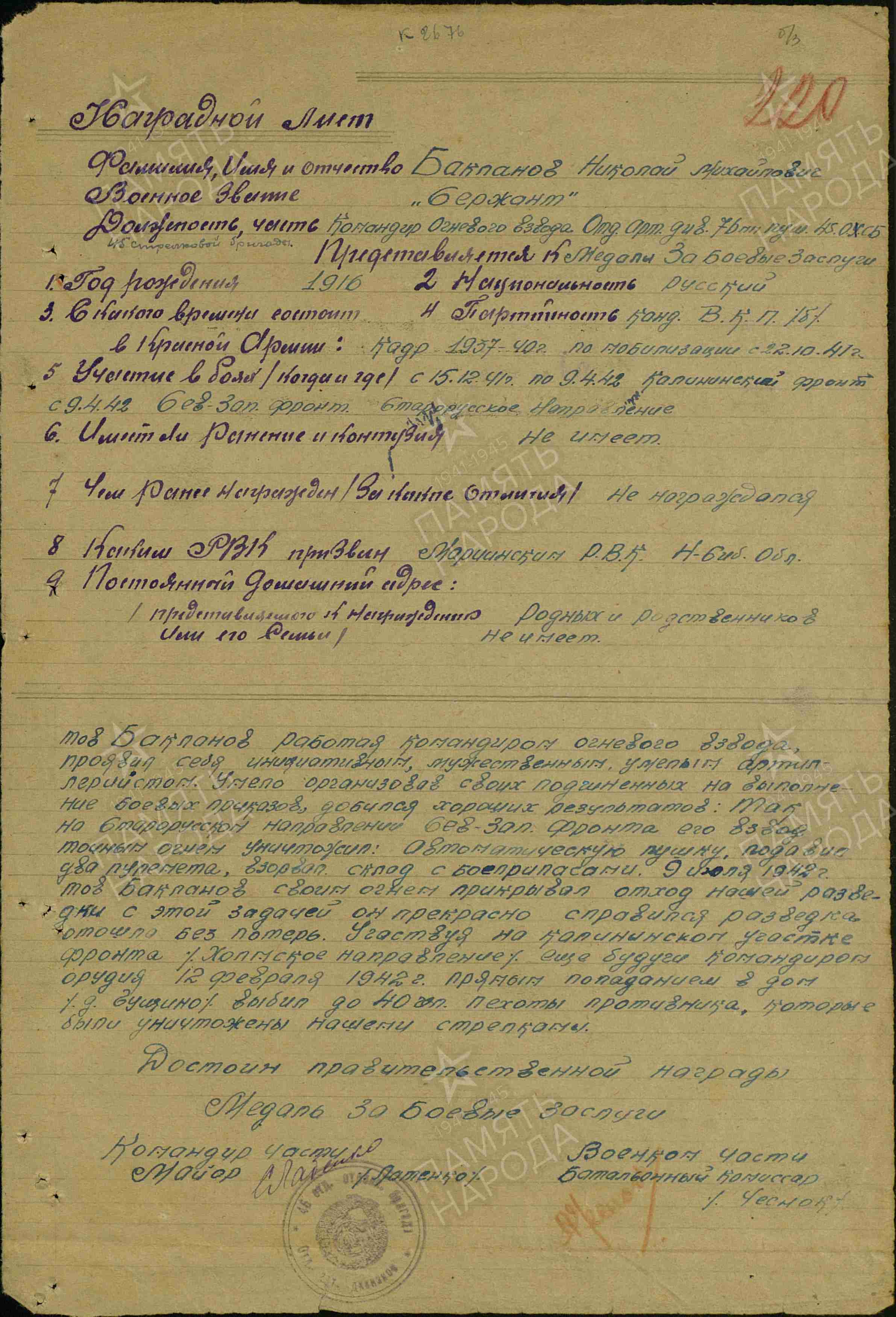 БАКЛАНОВ Николай Михайлович, 1916, хут. Малые Полянки (Бутырки). В РККА с 1937 по 1940, призван Чистопольским РВК. Мобилизован 21 окт. 1941 Мариинским РВК Новосибирской обл. Воевал на Калининском, Северо-Западном, Западном, 3 Белорусском фронте в составе 3 УдА/ 1 УдА/ 21 А/ 33 А/ 49 А/ 5 А. Член ВКП(б). Сержант/ мл. лейтенант, ком. огневого взвода отд. арт. дивизиона 76 мм пушек 45 СБр/ лейтенант, ком. огневзвода 26 АП 63 СД. Участник освобождения Смоленщины, Белоруссии, Прибалтики. Награждён медалью «За боевые заслуги», орденом Красной Звезды. Погиб 25 окт. 1944 при вторжении в Вост. Пруссию, м. Слипины. Вероятное место захоронения – братская могила в г. Кибартай, Мариямпольский уезд, Литва.