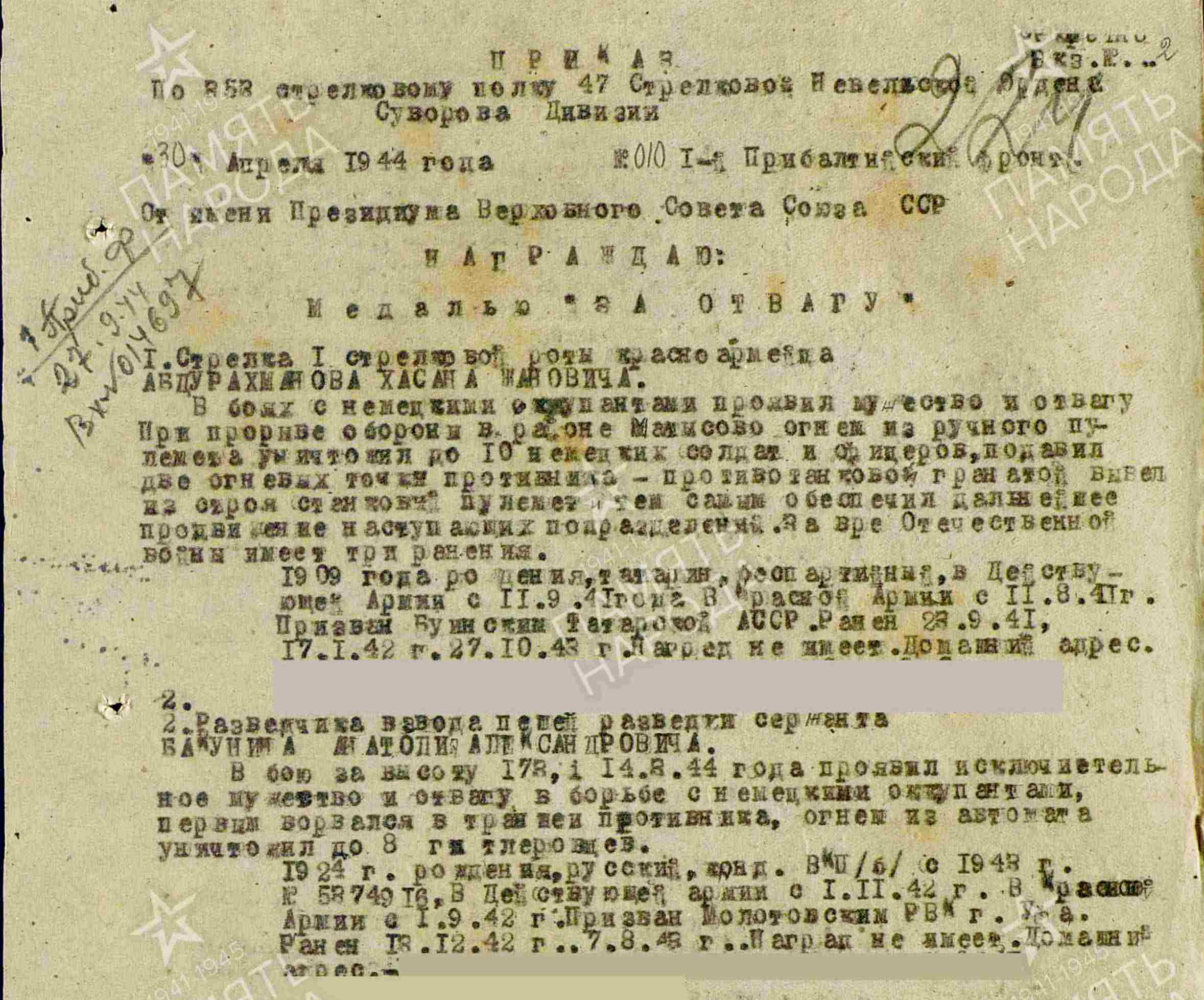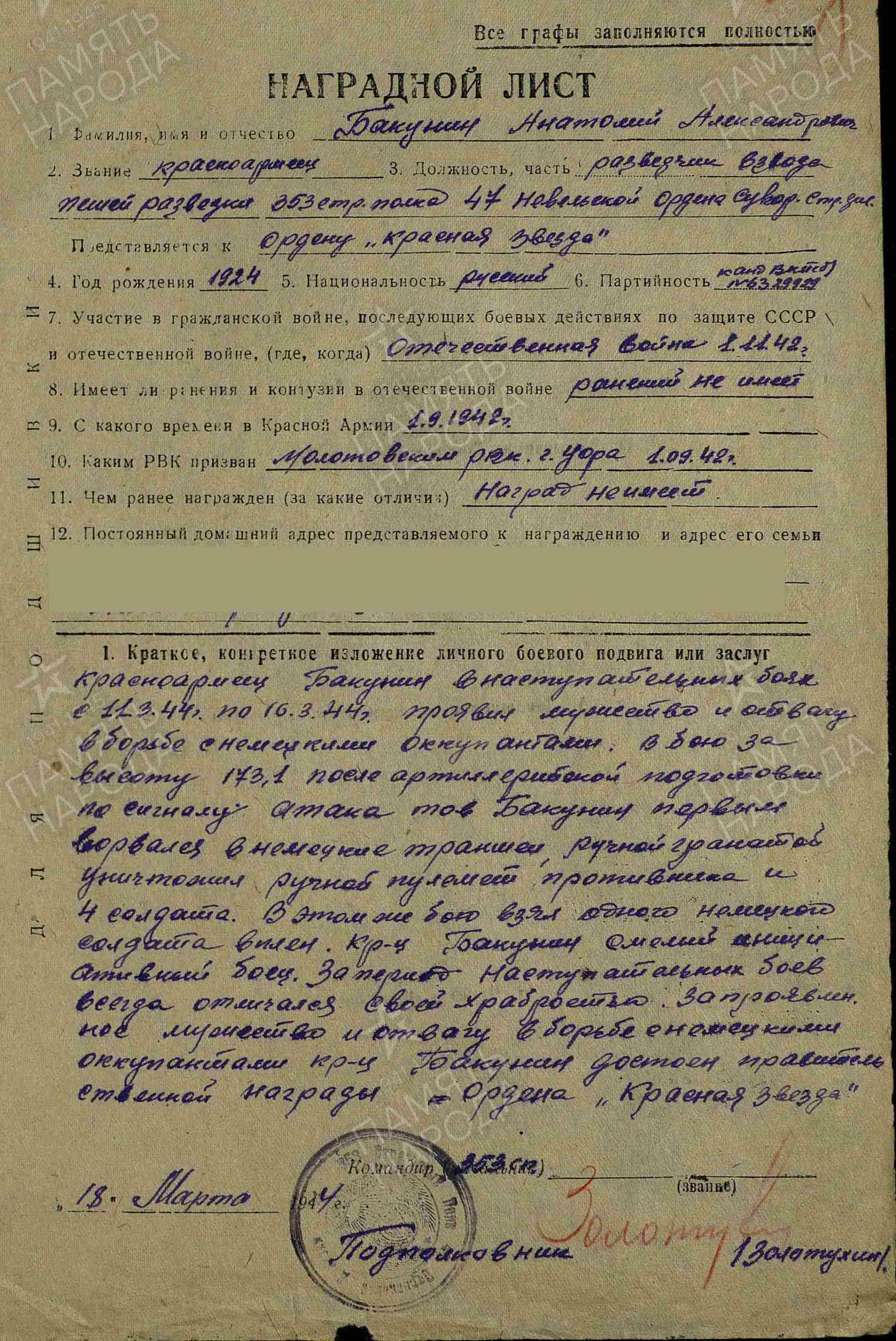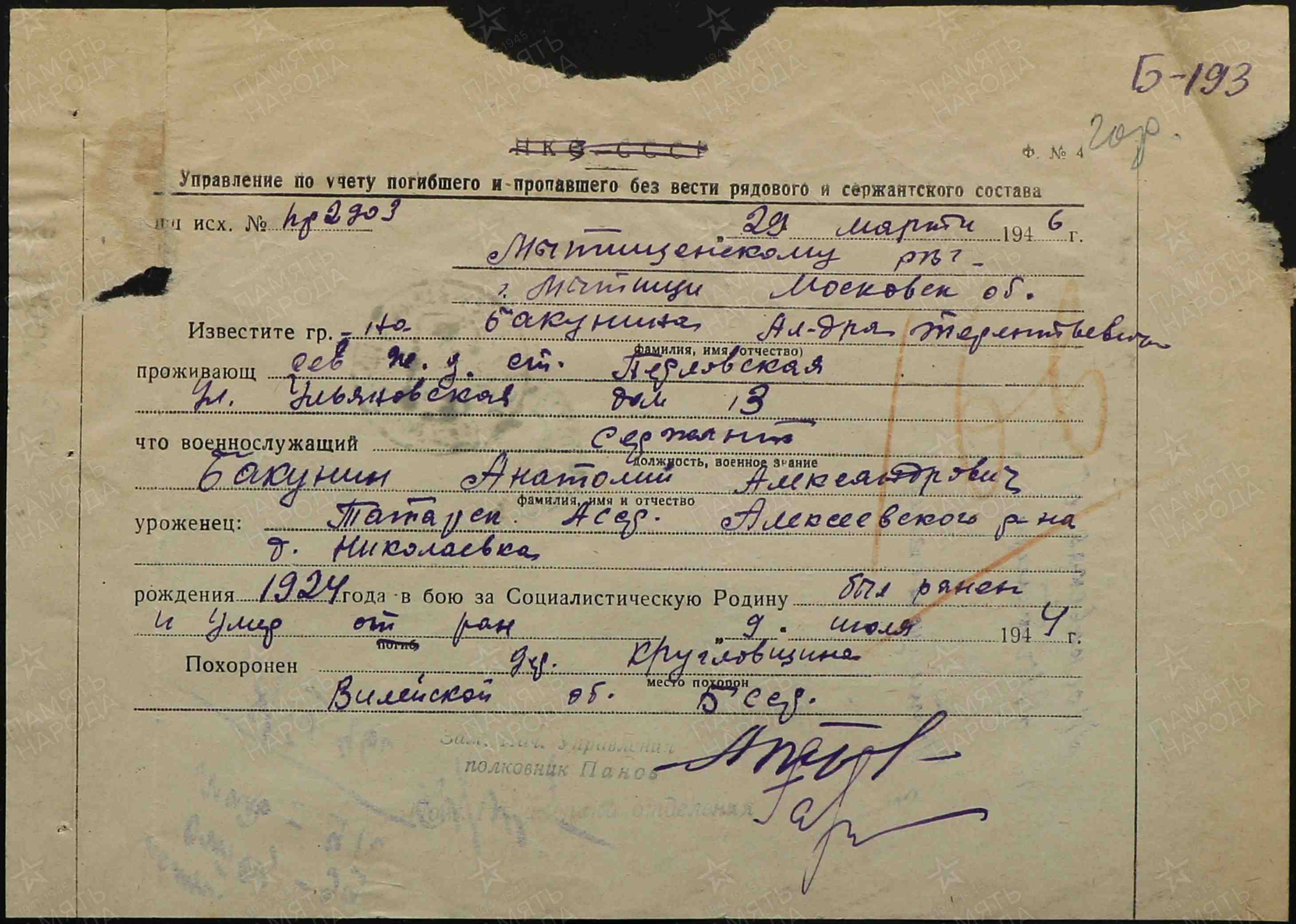 БАКУНИН Анатолий Александрович, 1924, д. Николаевка. Мобилизован 3 авг. 1942 Молотовским РВК г. Уфа, БашАССР. Член ВЛКСМ. В действующей армии с 1 нояб. 1942. Сержант, разведчик взвода пешей разведки 353 СП 47 СД 4 УдА и 6 гв. А Калининского и 1 Прибалт. Фронта. Ранен 18 дек. 1942, 7 авг. 1943. 11-16 марта 1944, в наступательных боях за выс. 173,1, первым ворвался в траншеи противника, гранатой уничтожил ручной пулемёт и четырёх солдат, одного взял в плен, огнём из автомата застрелил до восьми гитлеровцев. Награждён медалью «За отвагу», орденом Славы 3 ст. 8 июля 1944 тяжело ранен пулей в живот и правую ягодицу. Умер в 215 ОМСБ 166 СД, д. Кругловщизна, Браславский уезд, Вилейская обл., БелССР. Место захоронения – д. Магуны, вол. Рымшаны (Римшенай), ЛитССР.