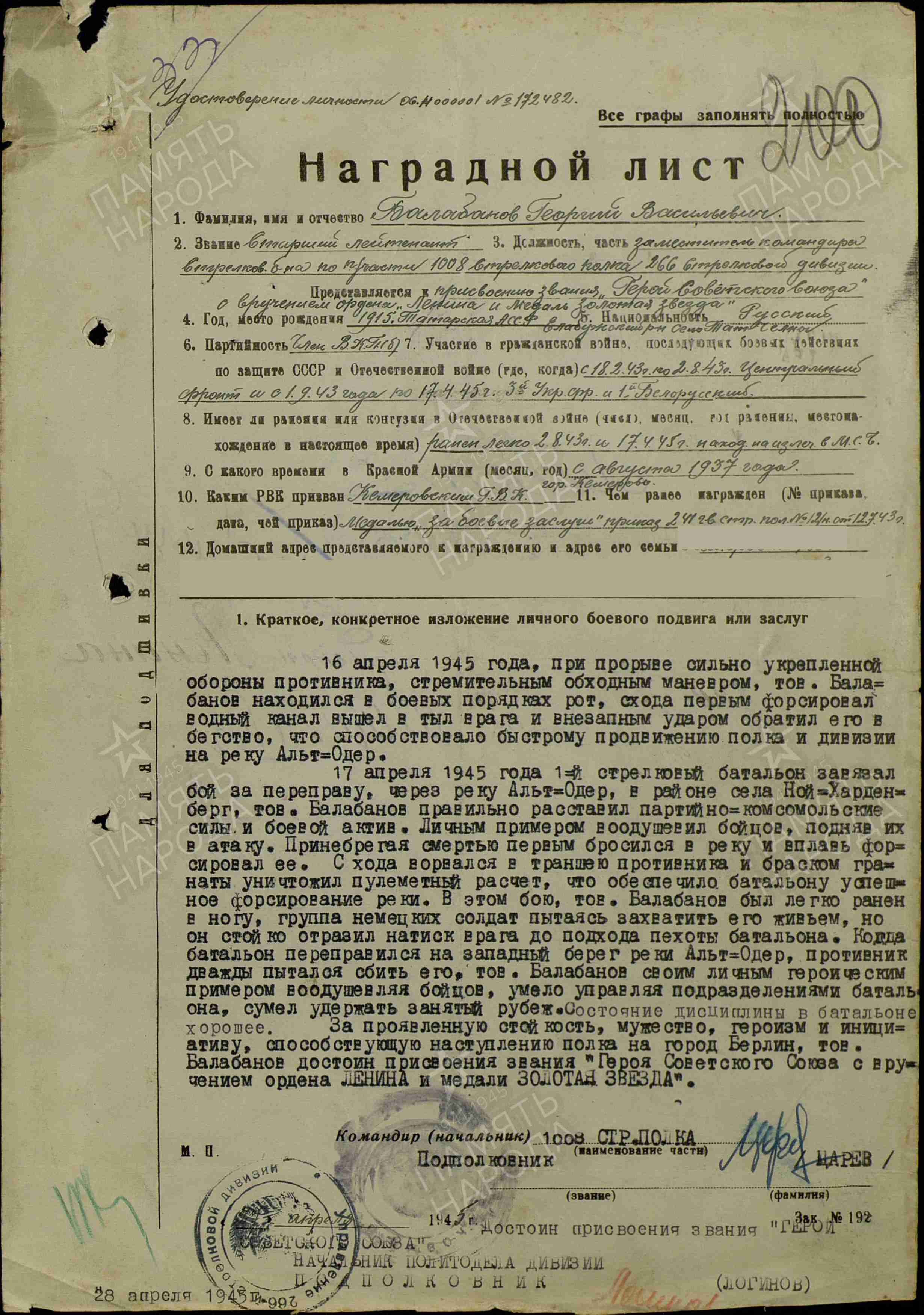 Родился 17.04.1915 г., Татарская АССР, Бондюжский район, село Татарские Челны. Мобилизован Кемеровский горвоенкоматом в 1937 г. Старший лейтенант, заместитель командира 6 стрелкового батальона по политчасти, 1008 стрелковый полк; капитан; майор; подполковник. В апреле 1945 года представлен к награждению званием Героя Советского Союза за героизм и мужество во время боев за переправу через р.Альт-Одер, но был удостоен ордена Красного Знамени (25.07.1945).