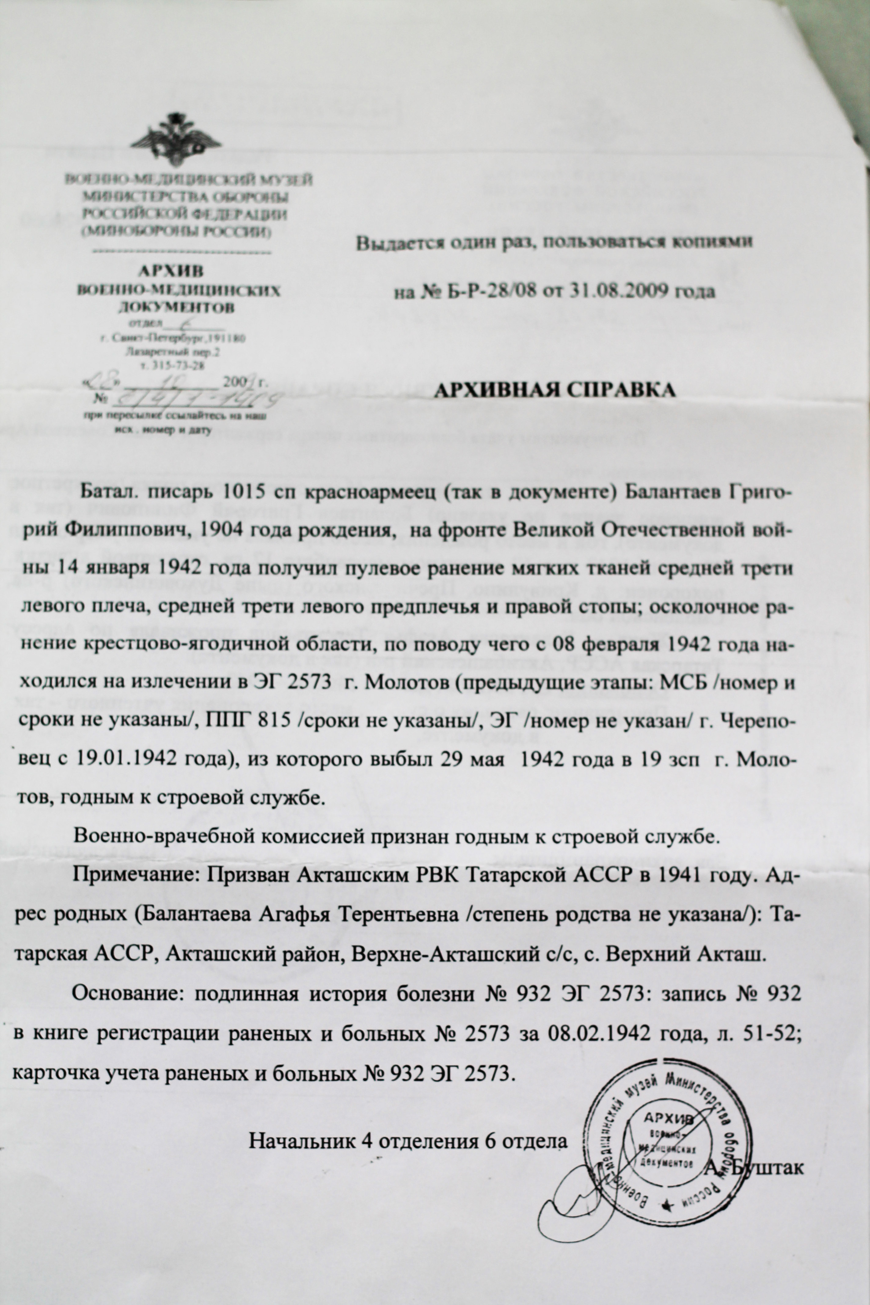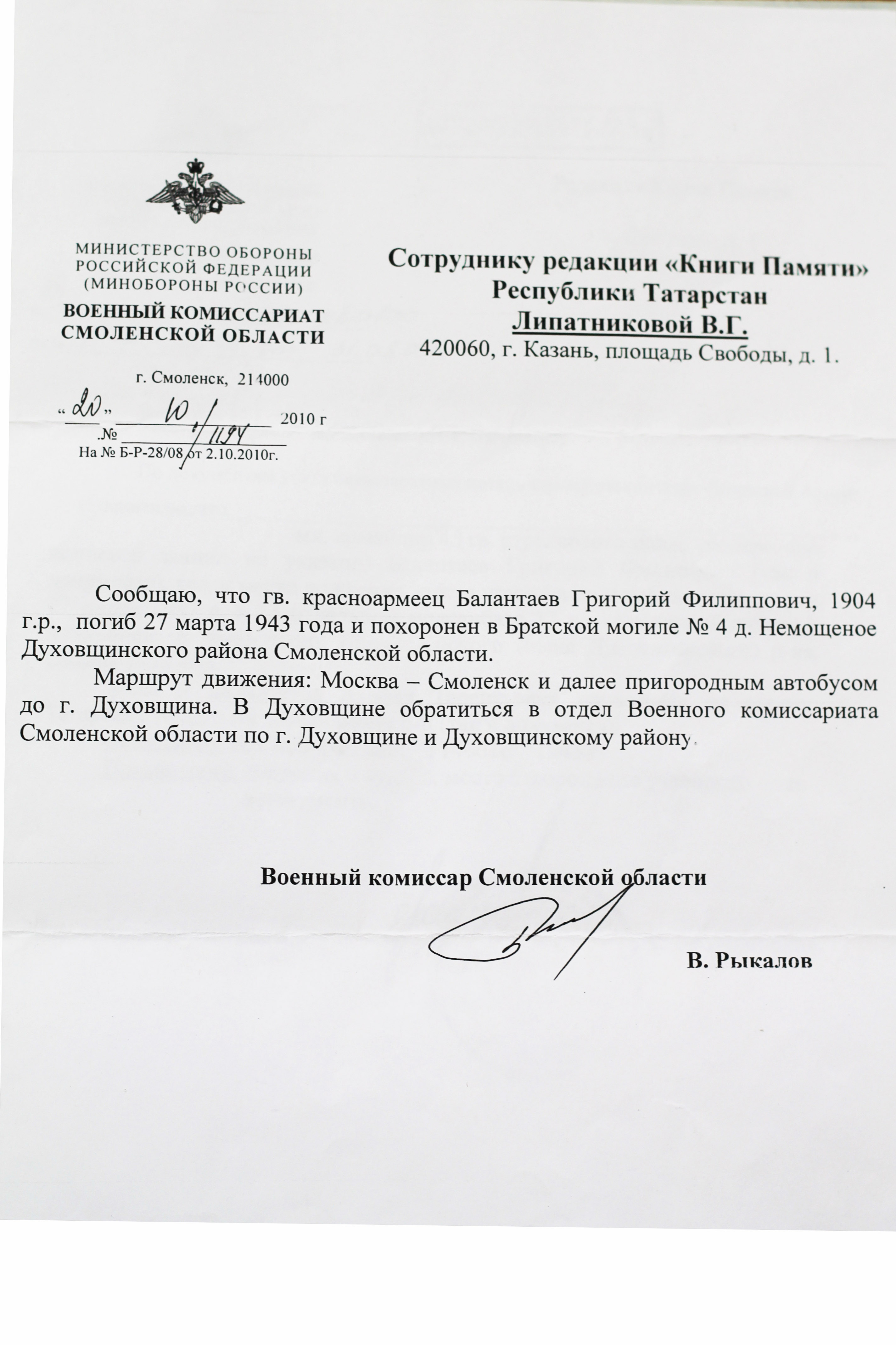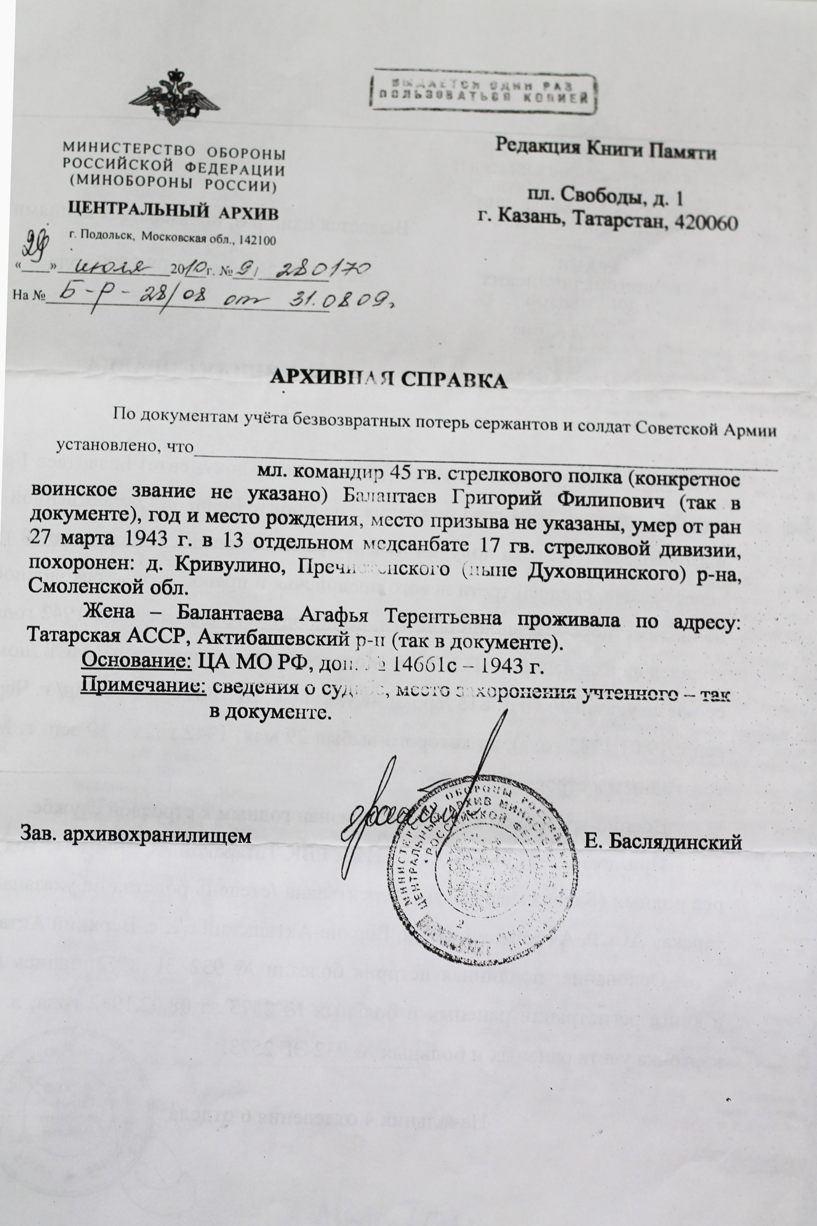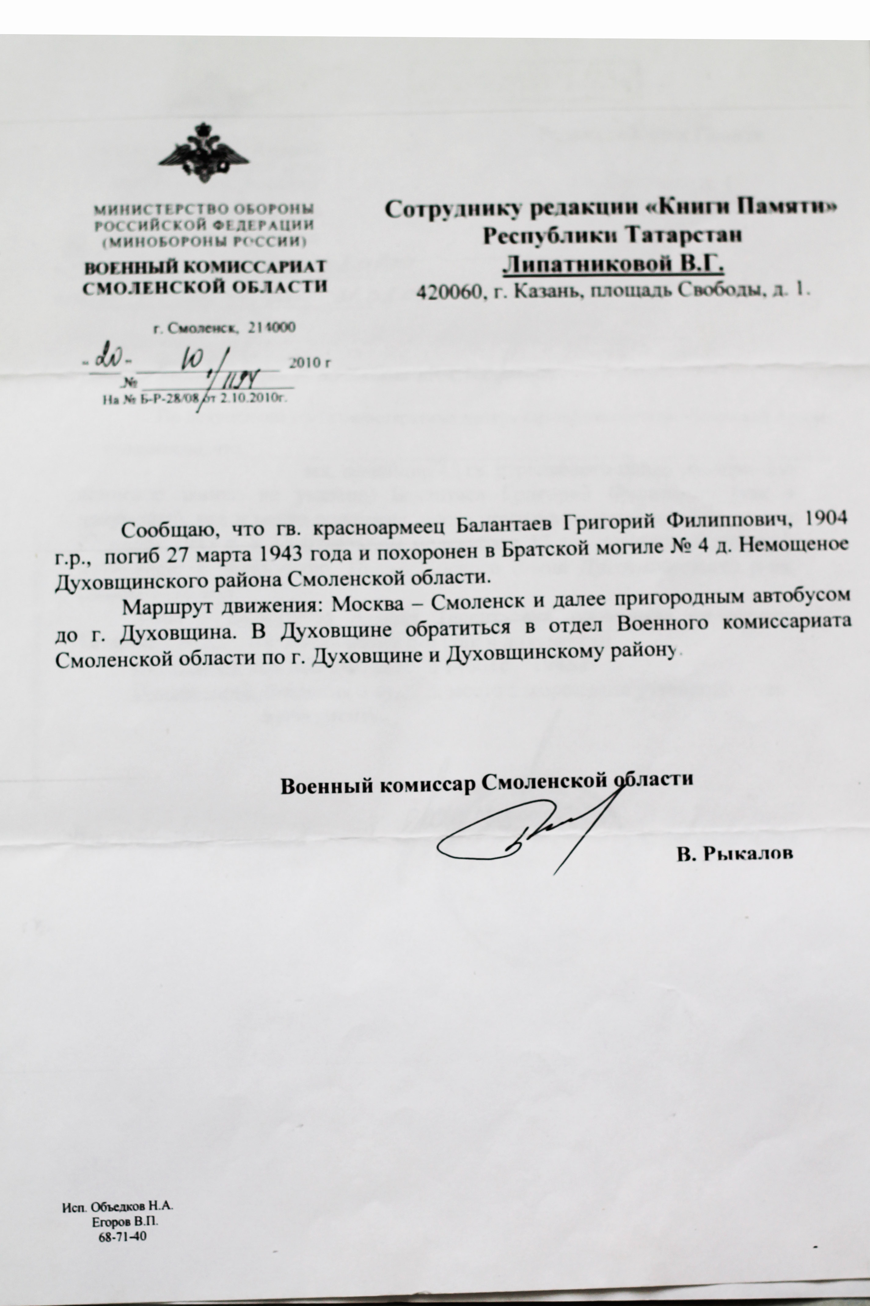 Наш дед и прадед, Балантаев Григорий Филиппович (27.01.1904г.р.) был призван на войну 07 сентября 1941г. Акташским РВК. Красноармеец-пулемётчик, батальонный писарь1015 сп, младший командир 45 гв.стрелкового полка умер от множественных ранений 27.03.1943г. в военно-полевом госпитале после тяжелых боёв со 2 -12.12.1942г. под Смоленском, в районе деревни Сельцово-Спиридово. Согласно приказу 48 Гв. СП 17 Гв. СД 41 А пулемётчик Балантанев Г.Ф. лично истребил в том бою более 30 фашистов, в упор расстрелял 16 гитлеровцев и 1 офицера, тем самым помог отбить 3 атаки противника. Указом Президиума Верховного Совета ССР от 16.12.1942.г. за мужество и геройство был представлен к награде медалью "За боевые заслуги", получить которую не успел. Похоронен в д. Криулино Пречистенского (ныне Духовщинского) района Смоленской области, перезахоронен в Братской могиле №4 с.Немощное Духовщинского района Смоленской области.