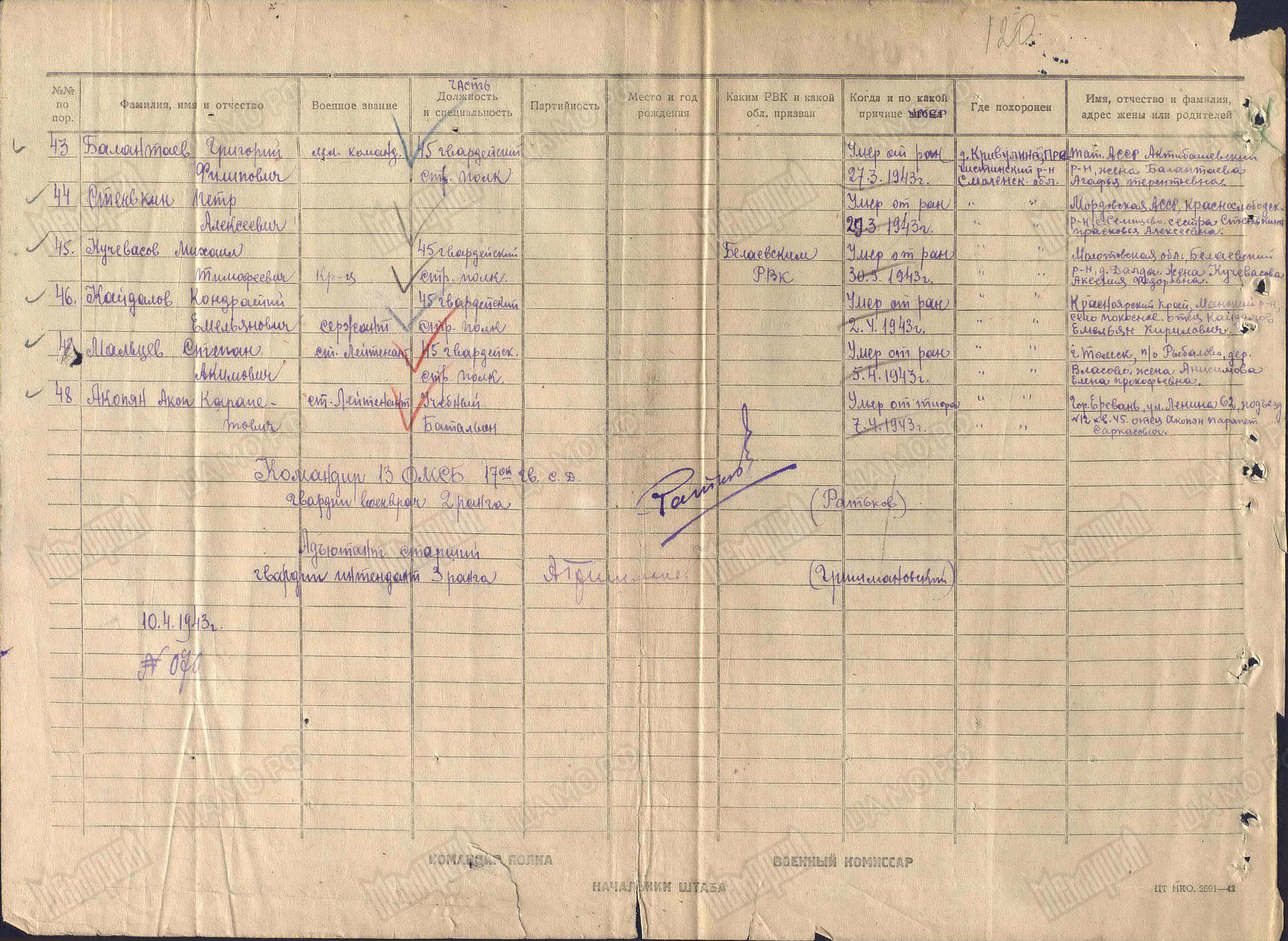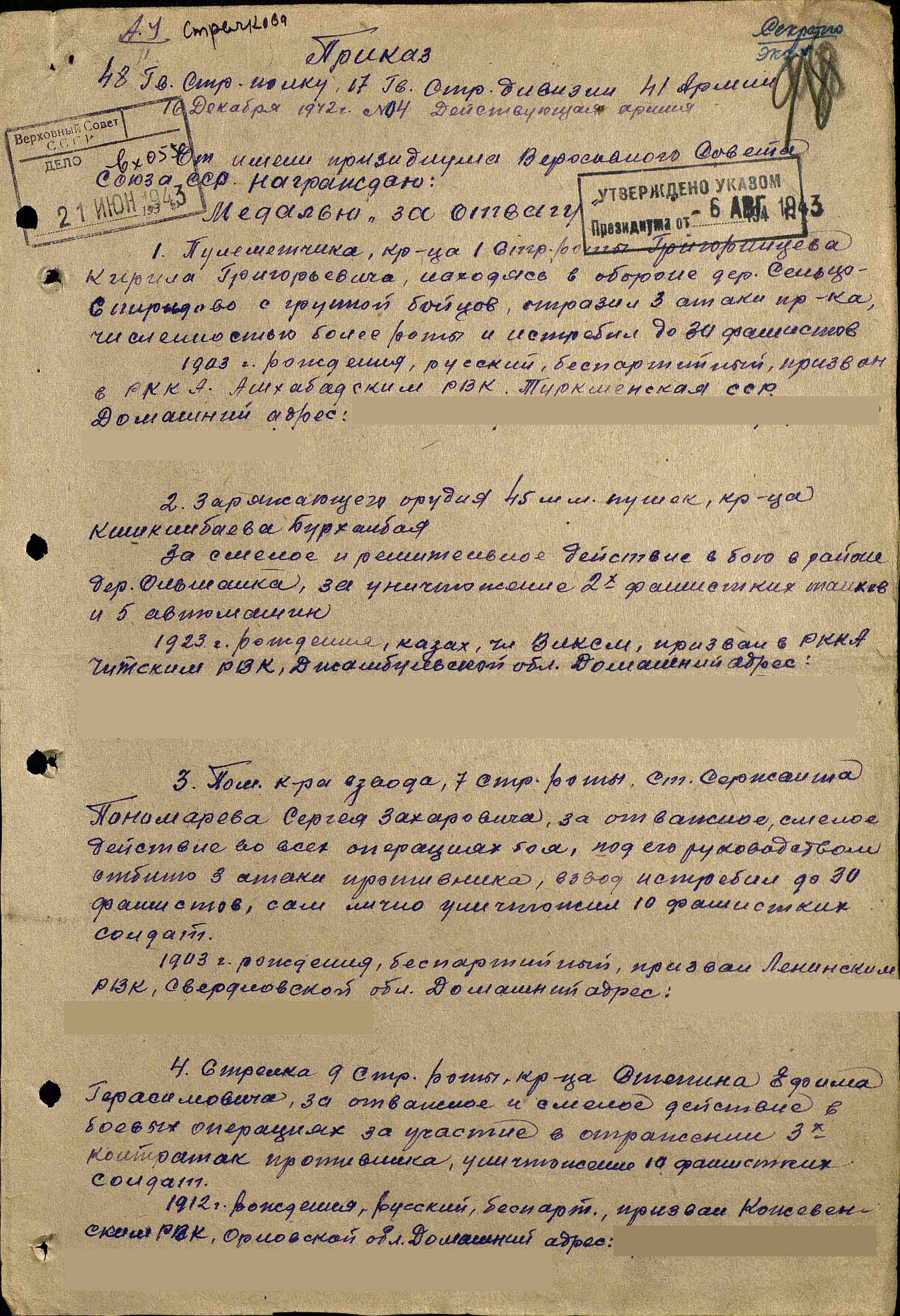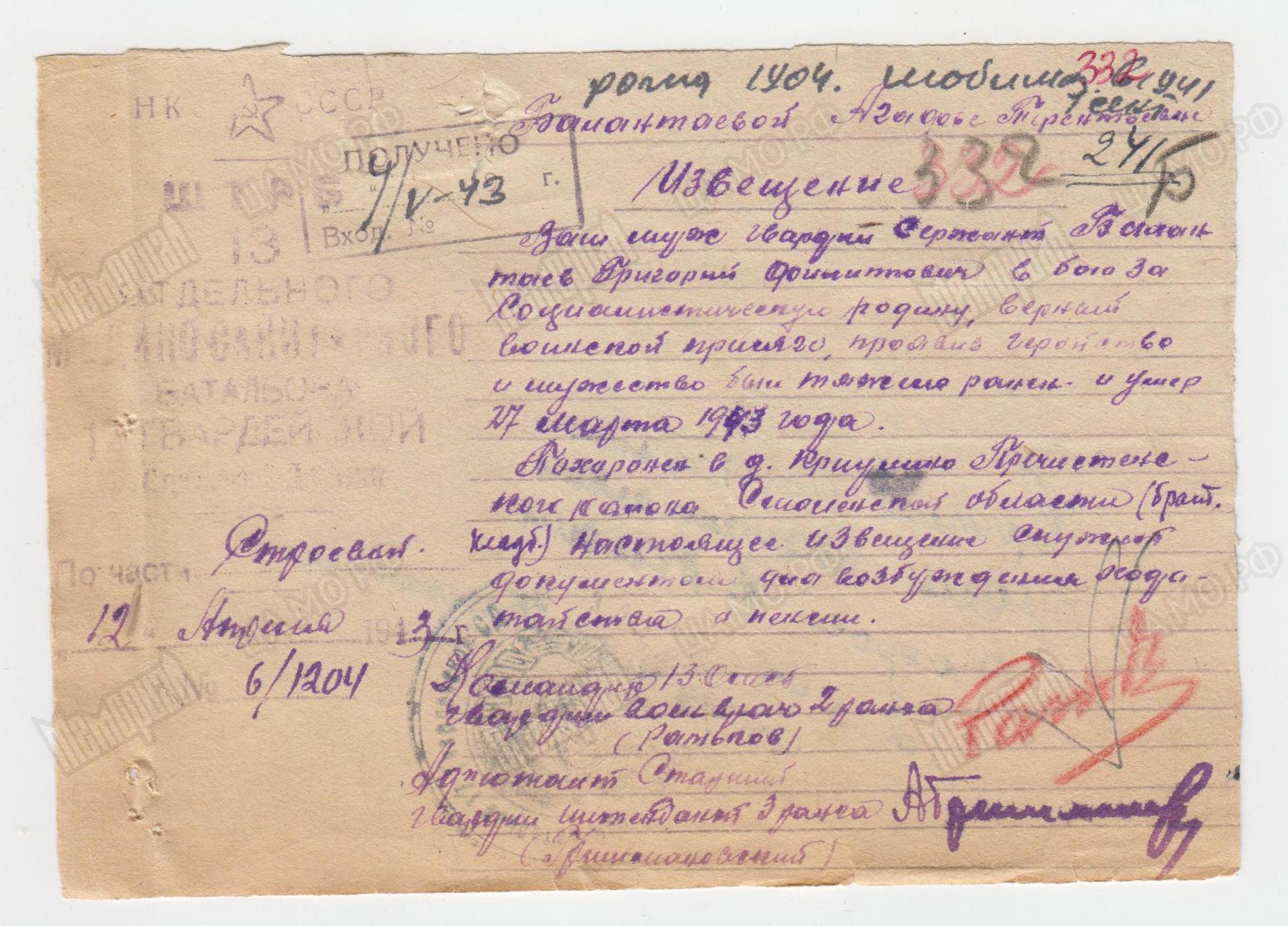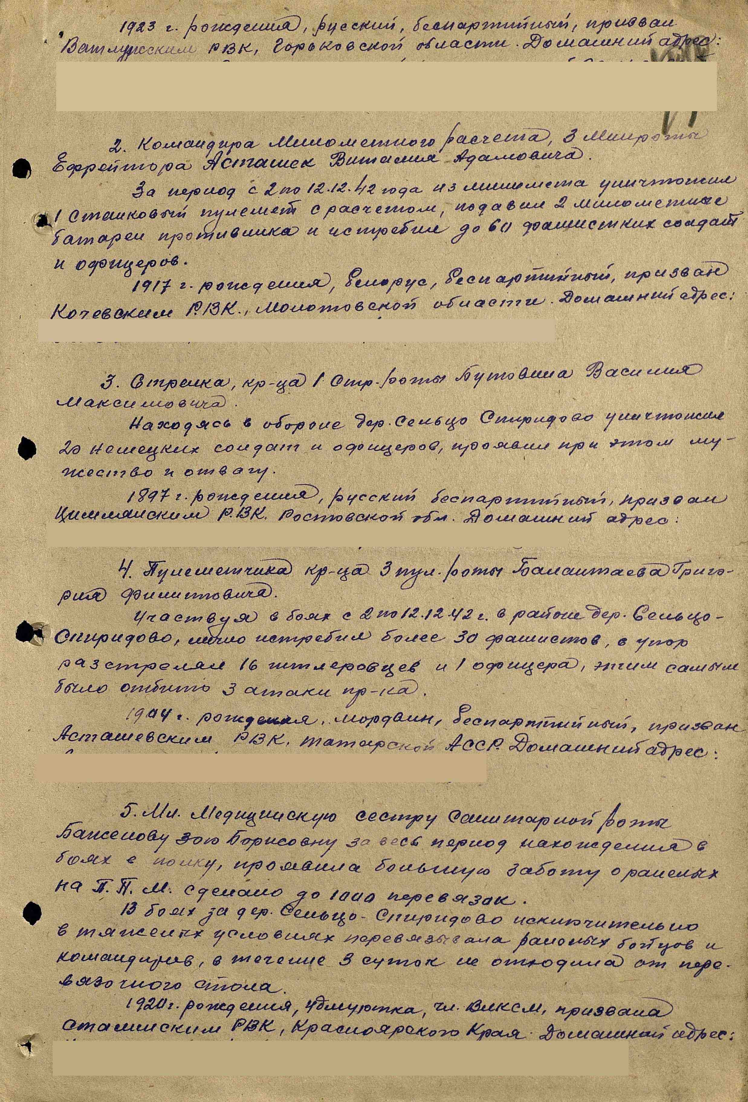 Наш дед и прадед, Балантаев Григорий Филиппович (27.01.1904г.р.) был призван на войну 07 сентября 1941г. Акташским РВК. Красноармеец-пулемётчик, батальонный писарь1015 сп, младший командир 45 гв.стрелкового полка умер от множественных ранений 27.03.1943г. в военно-полевом госпитале после тяжелых боёв со 2 -12.12.1942г. под Смоленском, в районе деревни Сельцово-Спиридово. Согласно приказу 48 Гв. СП 17 Гв. СД 41 А пулемётчик Балантанев Г.Ф. лично истребил в том бою более 30 фашистов, в упор расстрелял 16 гитлеровцев и 1 офицера, тем самым помог отбить 3 атаки противника. Указом Президиума Верховного Совета ССР от 16.12.1942.г. за мужество и геройство был представлен к награде медалью "За боевые заслуги", получить которую не успел. Похоронен в д. Криулино Пречистенского (ныне Духовщинского) района Смоленской области, перезахоронен в Братской могиле №4 с.Немощное Духовщинского района Смоленской области.