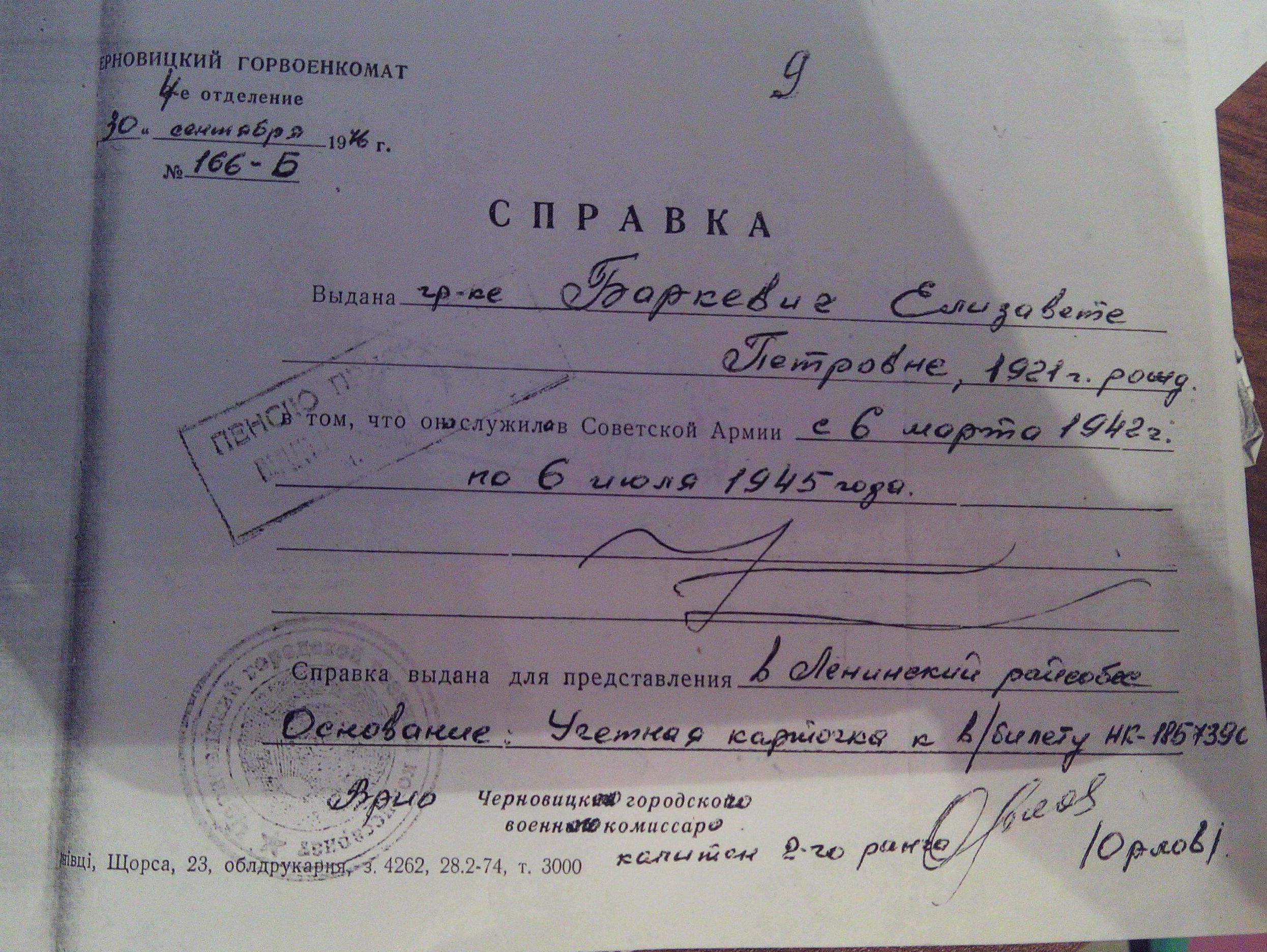 Елизавета Петровна Баркевич родилась 9 сентября 1921 года в городе Казань. В 12 лет родители отправили Елизавету работать в ателье, шить шляпки, поэтому ей пришлось продолжись обучение в вечерней школе. Её родители Петр Грачев и Анна Грачева были ремесленниками. Отец Елизаветы рано ушел из жизни. Занималась хореографией в танцевальном кружке Чарушиной Зинаиды Федоровны, её партнером был Ахмед Калимуллин - эта пара была лучшей в то время. Со своими выступлениями они ездили по городам, по деревням ,в том числе и в поселок Алексеевское. Эта пара выступала с 1938 по 1939 года, уже в 40-ых годах Елизавета отправилась в Крым. Такую путевку Елизавета получила с места работы, пешком она обошла почти весь Крым, посетила самые большие города полуострова. Елизавета Петровна уже в 14 лет была мастером женских головных уборов. Делала летние шляпки, теплые шапки на зиму. Этим она занималась до самой войны. До войны она жила у сестры на улице Карла Маркса д. 66 в городе Казань, а мама её Анна Грачёва переехала в с. Алексеевское . Елизавета Петровна даже представить себе не могла, что её возьмут воевать - это было неожиданностью. В 1941 была на окопах в Чувашии и уже в марте 1942 её призвали служить в армию. Отправили Елизавету Петровну оборонять Москву. И до самого 1945 она находила в Москве.