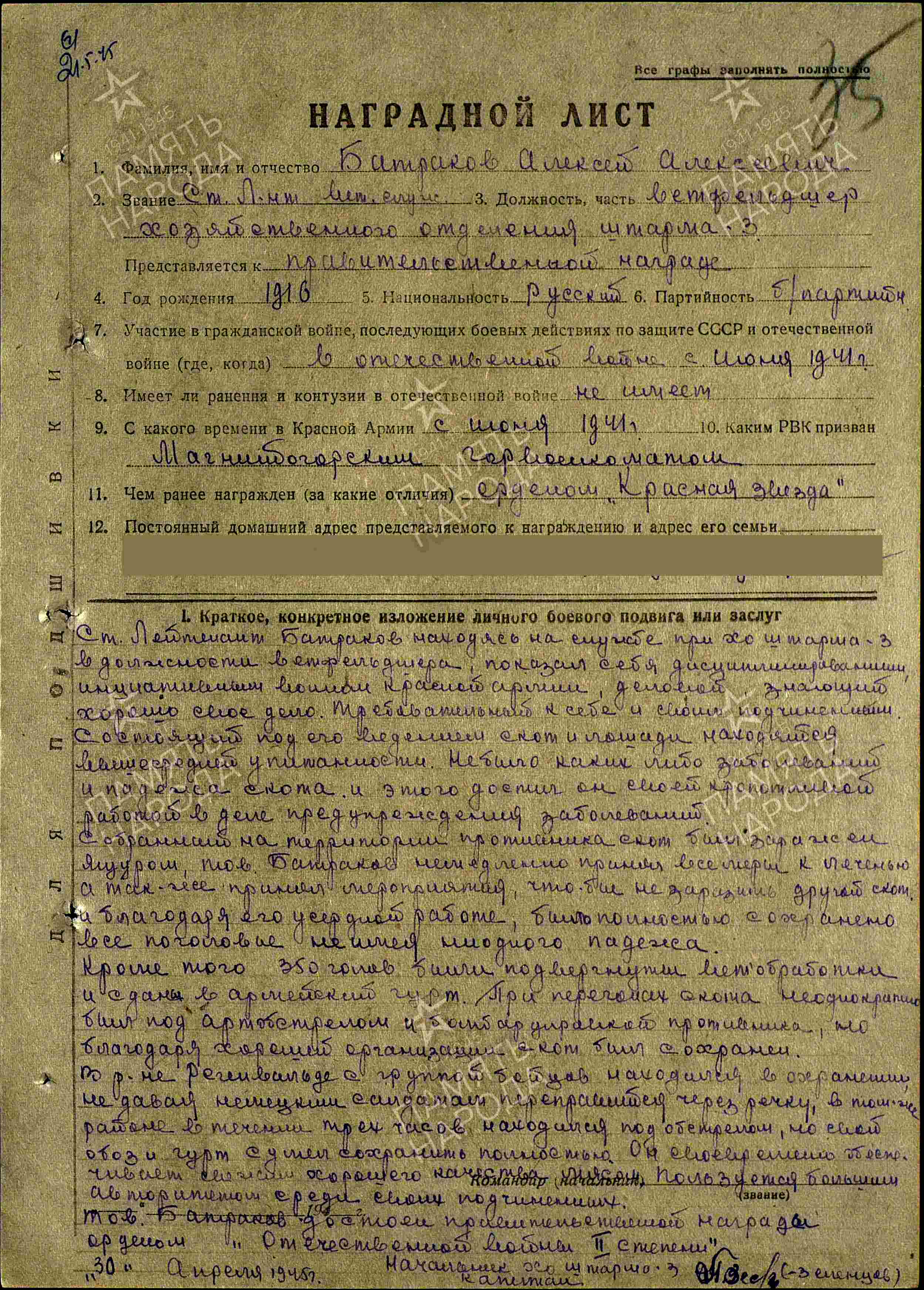 БАТРАКОВ Алексей Алексеевич, 1916, с. Алексеевское. Мобилизован Магнитогорским РВК Челябинской обл. 25 дек. 1941. Ст. лейтенант ветеринарной службы, полевая походная вет. лаборатория № 18, эвакуационный вет. лазарет № 945, ветеринарный фельдшер хоз. части штаба 3 УдА Калиниского, 2 Прибалт., 1 Белорусского фронтов. Награждён двумя орденами Красной Звезды, медалями «За освобождение Варшавы», «За взятие Берлина».