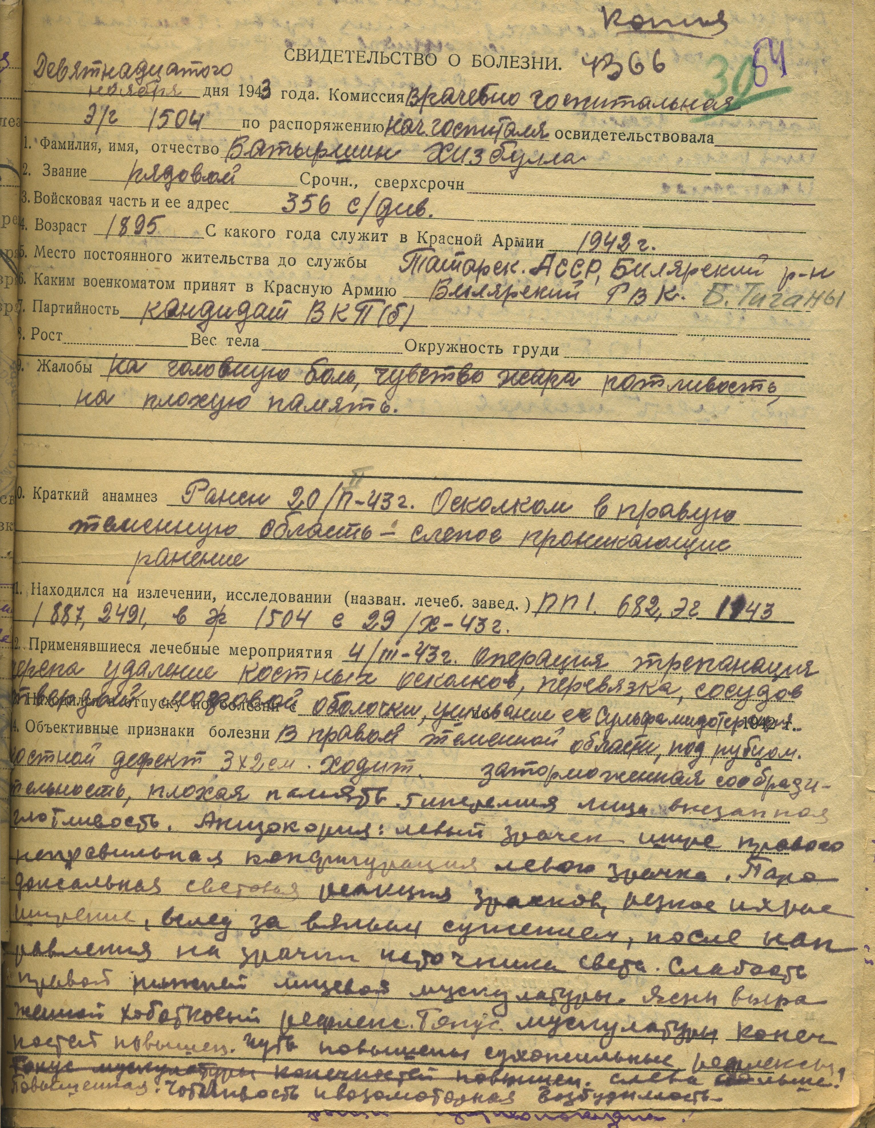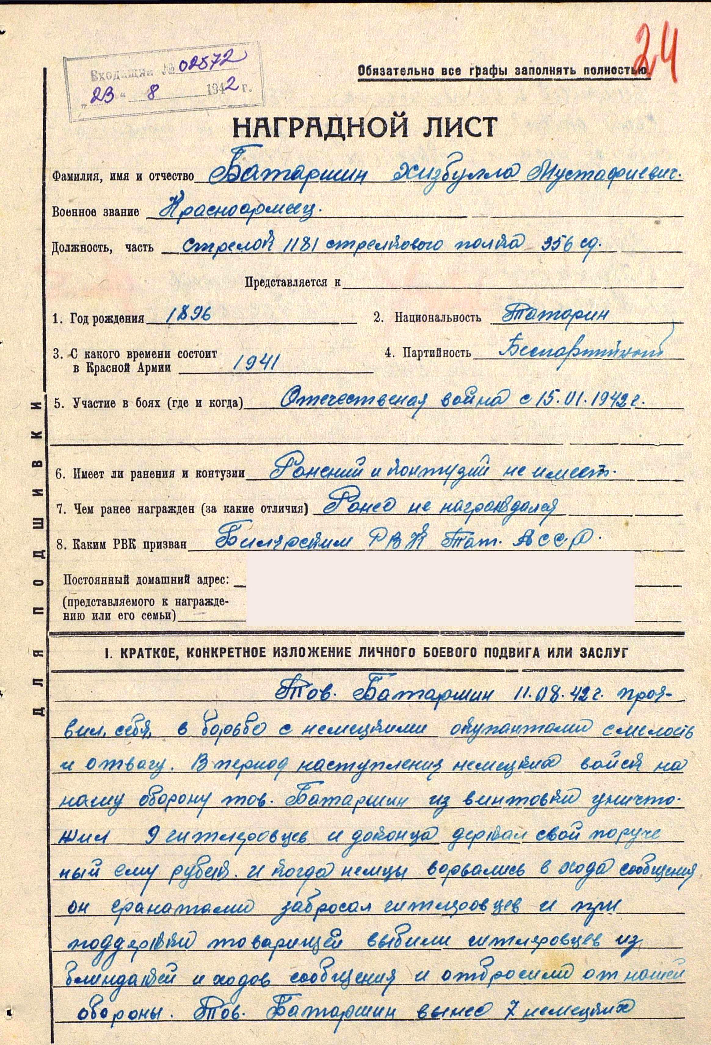 БАТЫРШИН Хизбулла Мустафиевич, 1896 г., с. Большие Тиганы. Сейчас эта семья носит фамилию МУСТАФИНы, поэтому Хизбулла Мустафович так же числится с списках фронтовиков села под этой фамилией. В Базе награждённых "Подвиг народа" занесён под фамилией БАТАРШИН. Мобилизован 15 января 1942 г. Билярским РВК. Красноармеец, стрелок 1181 стр. полка 356 стр. дивизии. Воевал на Западном фронте. Проявил себя героически в августе 1942 г. и был награждён медалью "За отвагу". 20 февраля 1943 г. был ранен осколком в правую теменную область - слепое осколочное ранение. 4 марта 1943 г. перенёс операцию по трепанации черепа, удаление костных осколков из раны. Проходил длительное лечение в ПЭП 682, ЭГ 1443, ЭГ 1887, ЭГ 2491, с 29 окт. 1943 г. в ЭГ 1504. Последствиями ранения были заторможенная сообразительность, плохая память, нарушение зрения и низкий тонус мускулатуры правой нижней части лица. 19 ноября 1943 г. был признан негодным на 6 месяцев с последующим переосвидетельствованием. По словам односельчан Мустафин-Батыршин Х.М., возвращаясь домой из госпиталя и будучи ослабленным, не дошёл до родного села несколько километров и замёрз. Похоронен в с. Большие Тиганы.