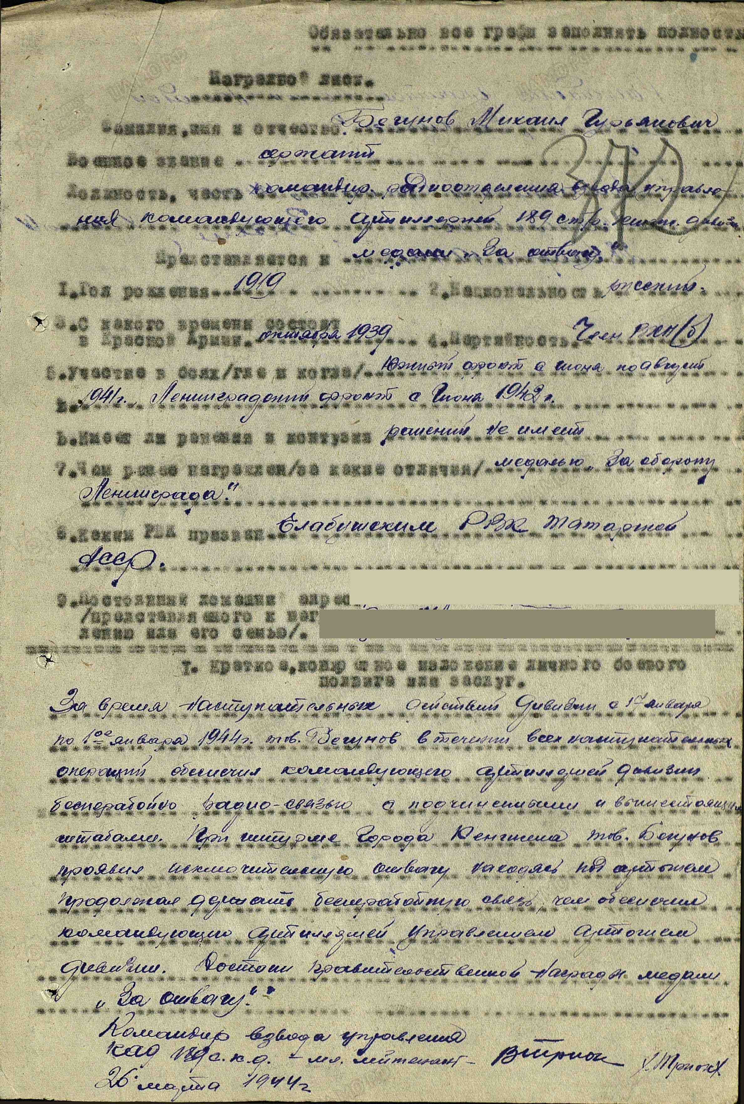 БЕГУНОВ Михаил Гурьянович, 1919, с. Билярск. Мобилизован Елабужским РВК в сентябре 1939 г. Сержант, командир радиоотделения взвода управления командующего артиллерией 189 СД. Воевал в июле-августе 1941 г. на Юго-Западном, с июня 1942 - на Ленинградском фронте. Награждён медалями "За оборону Ленинграда", "За отвагу" (1944), орденом Отечественной войны 2 ст. (1985). Проживал в г. Елабуга по адресу ул. Пристанская, д.11. В 1950 - начале 1960-х работал директором детского дома "Новый мир" в д. Александровка Билярского района, затем с 1961 по 1973 гг. - директором Ар. Баранской 8-летней школы и там же преподавал историю. Позднее М.Г. Бегунов вместе с семьёй переехал в п. Васильево, где и похоронен.