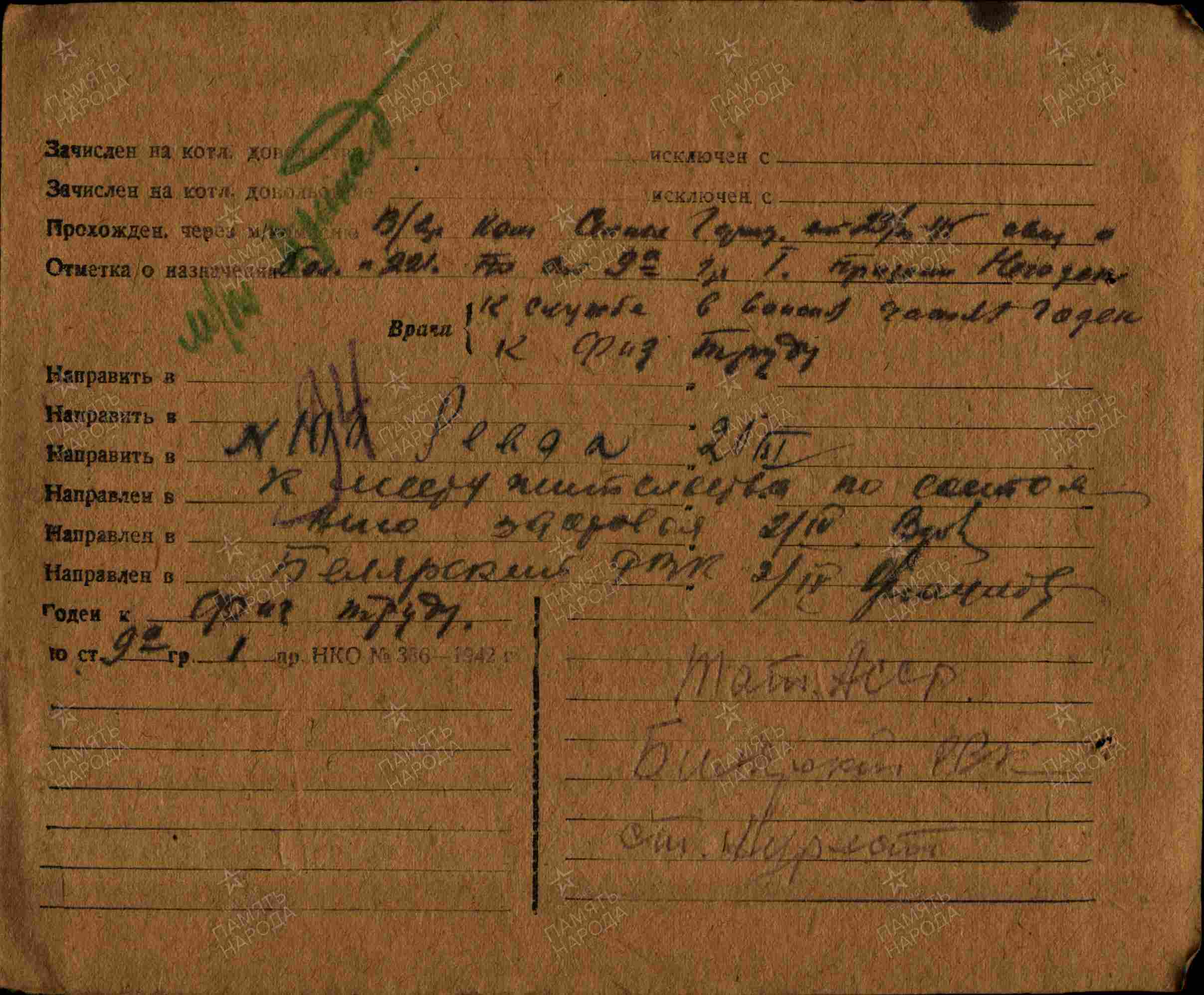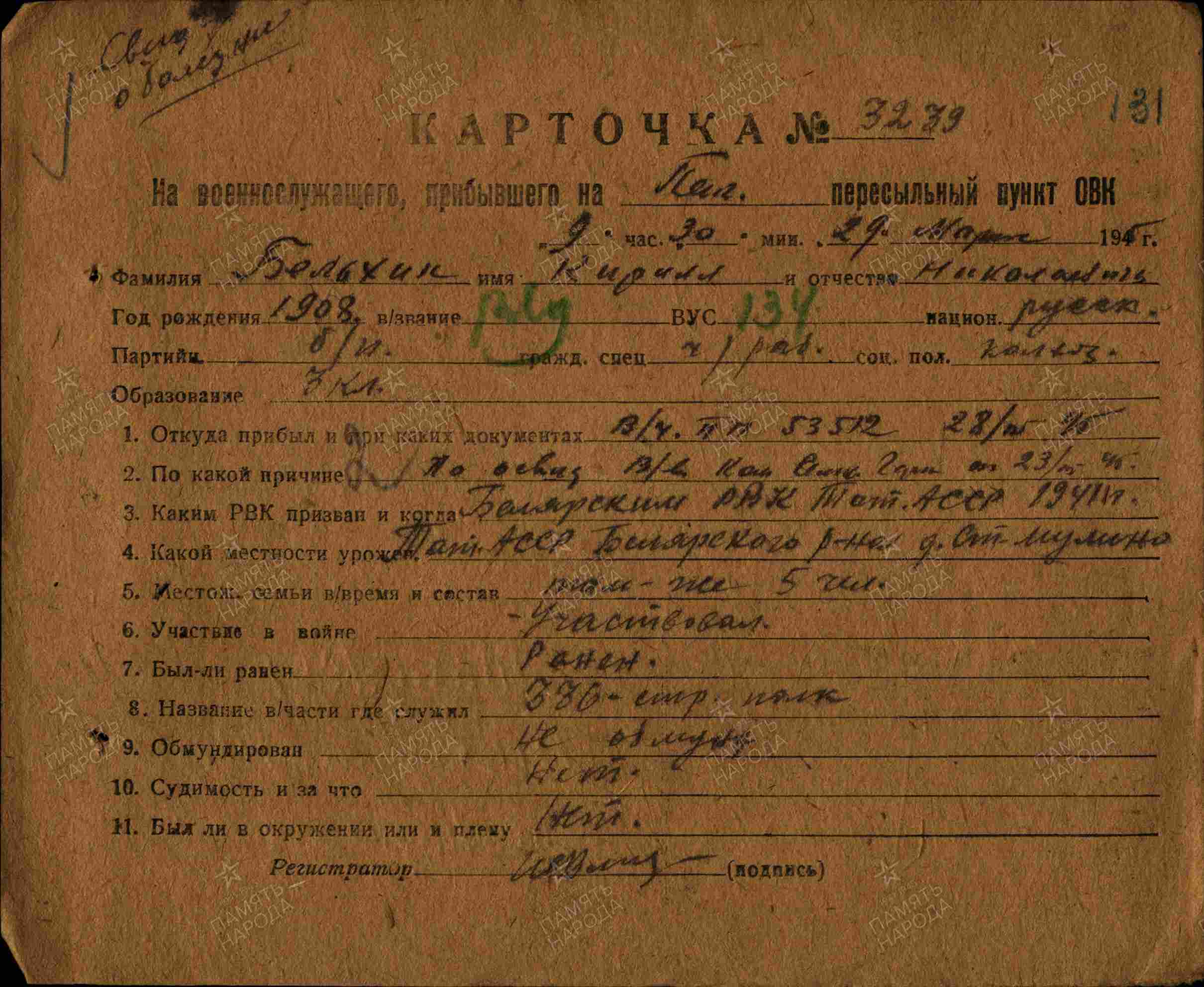 БЕЛИХИН Кирилл Николаевич, 1908, д. Старое Муллино. Мобилизован Билярским РВК в 1941. Красноармеец, 336 СП 5 СД 31 А. Тяжело ранен на Калининском фронте. После излечения работал в к-зе «МОПР». В 1943-1945 призывался повторно пять раз, врачебными комиссиями пересыльных пунктов возвращался к месту жительства по состоянию здоровья.