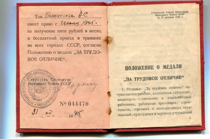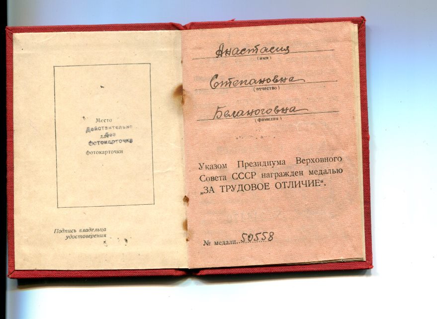 БЕЛОНОГОВА АНАСТАСИЯ СТЕПАНОВНА (1892-1979) - МЕДАЛЬ «ЗА ТРУДОВОЕ ОТЛИЧИЕ» (1945 Г.)