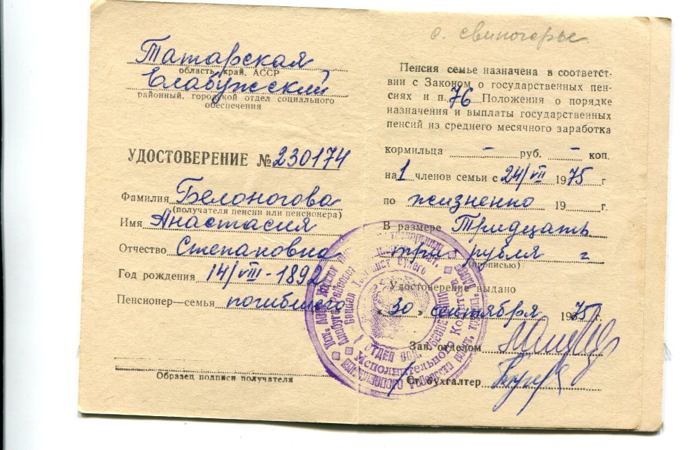 У Белоноговой А.С. в самом начале войны сына забрали на курсы танкиста в г.Сарапул, она один раз к нему ездила отвозила хлеб и продукты. От сына пришло письмо, что не успел отведать ее гостинцы, т.к. сразу их перебросили на фронт. Погиб. В городе Елабуга на Мемориале Памяти размещена фамилия сына.