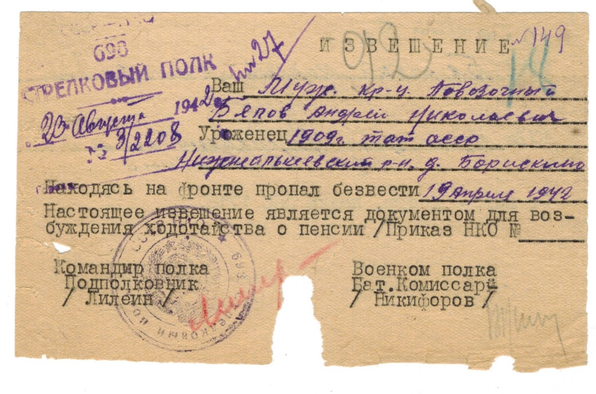В начале 1942 г. в Казани сформировали 146 стр.дивизию, в состав которой вошел Белов А.Н. повозочным 698 стрелкового полка 146 стрелковой дивизии. Андрей Николаевич участвовал в зимне-весеннем наступлении под Москвой в районе Мосальска . С 12 апреля дивизия наступала в районе Фомино-2— Зайцева Гора. У Зайцевой Горы получил тяжелое ранение 19.04.1942г. Семье отправили извещение о пропаже без вести. Белов в это время лежал в госпитале.