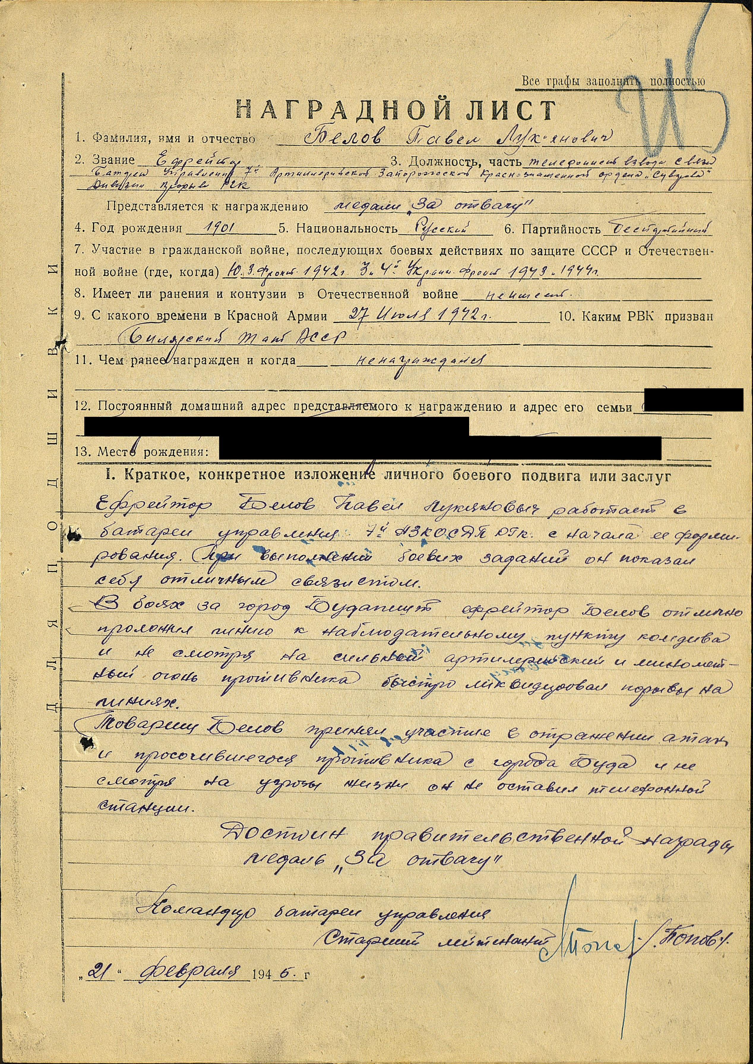 БЕЛОВ Павел Лукоянович, 1901, с. Большие Полянки. Мобилизован в 1941 г. Билярским РВК. Красноармеец 1162 СП 352 СД. В сентябре 1941 г. обследовался медицинской гарнизонной комиссией г. Бугульма по поводу правосторонней паховой грыжи и был комиссован на полгода с последующим освидетельствованием. Повторно мобилизован 27 июля 1942 г. Ефрейтор, телефонист взвода связи батареи управления 7 артиллерийской дивизии РГК. Воевал на Юго-Западном, 3 и 4 Укр. фронтах, участвовал в штурме Будапешта. Награждён медалями "За отвагу" (1945), "За победу над Германией", "За взятие Будапешта". После войны работал в колхозе им. Жданова, скончался в 1952 г.