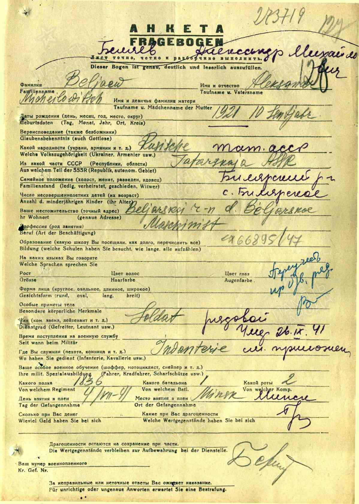 БЕЛЯЕВ Александр Михайлович, 1921, с. Билярск. Мобилизован 14 мая 1941 Сталинским РВК г. Ташкент УзбССР. Красноармеец, стрелок. Попал в плен 4 июля 1941 в р-не г. Минск. Содержался в лагере военнопленных 307 С, Бяла-Подляска, Люблинское воеводство, Польша. Умер 26 сент. 1941.
