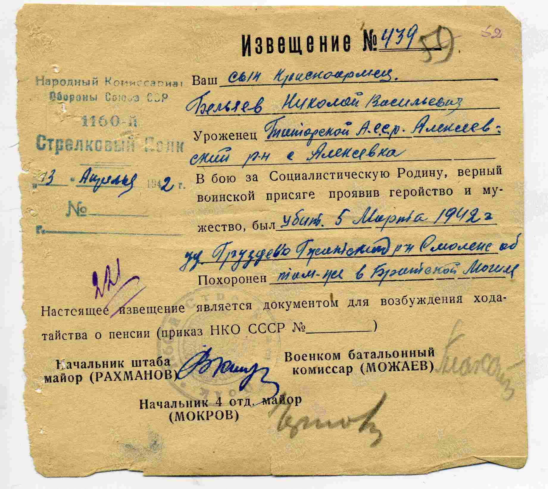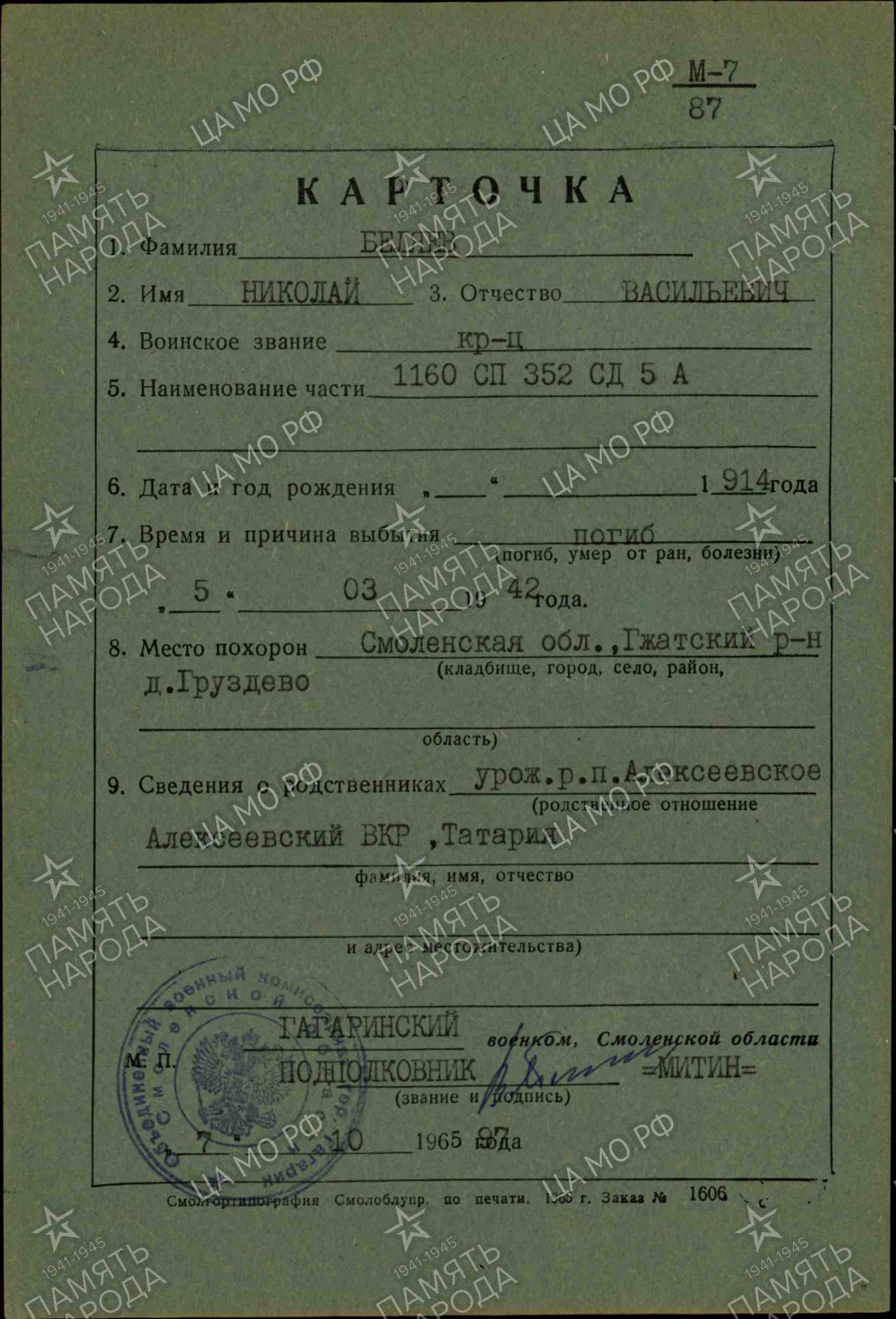 БЕЛЯЕВ Николай Васильевич, 1914, с. Алексеевское. В 1936-1938 проходил срочную службу. Мобилизован Алексеевским РВК в авг. 1941. Красноармеец, 1160 СП 352 СД 20/5 А Западного фронта. Принимал участие в контрнаступлении под Москвой. Погиб 5 марта 1942, д. Груздево, Гжатский (Гагаринский) р-н, Смоленская обл. Увековечен в д. Рыльково.