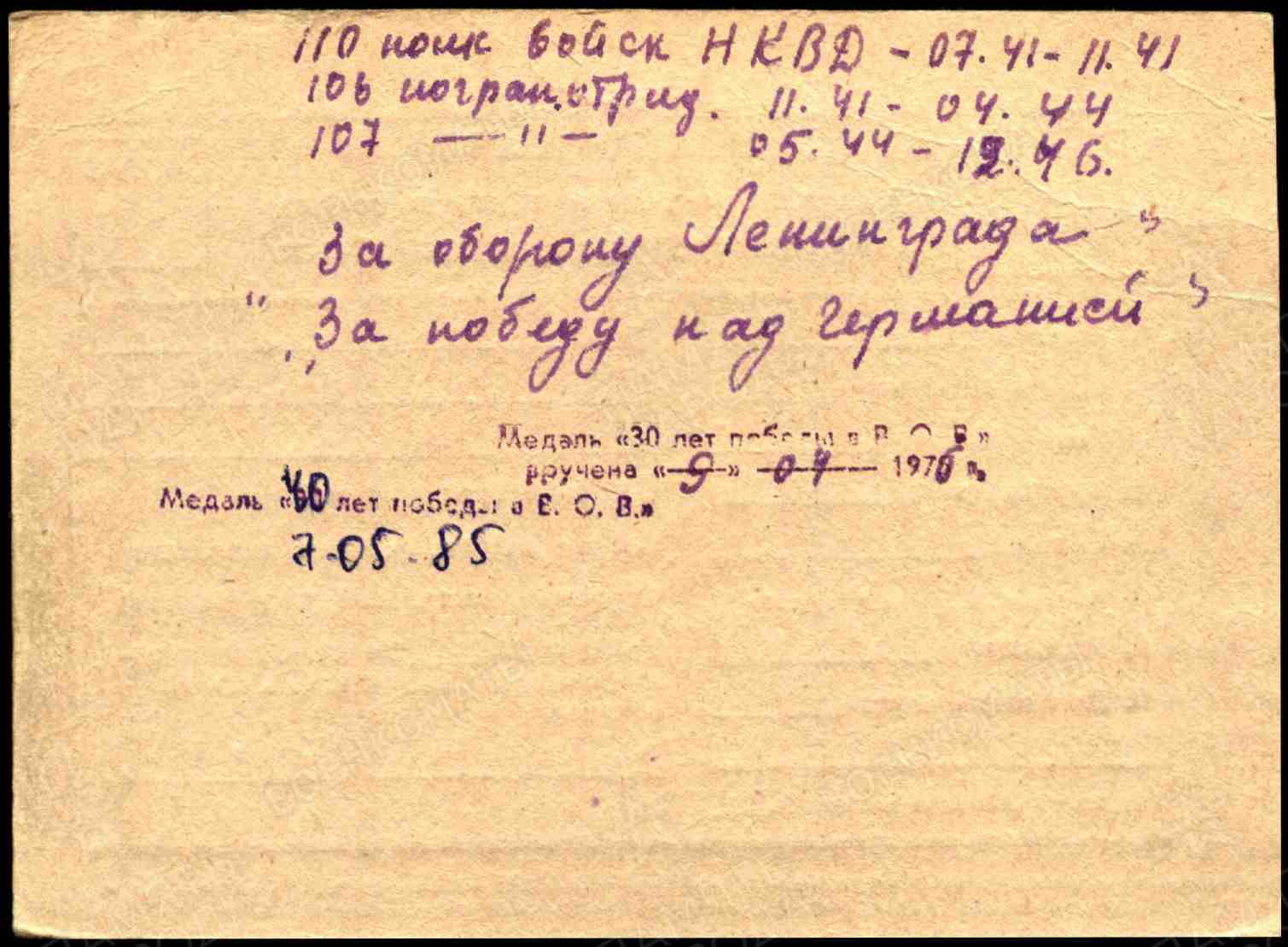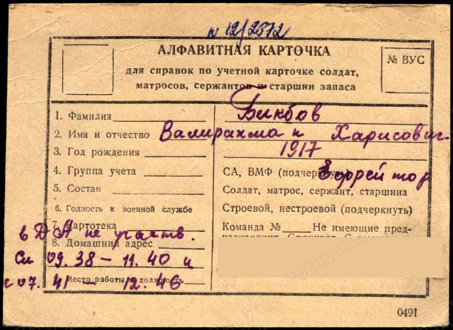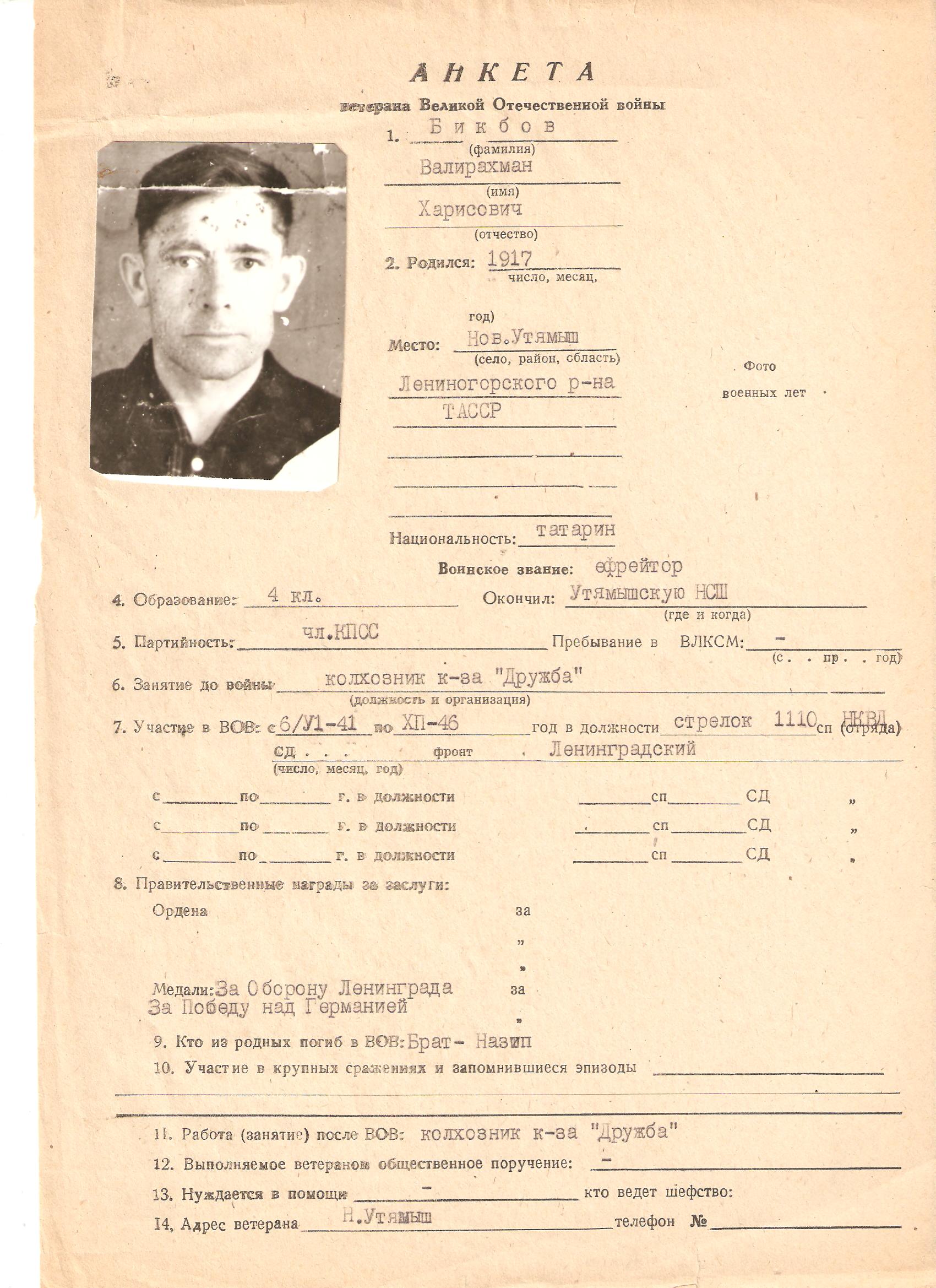 Призван: 06.07. 1941г. Шугуровским РВК ТАССР. Воинское звание ефрейтор, стрелок войск НКВД.