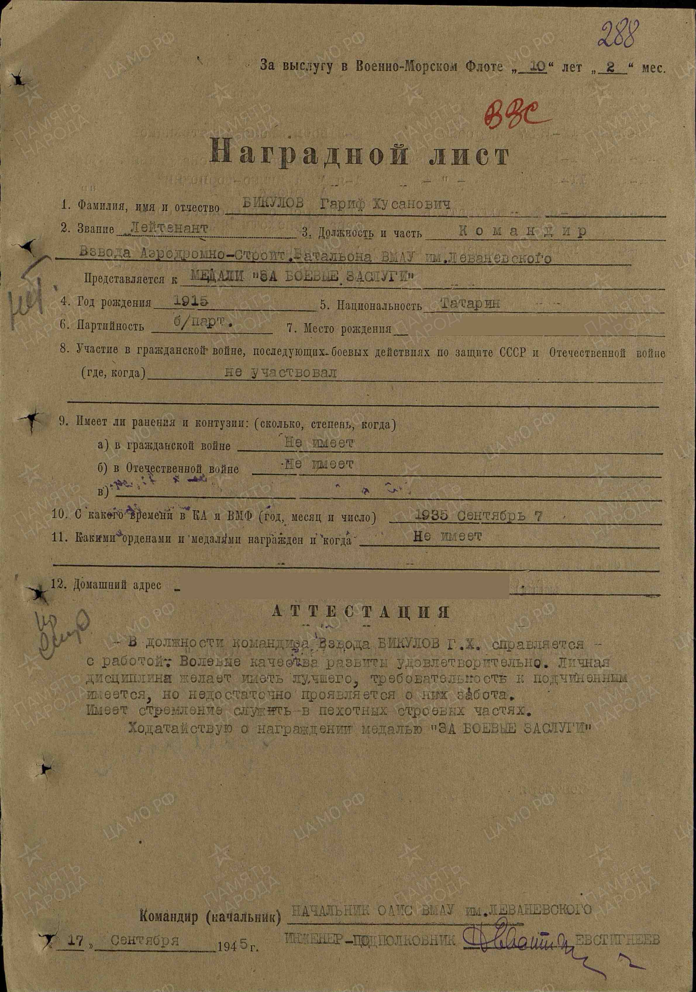 Награжден медалью «За боевые заслуги» (10.11.1945 г.).