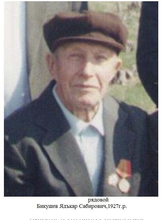 Бикушев Ядъкар Сабирович родился 22.02.1927 года в с.Каргополь Алькеевского района ТАССР. Фронтовик. Участник Великой Отечественной войны 1941-1945гг. Призван Алькеевским РВК ТатАССР . Умер в 08.04.2007г. (Фотография и материалы предоставлены Каргопольским сельским поселением)