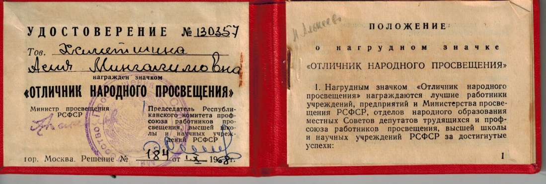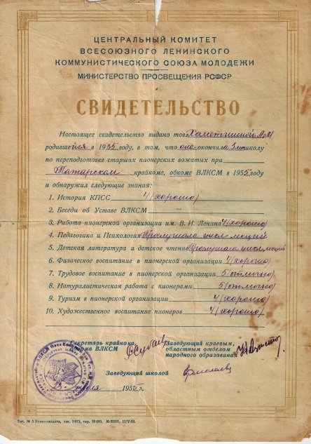1. Принята на должность старшей пионервожатой в Алькеевскую среднюю школу. Приказ РОНО № 312 от 22. 02. 1955 г.