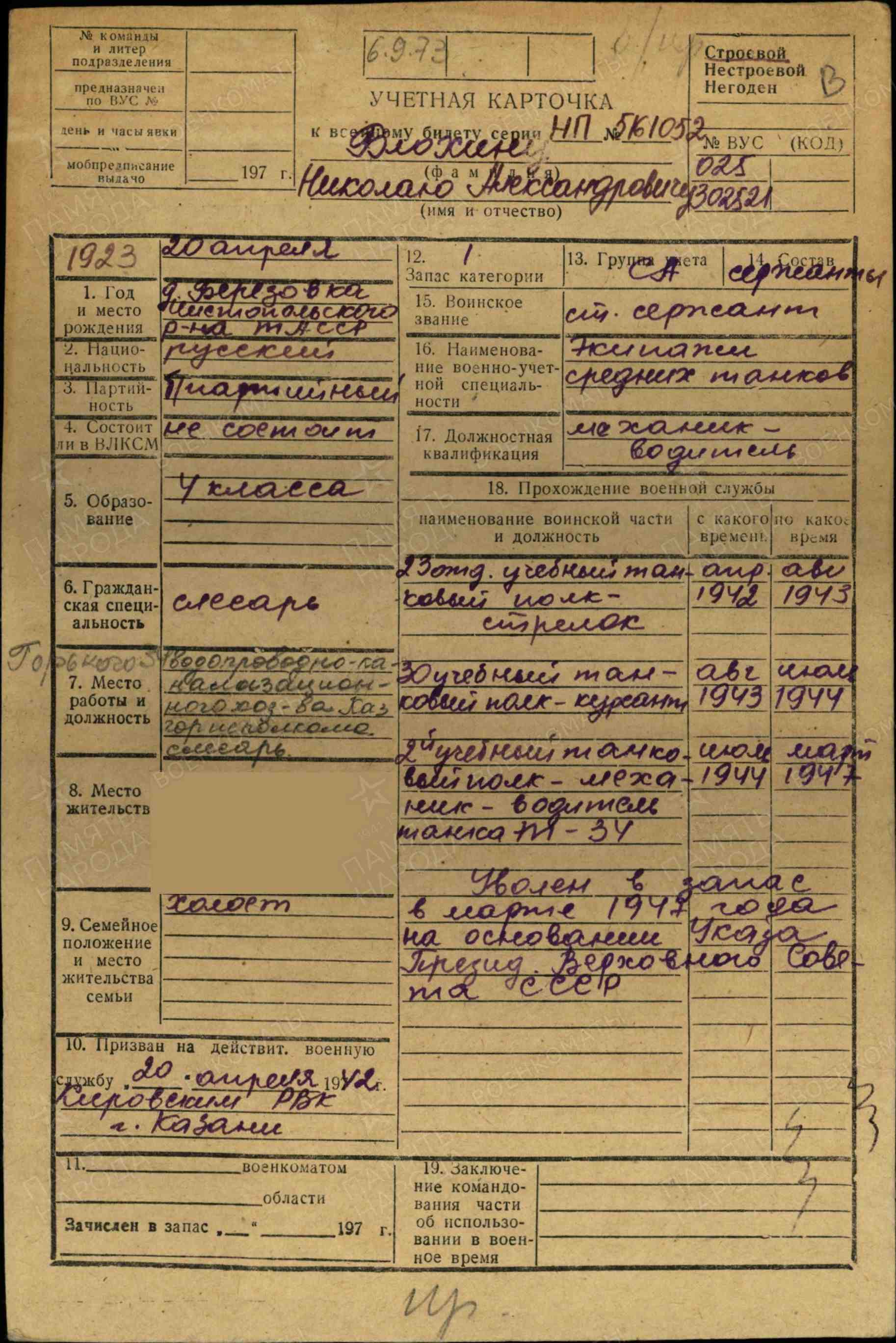 БЛОХИН Николай Александрович, 1923, д. Берёзовка. Мобилизован 20 апр. 1942 Кировским РВК г. Казань. Член ВЛКСМ. До авг. 1943 проходил обучение в учебном танковом полку. Воевал на Воронежском и 1 Украинском фронте в составе 1 ТА/ 1 гв. ТА. Гв. сержант, механик-водитель танка 1 гв. ТБр 3 МехК/ 8 гв. МехК. Участник освобождения Украины. Перенёс тяжёлое ранение левой руки. После госпиталя, с июля 1944, служил в учебной части. Демобилизован в марте 1947 в звании «ст. сержант». Работал слесарем водопроводно-канализационного хозяйства Казанского Горисполкома.