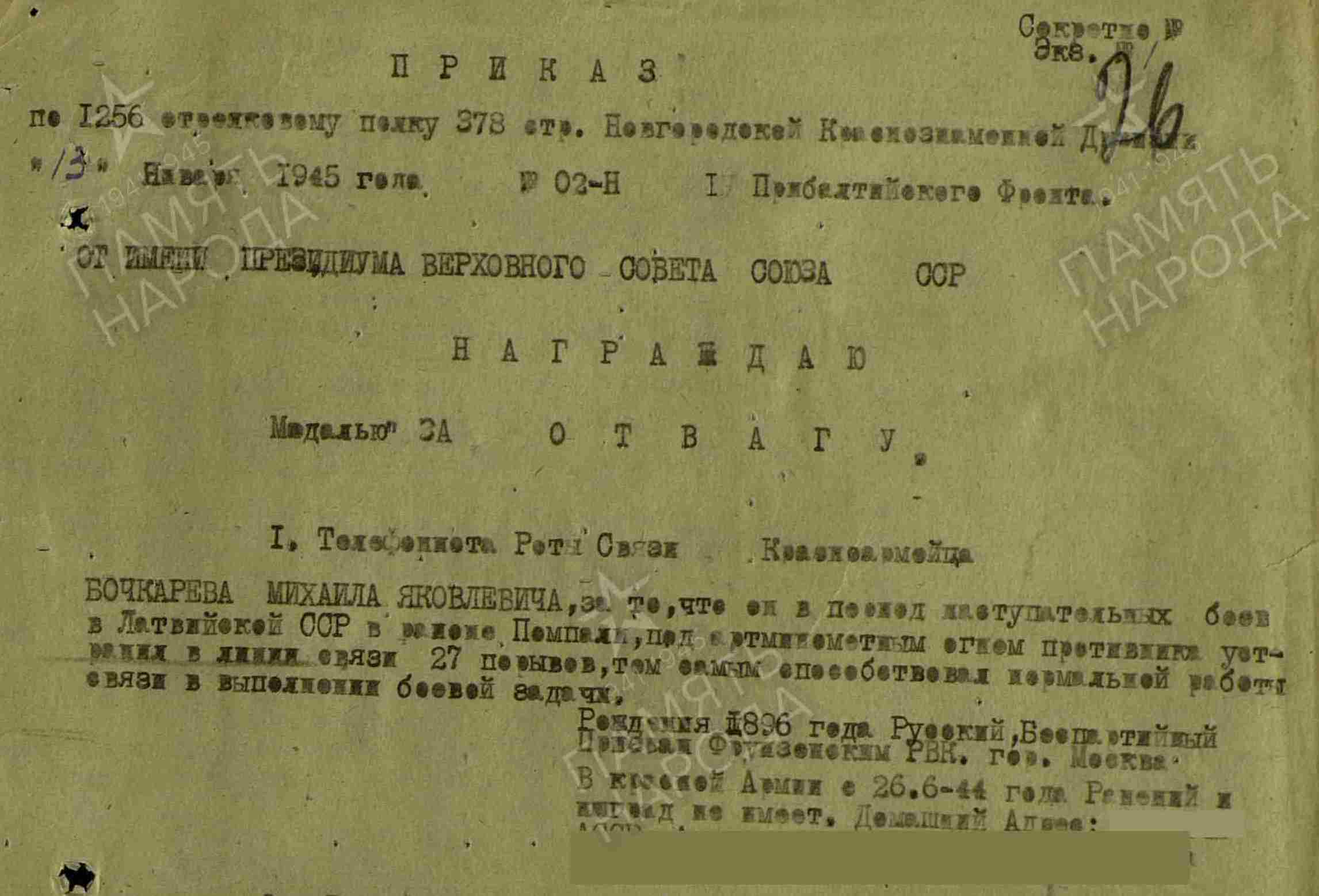 БОЧКАРЁВ Михаил Яковлевич, 1896, д. Гурьевка. Мобилизован 26 июня 1944 Фрунзенским РВК г. Москва. Красноармеец, телефонист роты связи 1256 СП 378 СД 4 УдА/ 6 гв. А 1 Прибалтийского/ 2 Прибалтийского фронта. Награждён медалью «За отвагу».