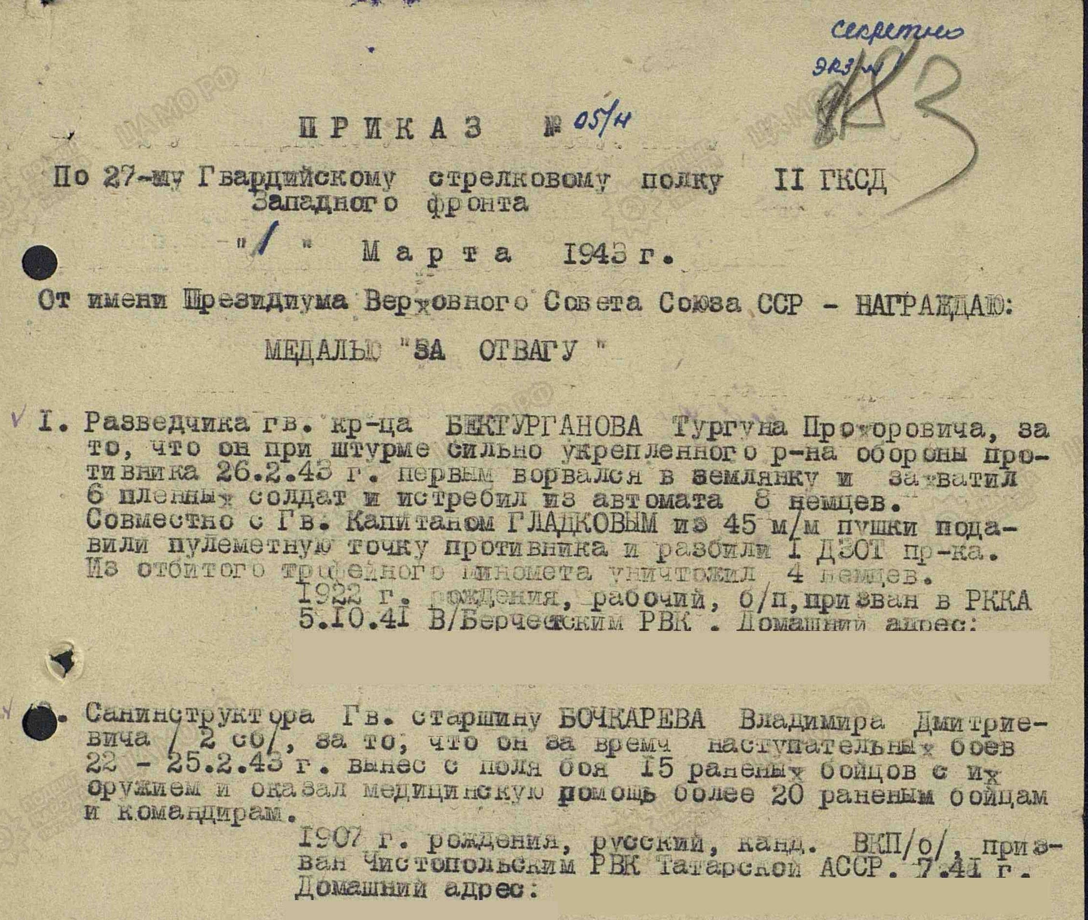 БОЧКАРЁВ Владимир Дмитриевич, 1907, д. Русская Майна. Мобилизован Чистопольским РВК в июне 1941 г. Старшина медицинской службы, санинструктор. Воевал на Южном, Волховском и Ленинградском фронтах в составе 27 гв. стр. полка 11 гв. СД и 43 отдельного сапёрного батальона 9 штурмовой инженерно-сапёрной бригады РГК. Награждён двумя медалями "За отвагу" (1943, 1944 - представлялся к ордену Красной Звезды), орденом Отечественной войны 1 ст. (1985).