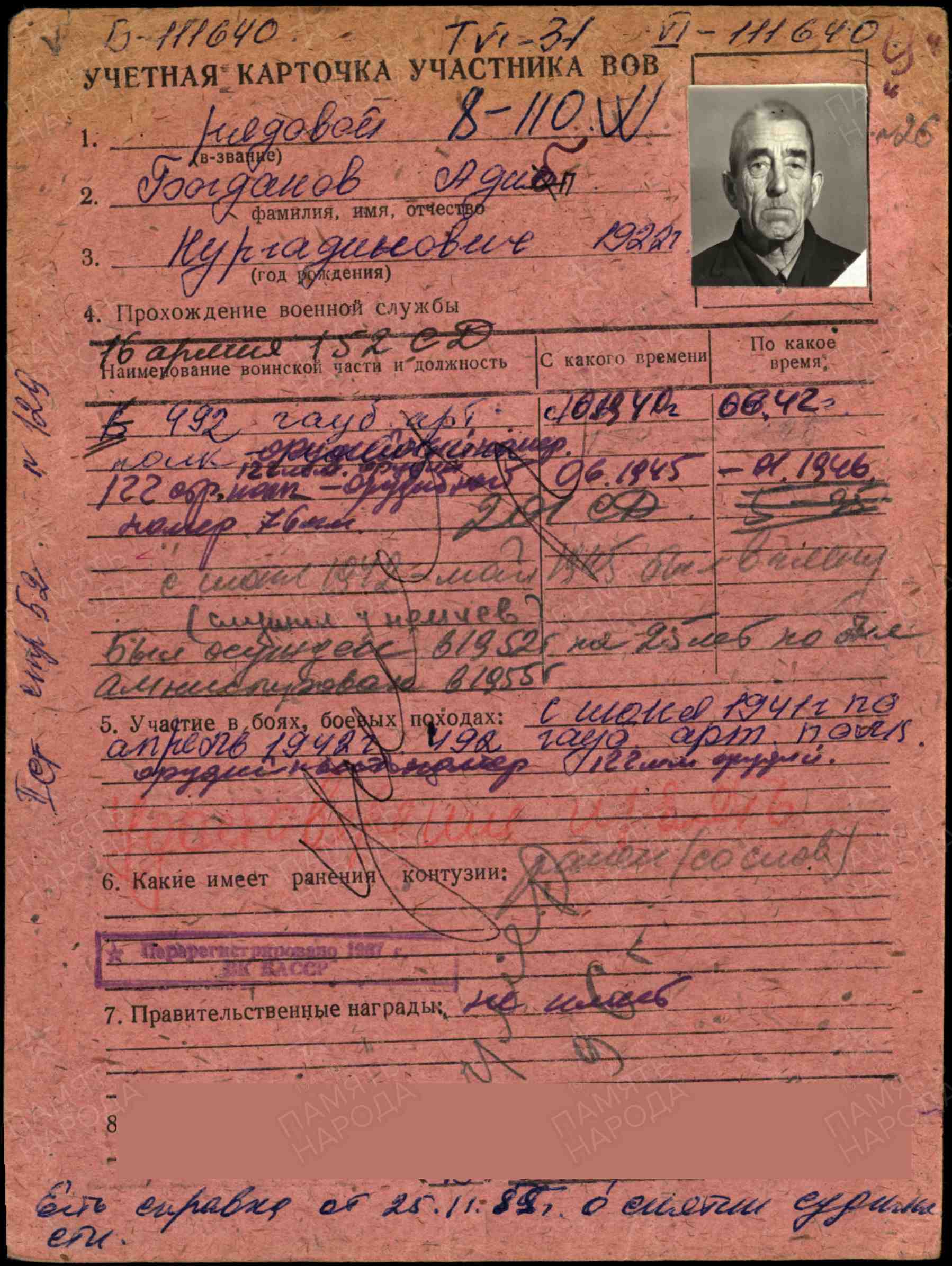 БОГДАНОВ Адип Нургатдинович, 1922, с. Большие Тиганы. Призван Янаульским РВК БашАССР в окт. 1940. Участник боёв в составе 492 ГАП 152 СД 16 А Западного фронта. Красноармеец, номер 122 мм орудия. Получил ранение. Попал в плен в апр. 1942. Содержался в лагерях в/пленных в Белоруссии, Германии, Франции. Освобождён американскими войсками в мае 1945 и репатриирован советской стороне. Служил в составе 8 гв. А. Демобилизован в 1946. В 1952 осуждён на 25 лет ИТЛ по обвинению в сотрудничестве с немцами. Амнистирован в 1955. Награждён орденом Отечественной войны 2 ст. (1985).