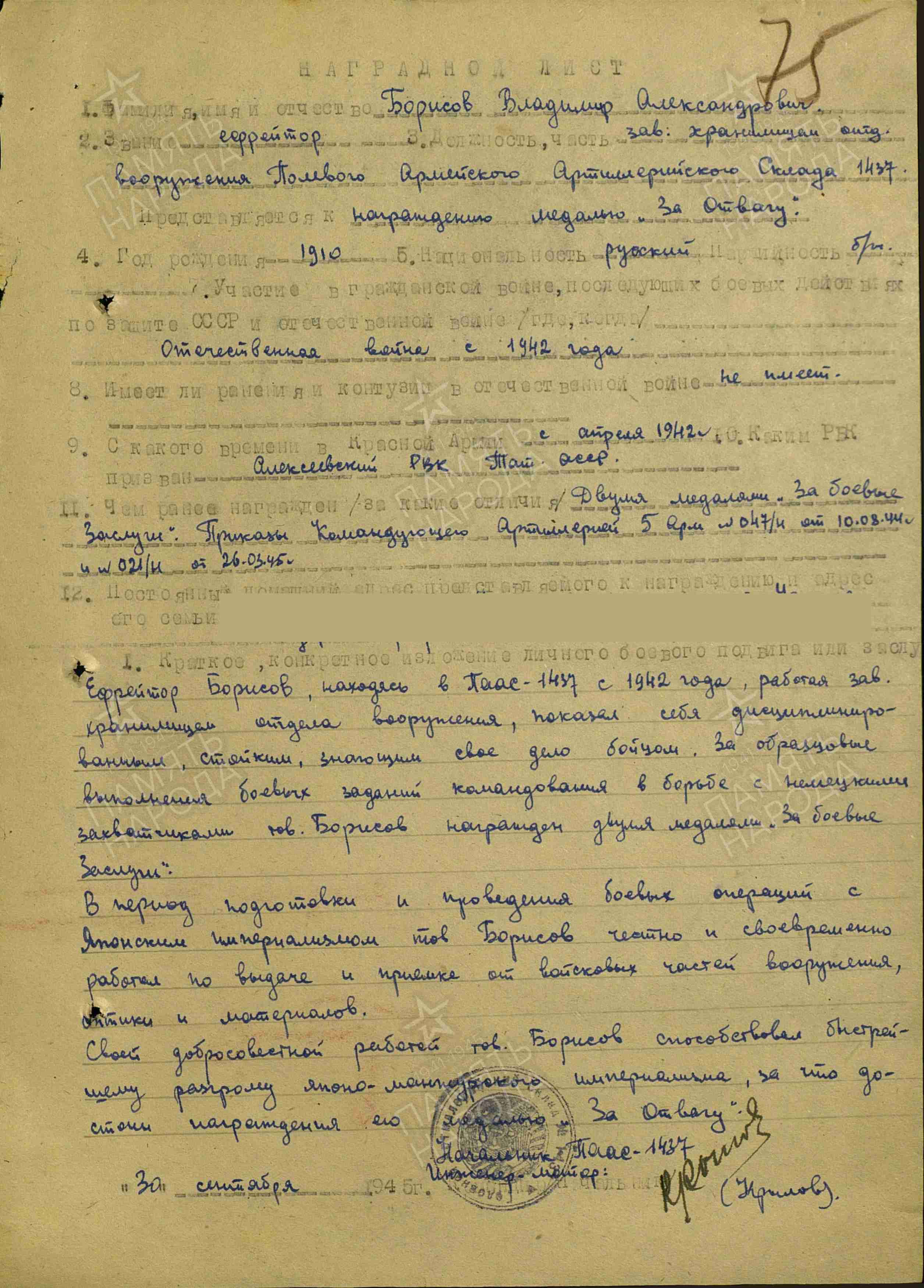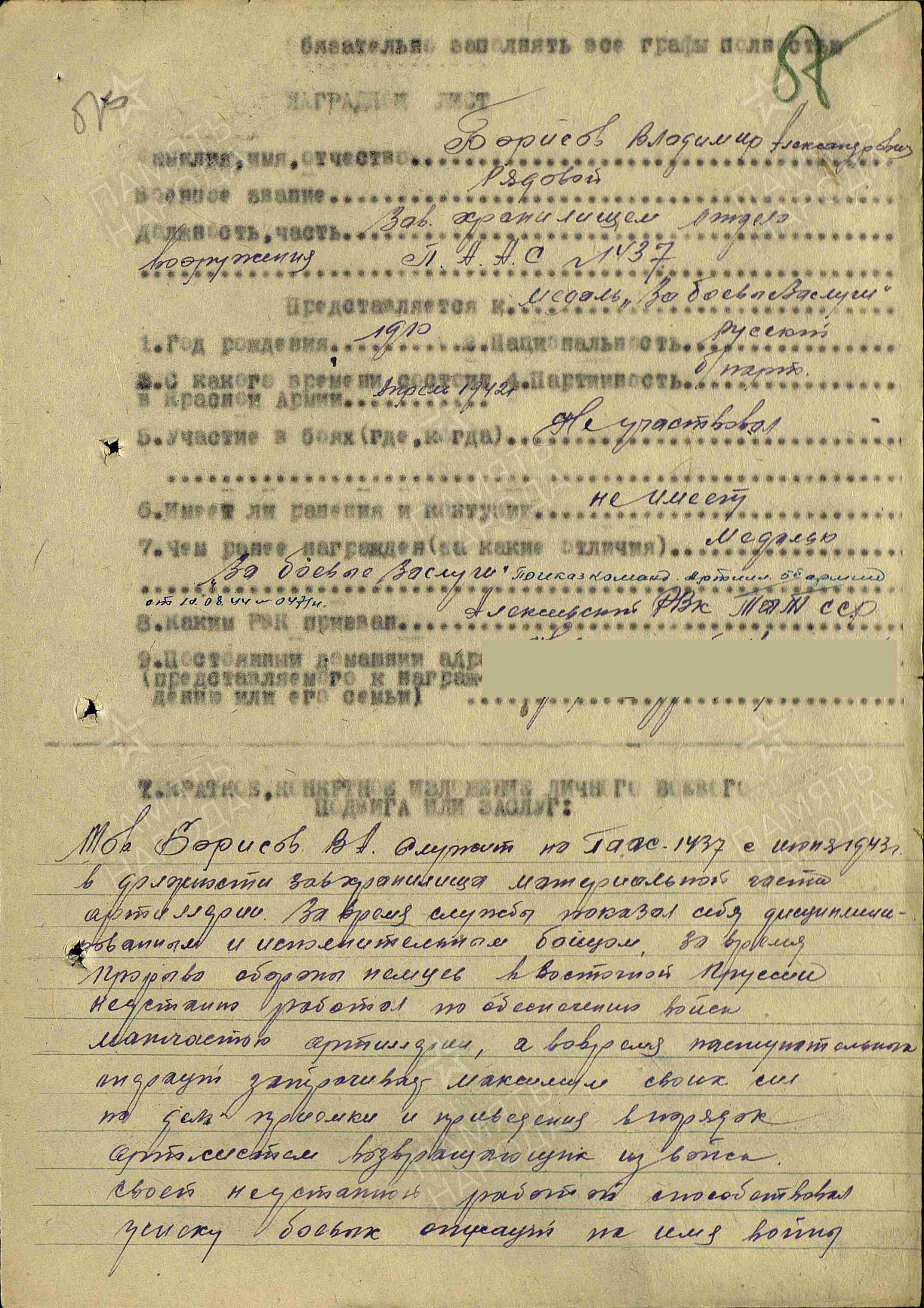 БОРИСОВ Владимир Александрович, 1910, д. Ольхово, Вологодская обл. Жил в с. Балахчино. Мобилизован Алексеевским РВК 30 мая 1942. Красноармеец/ ефрейтор, зав. хранилища отдела вооружения Полевого Армейского арт. склада (ПААС) № 1437 5 Армии Западного/ 3 Белорусского/ 1 Дальневосточного фронта. Награждён тремя медалями «За боевые заслуги», орденом Отечественной войны 1 ст. (1985).
