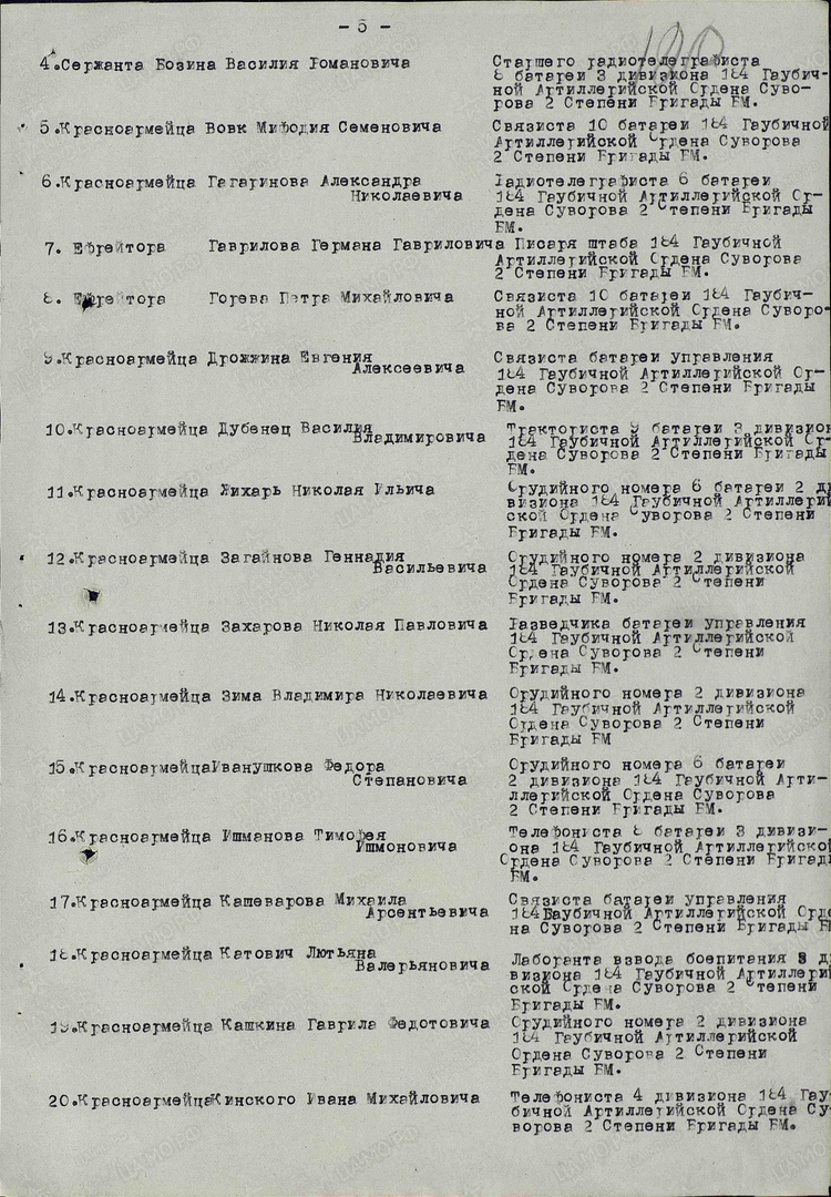 Выписка из приказа: «Наградить сержанта, старшего радиотелеграфиста 8 батареи 3 дивизиона 184 гаубичной артиллерийской ордена Суворова II степени бригады Б.М. Бозина В.Р. медалью «За боевые заслуги», приказ №: 14/н от: 07.05.1945».