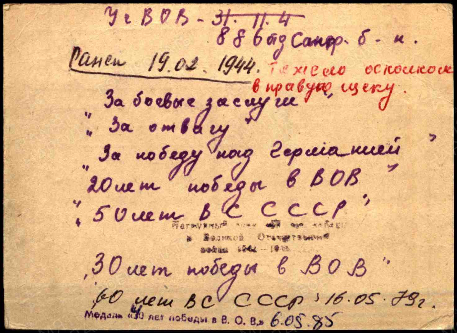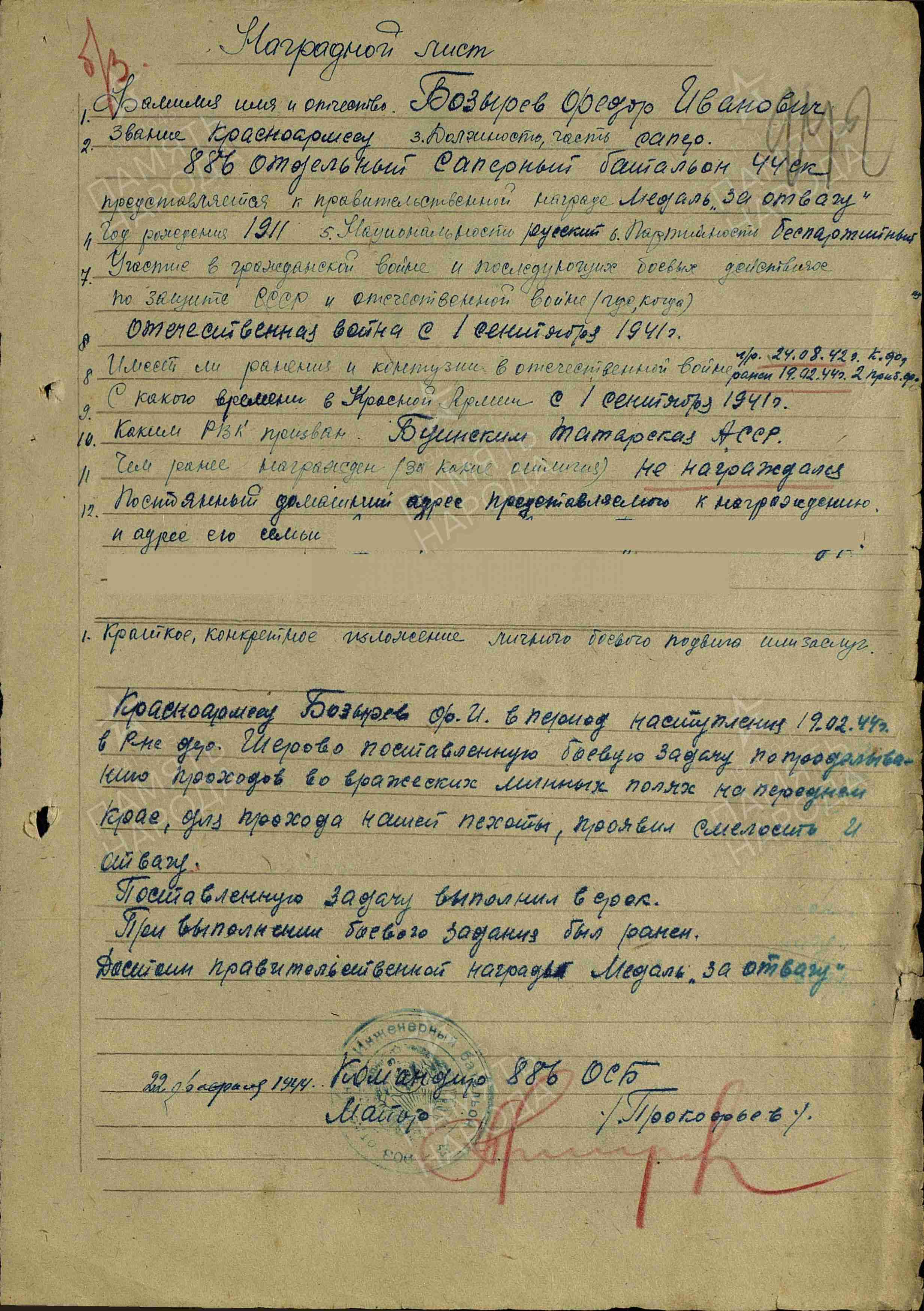 Призван 08.1941г. Буинским РВК, ТАССР. В Великой Отечественной войне участвовал с 30.11.1941 по 19.02.1944 года. Воинское звание красноармеец; рядовой сапёр- минер. Воинская часть 886 отдельный саперный батальон. Тяжело ранен осколком в правую щеку 19.02.1944г.