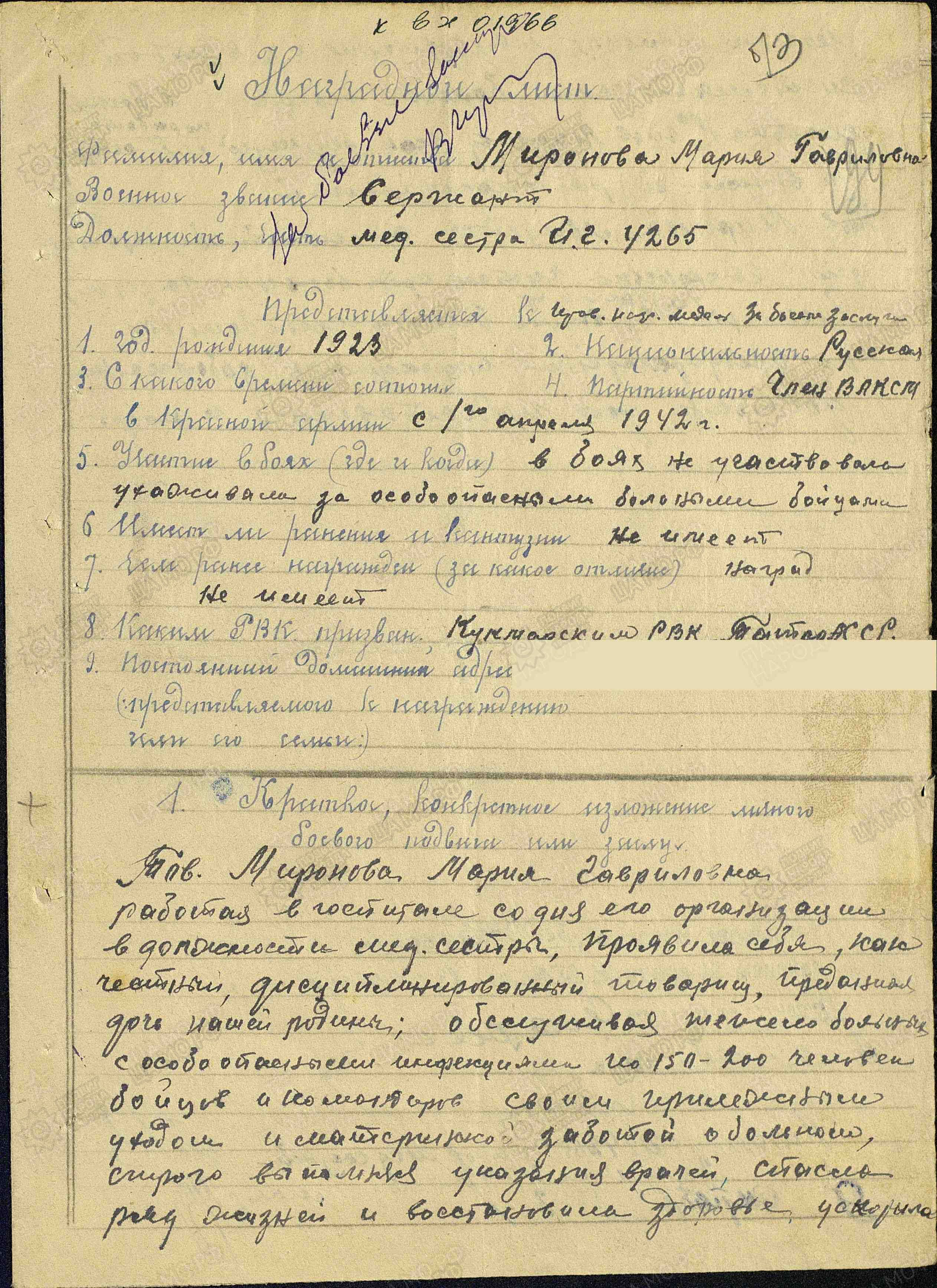 БРЫЛЁВА (МИРОНОВА) Мария Гавриловна, 1923, с. Куркуль. Мобилизована 1 апреля 1942 г. Кукморским РВК. Сержант медицинской службы, медсестра инфекционного госпиталя (ИГ) 4265 34А Северо-Западного фронта. В госпитале со дня его организации, обслуживала 150-200 тяжело больных бойцов и командиров с особо опасными инфекциями, способствуя их возвращению в строй. Награждена медалью "За боевые заслуги" (1943), орденом Отечественной войны 2 ст. (1985).