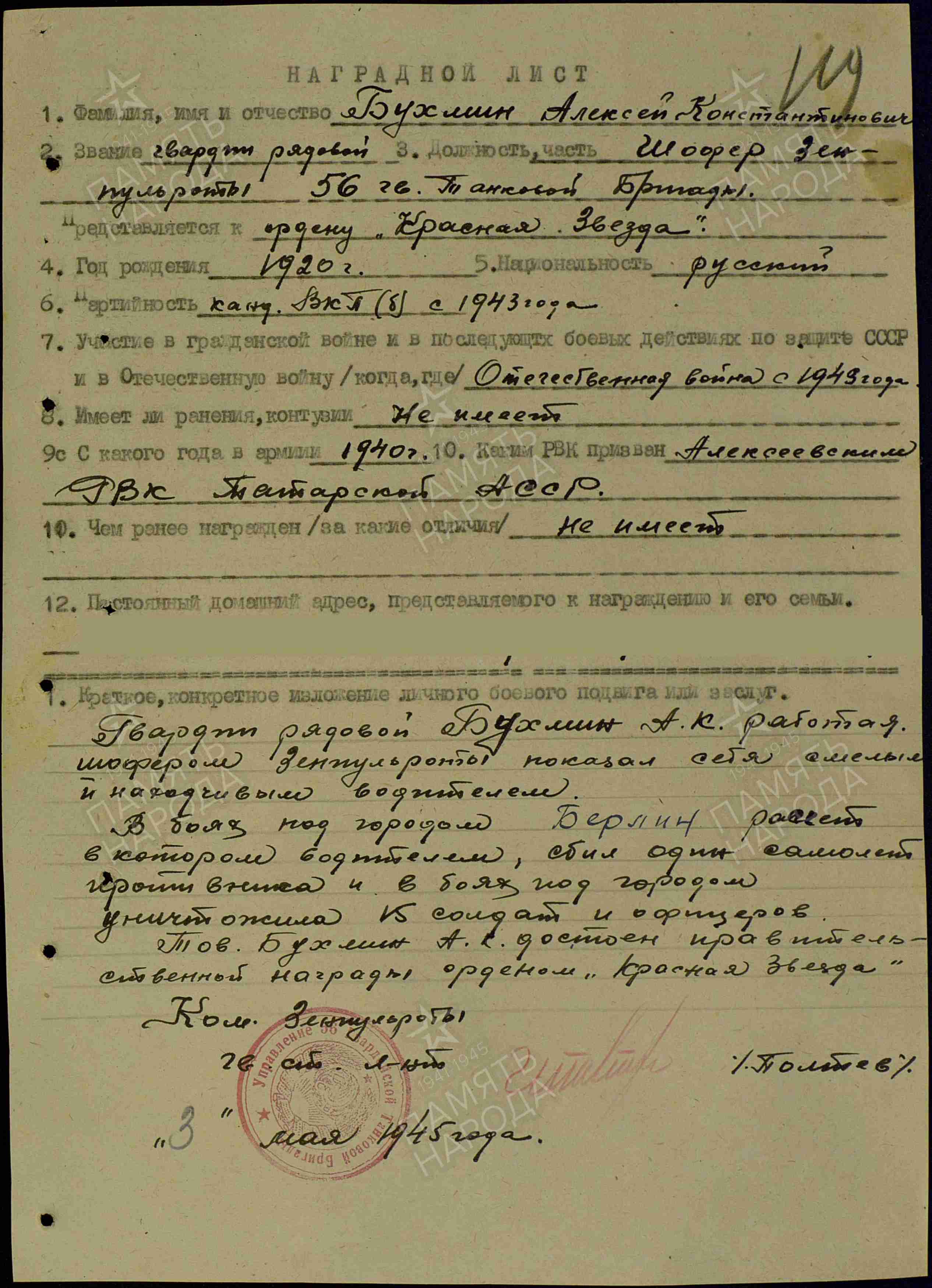 БУХМИН Алексей Константинович, 1920, с. Лебедино. Мобилизован Алексеевским РВК в 1940. Красноармеец/ гв. красноармеец. На фронте с 1943. Шофёр зенитно-пулемётной роты 195 ТБр 15 ТК 3 ТА Воронежского/ Юго-Западного фронта; с 26 июля 1943 – 56 гв. ТБр 7 гв. ТК 3 гв. ТА Центрального/ Воронежского/ 1 Украинского фронта. Награждён медалями «За отвагу», «За взятие Берлина», «За освобождение Праги».