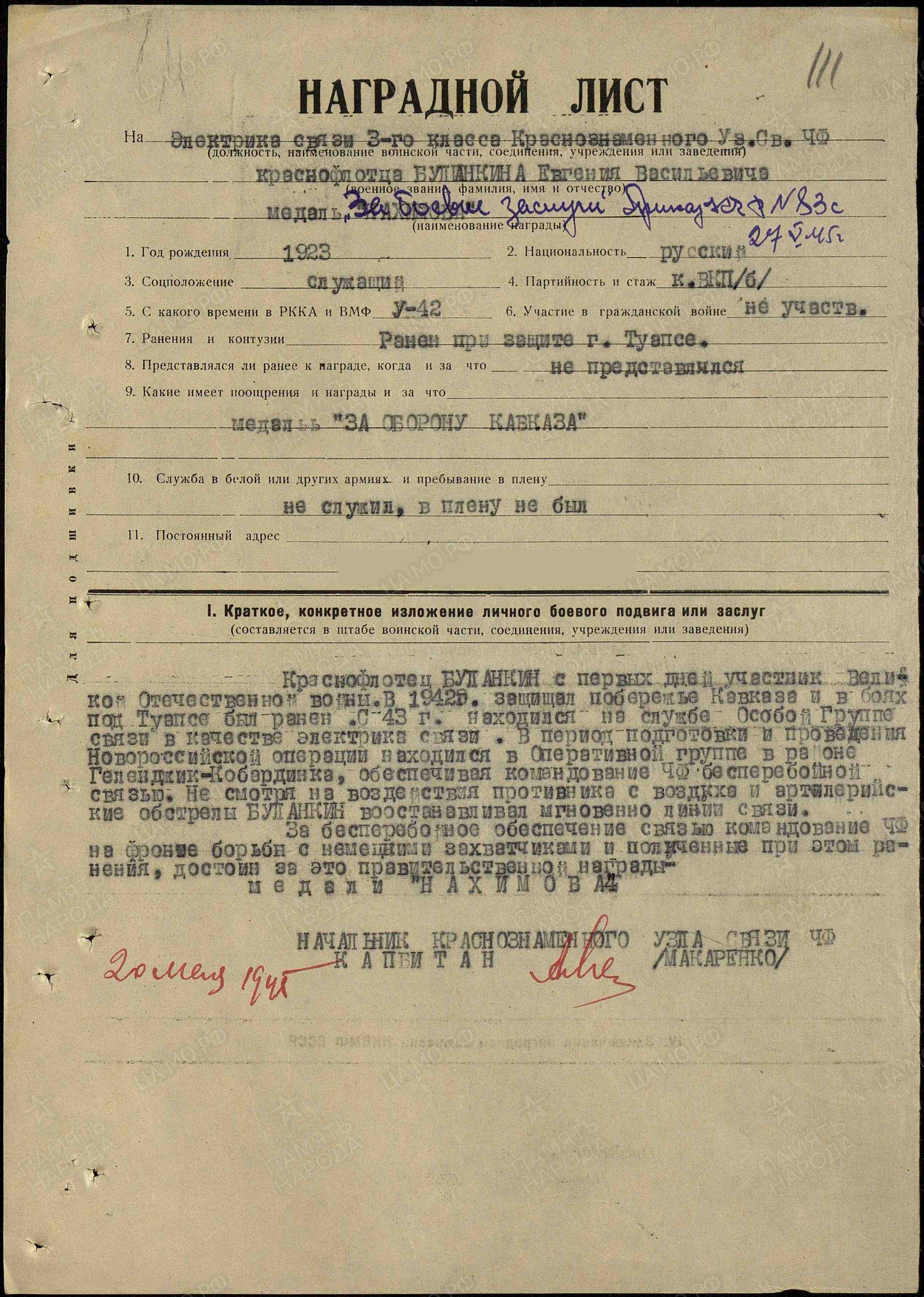 Евгений Васильевич Буланкин родился 1 мая 1923 г. в г.Чистополе, ТАССР. 9 мая 1942 г. призван в ряды Красной Армии Чистопольским военным комиссариатом. Служил в должности электрика связи 3-го класса Краснознаменного уз.связи Черноморского флота. Получил ранение при защите г.Туапсе.
