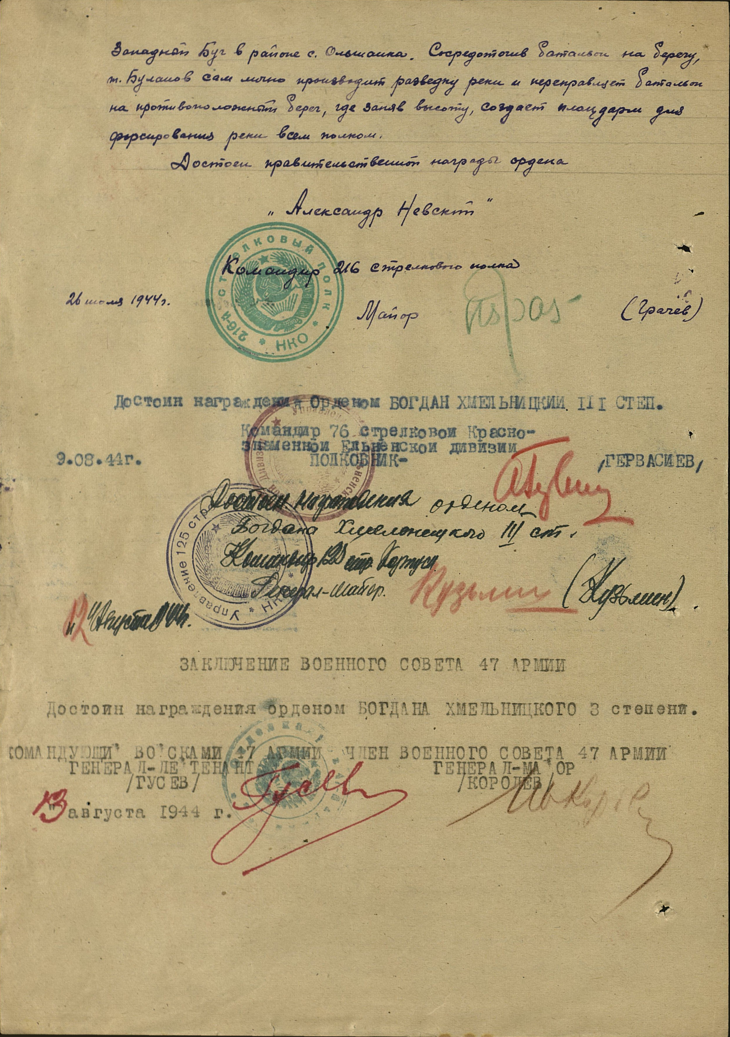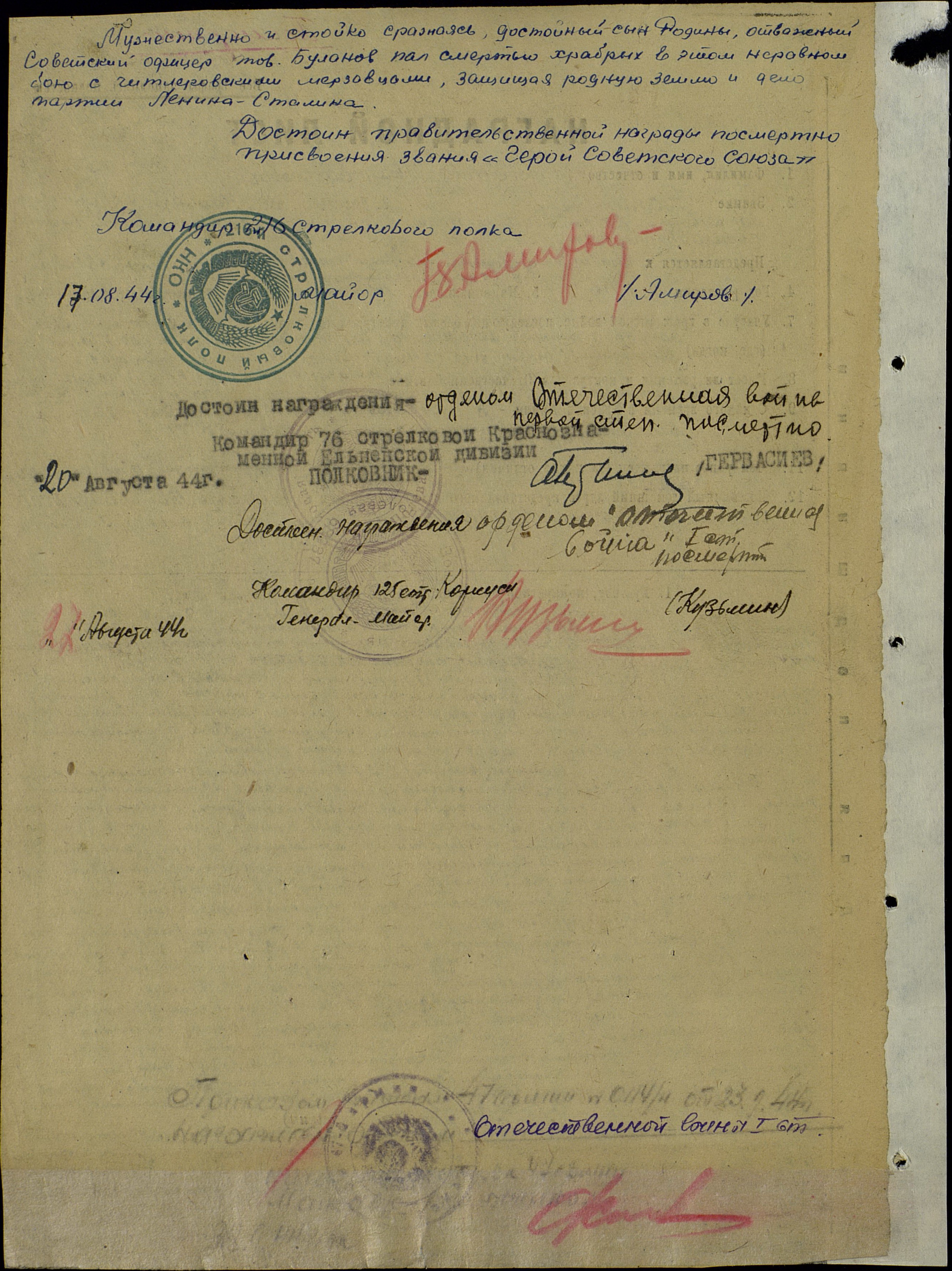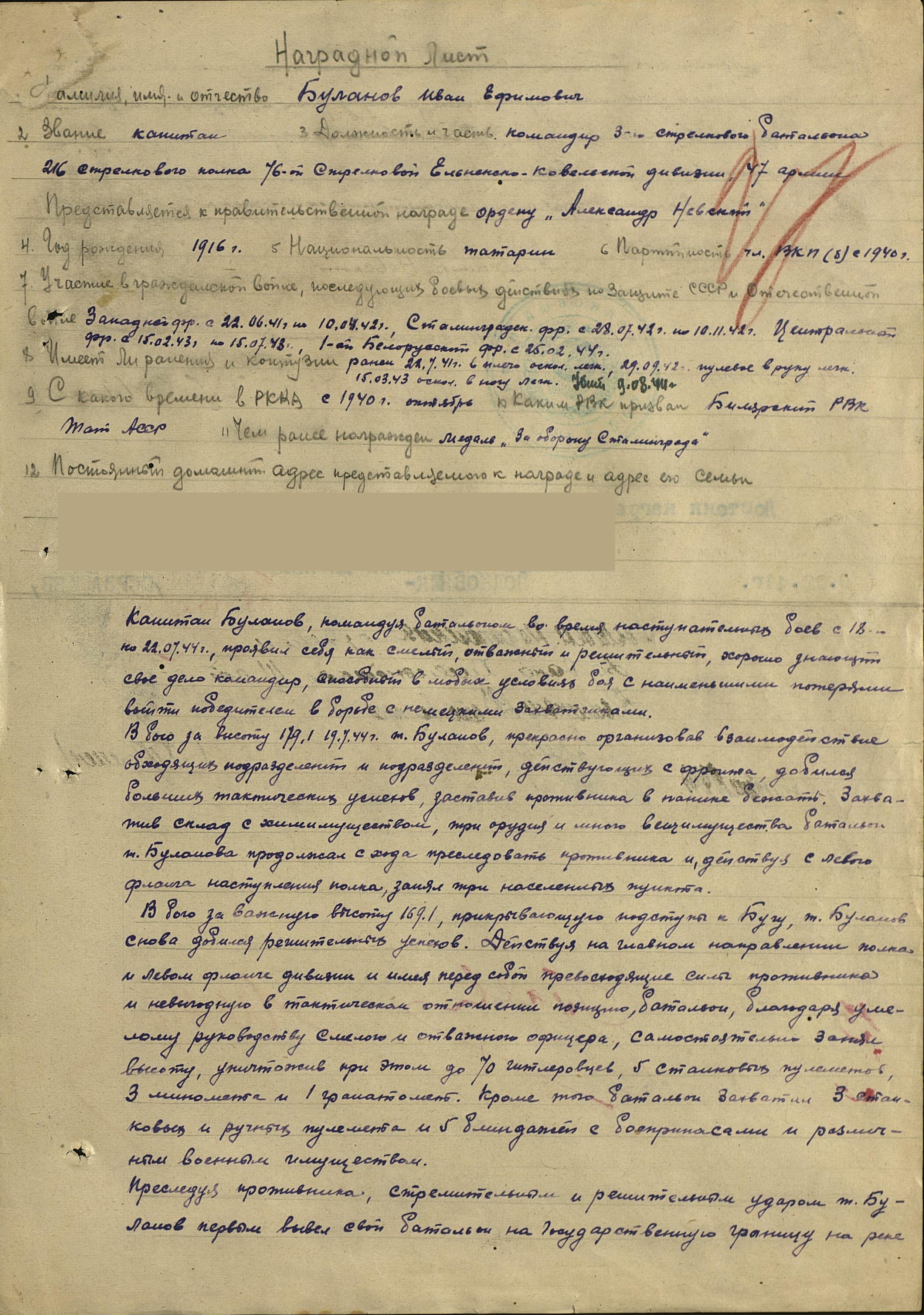 «Буланов Иван Ефимович, капитан, командир 3-го стрелкового батальона 216 стрелкового полка 76-й Краснознаменной Ельнинско-Ковельской дивизии 47 армии. Представляется к правительственной награде присвоения посмертно звания «Героя Советского Союза». Год рождения 1916, уроженец с. Крещёный Баран, татарин, чл. ВКП(б) с 1940 г. Призван Билярским райвоенкоматом Татарской АССР. В Красной Армии с января 1940 г. Участвовал в боях на Западном фронте с 22.6.41 по 10.6.42, Сталинградском фронте с 28.7.42 по 10.11.42, Центральном фронте с 15.02.43 по 15.7.43, 1-м Белорусском фронте с 25.2.44. Ранен легко в плечо 22.7.41, ранен легко пулей в руку 29.9.42, ранен легко осколком в ногу 15.3.43, героически погиб в бою с немцами 9.8.44. Награждён ранее медалью «За оборону Сталинграда», орденом Богдана Хмельницкого 3-й степени. За период наступательных боев с 18.07.44 г. по 9.08.44 г. капитан Буланов проявил себя, как смелый, отважный и решительный, хорошо знающий своё дело командир, способный в любых условиях боя добиваться положительных результатов при наименьших потерях и если нужно отдать жизнь за Родину. 19.07.44г. в бою за высоту 179,1 прекрасно организовав взаимодействие обходящих подразделений и подразделений, действующих с фронта, тов. Буланов добился больших тактических успехов, обратил в бегство противника и захватив 3 орудия, склад хим. имущества, много вещ. имущества, продолжал с хода стремительно преследовать противника, заняв три населённых пункта. В бою за важную высоту 169,1, прикрывавшие подступы к Бугу, тов. Буланов снова добился решительных успехов. Действуя на главном направлении полка и имея перед собой превосходящие силы противника и невыгодную в тактическом отношении позицию, смелый и отважный офицер, умело руководя своим батальоном, овладел высотой и опрокинул противника к Бугу, захватив 2 пушки и много трофейного вооружения. Преследуя по пятам гитлеровцев, первый в полку переправил свой батальон через реку Буг (вероятнее всего государственная граница СССР - авт.), и закрепившись на западном берегу, обеспечил переправу остальным подразделениям полка.9.08.44г. крупные силы немецкой пехоты, поддерживаемые 16-ю танками, окружили батальон капитана Буланова в районе юго-западнее д. Окунев. Будучи отрезан тов. Буланов смело вступил в бой с немцами, не щадя жизни он сам руководил бойцами, воодушевляя их и призывая умереть за Родину, но не сдаться проклятому врагу. «Пусть по нашим трупам пройдут немцы, но ни шагу назад!!!» Такой приказ дал он своим бойцам и офицерам.Увлеченные приказом своего любимого боевого капитана, бойцы и офицеры его батальона мужественно и стойко сражались с превосходящими силами противника. В этом неравном бою они уничтожили две группы немцев в количестве 25-30 человек каждая, зашедших с флангов, уничтожили 7 танков и один бронетранспортер.Но силы отважных смельчаков уменьшились. Оставшись с небольшой группой бойцов и офицеров, тов. Буланов забрасывает гранатами приближающиеся и всё возрастающие группы обнаглевших немецких извергов и вступает затем в рукопашный бой с ними, уничтожив при этом ещё до 90 гитлеровцев. Сам лично тов. Буланов в этой рукопашной схватке уничтожил гранатами и огнём пистолета до 20 солдат противника.Мужественно и стойко сражаясь, достойный сын Родины, отважный Советский офицер тов. Буланов пал смертью храбрых в этом неравном бою с гитлеровскими мерзавцам