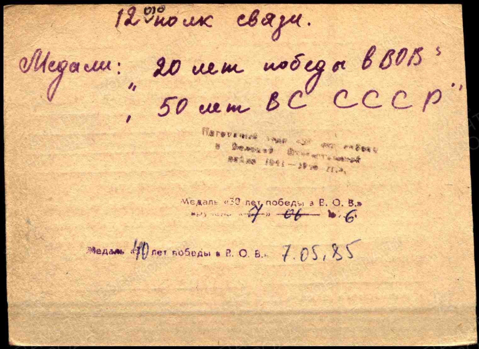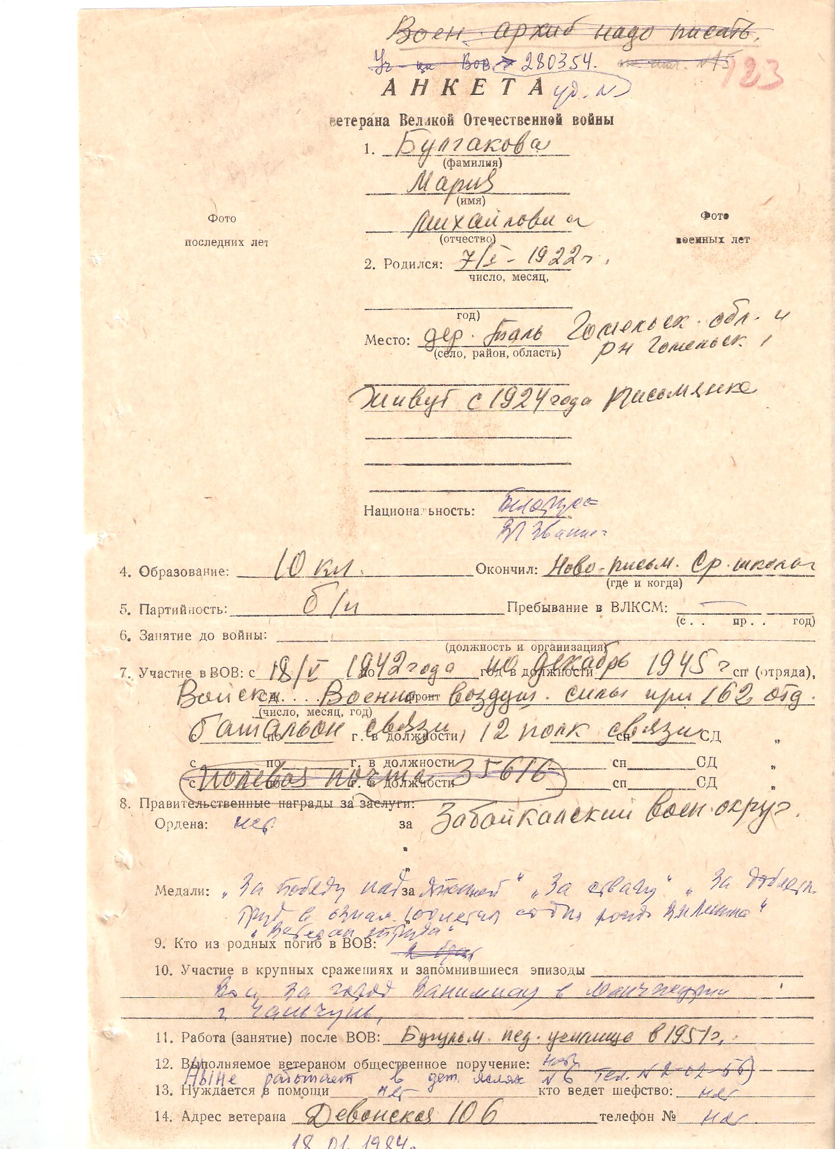 Призвана 18.05.1942г. Ново-Письмянским РВК, ТАССР. Воинское звание мл. сержант; красноармеец. Воинская часть 12 полк связи 12 воздушной армии.