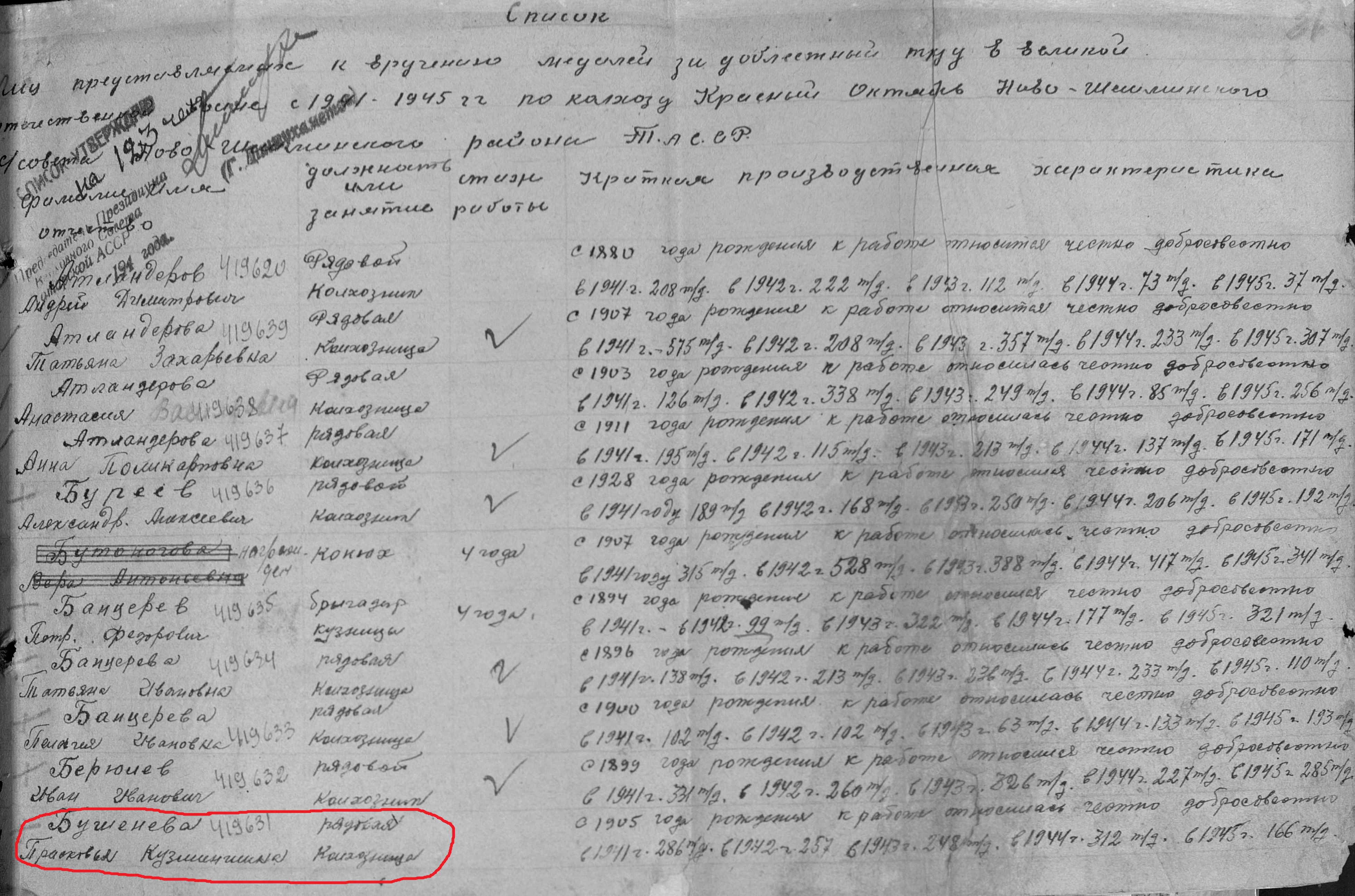 Бушенева Пелагея Тимофеевна родилась в 1909 году в с.Новошешминск Казанской губернии Чистопольского уезда Новошешминской волости. В годы войны работала в колхозе "Кр.Октябрь" колхозницей. Награждена медалью "За доблестный труд в Великой Отечественной войне 1941–1945 гг." (Акт от 28 апреля 1947 г, фонд 3610, опись 2, дело № 325, лист 31,№ 419629).