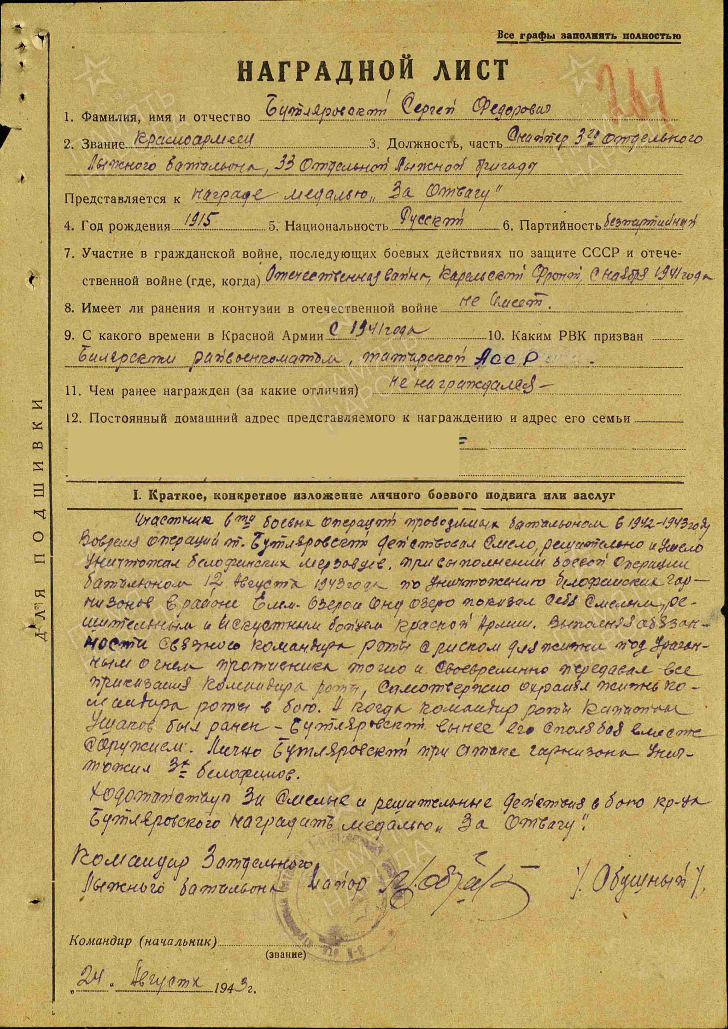 БУТЛЕРОВСКИЙ Сергей Фёдорович, 1915, с. Билярск. Мобилизован Билярским РВК в 1941. Красноармеец/ ефрейтор, снайпер, ординарец-связной ком. роты 3 отд. ЛыжБ 31 отд. ЛыжБр 14 А Карельского фронта. Награждён медалью «За отвагу».