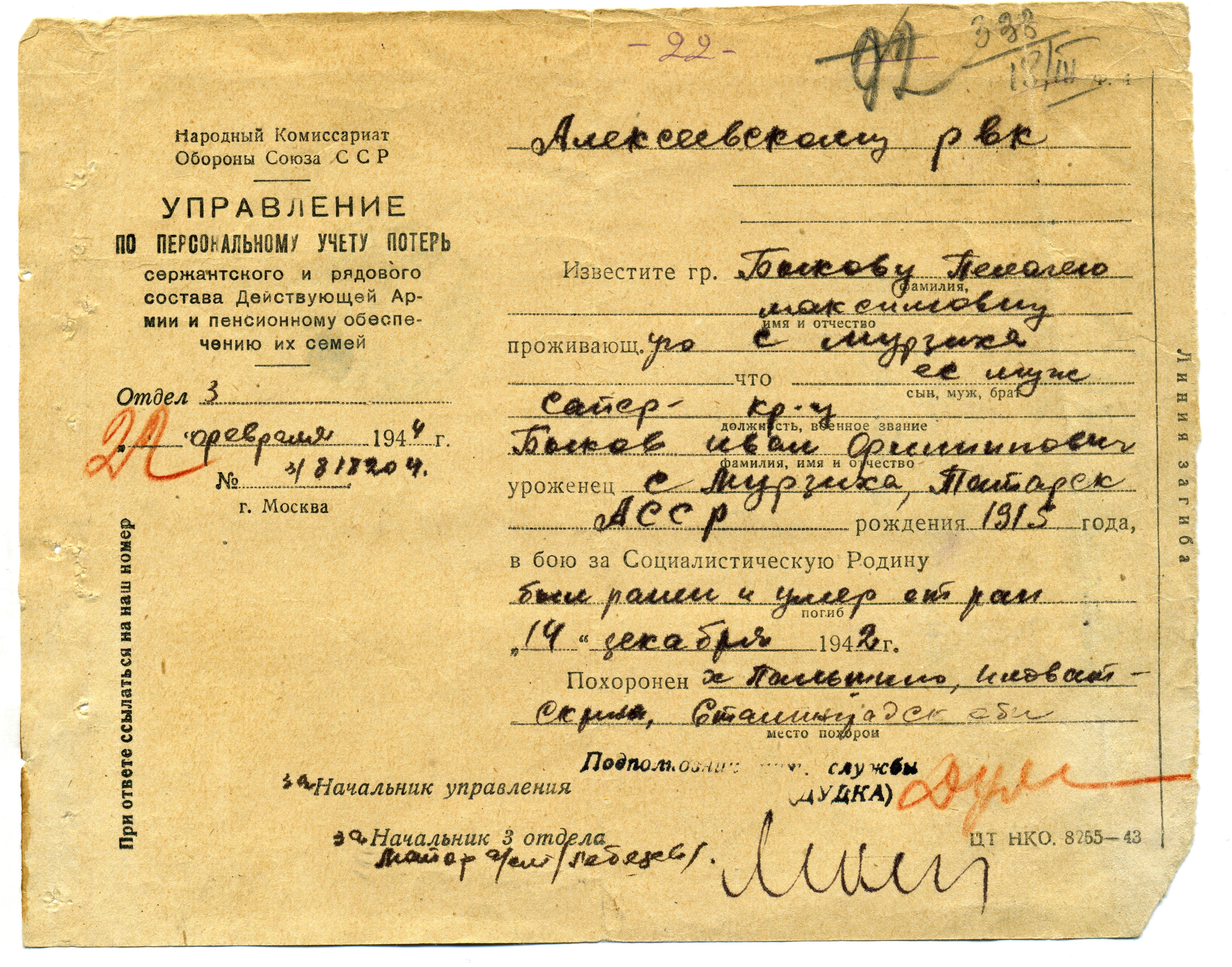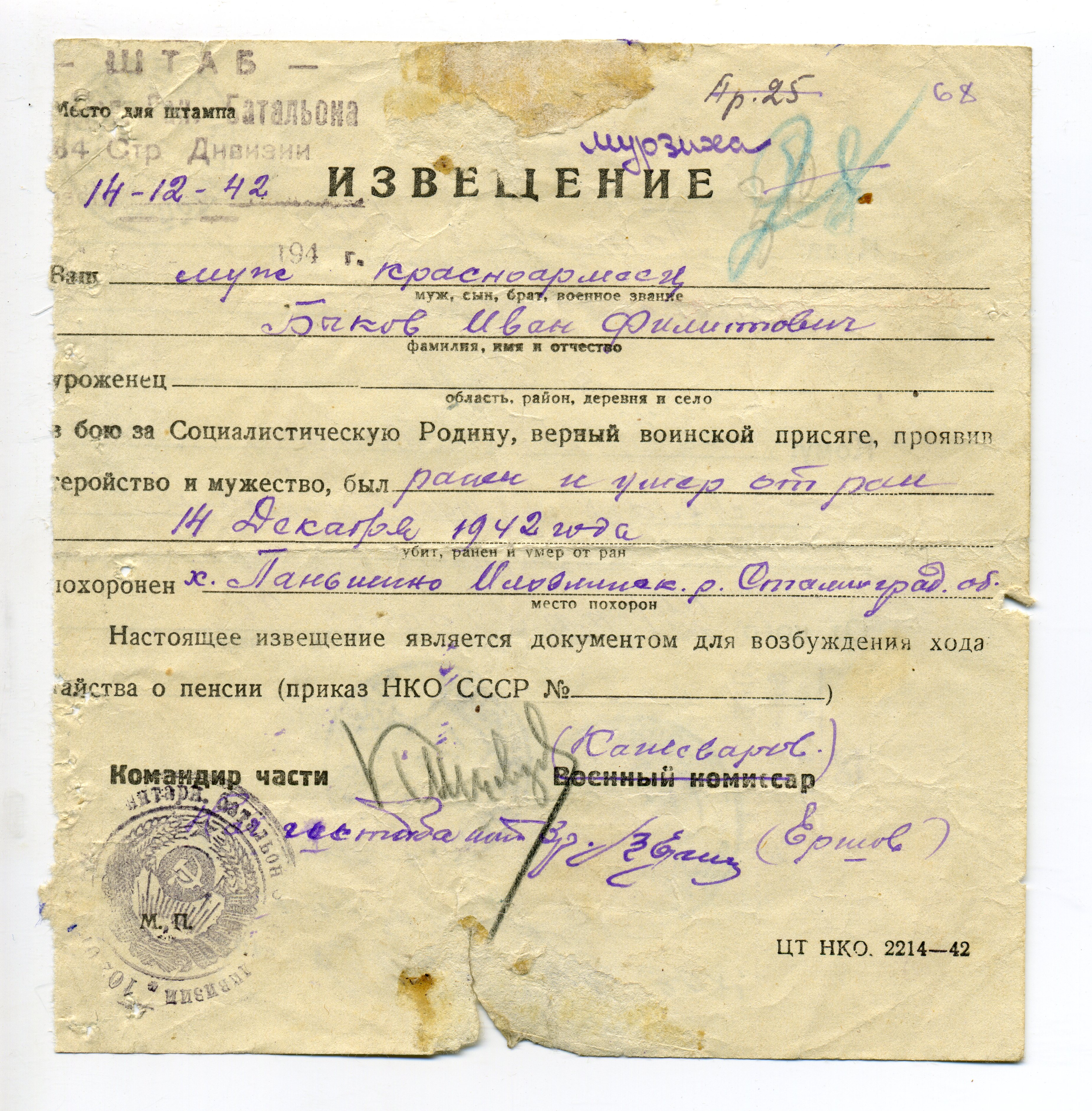 БЫКОВ Иван Филиппович, 1915, с. Мурзиха. Мобилизован Алексеевским РВК в 1941 г. Красноармеец, сапер 122 ОСБ 84 СД. Умер от ран 14 декабря 1942 г., д. Паньшино, Иловлинский р-н, Сталинградская обл.