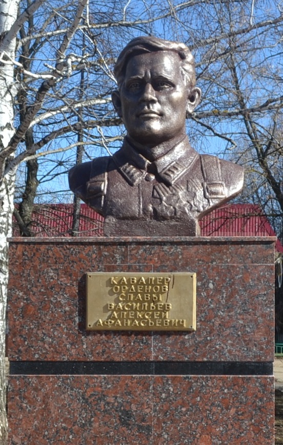 Датировка объекта 2005 год. Бюст Полному кавалеру Ордена Славы Васильев Алексей Афанасьевичу (1918 - 1981). В 1944 г. был присвоен - орден Славы трех степеней;орден славы III степени, 1944 г - орден Славы II степени,т 15.05.1946 - орден Славы I степени. Родился в д. Поручиково Заинского районе. Бюст был установлен к 60-летию Победы в ВОВ. Бюст установлен на постаменте из красного мрамора к 60-летию Победы ВОВ к которому прикреплена табличка со словами "Герой Советского Союза Васильев Алексей Афанасьевич". Расположен на бульваре Победы в центре.