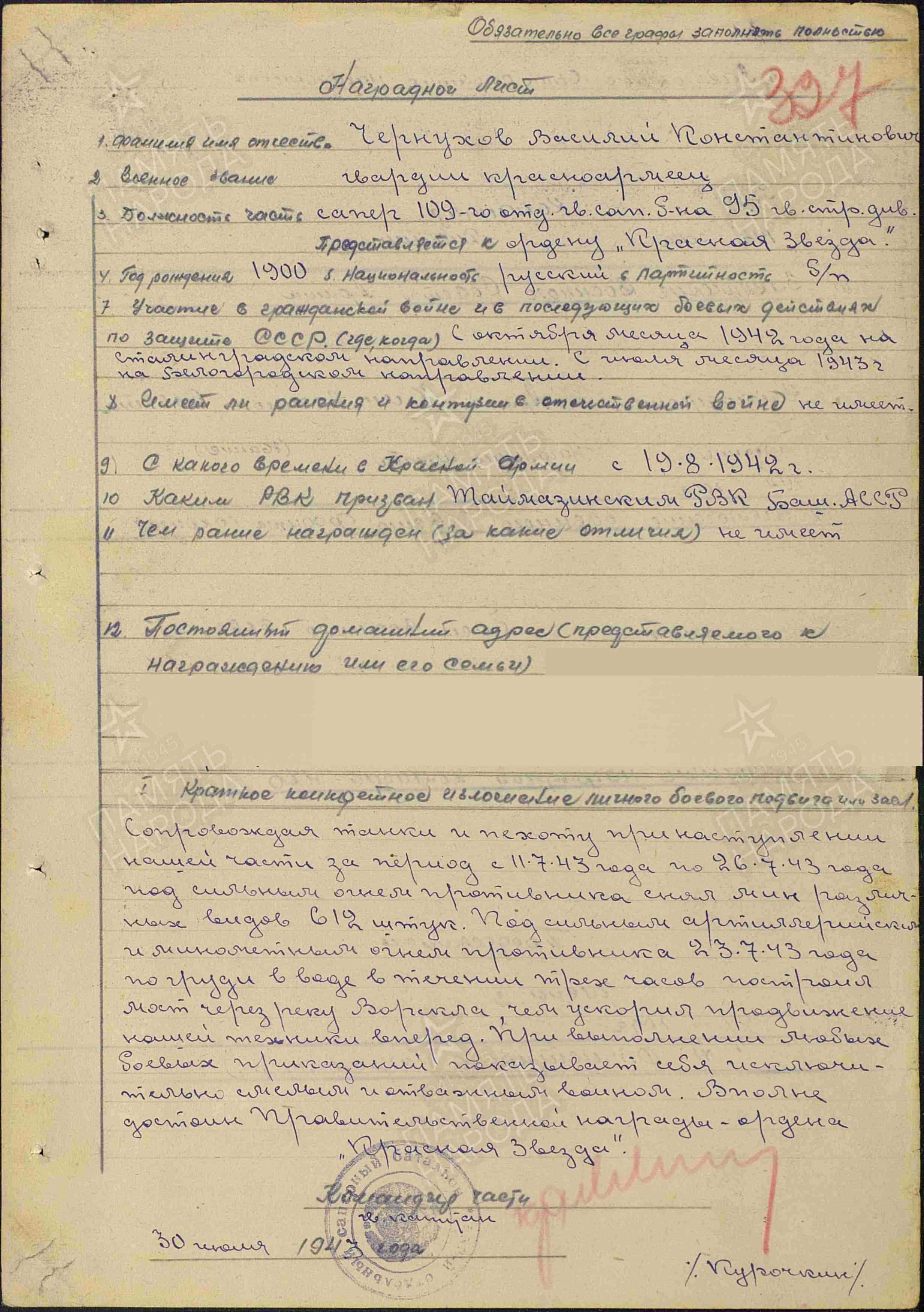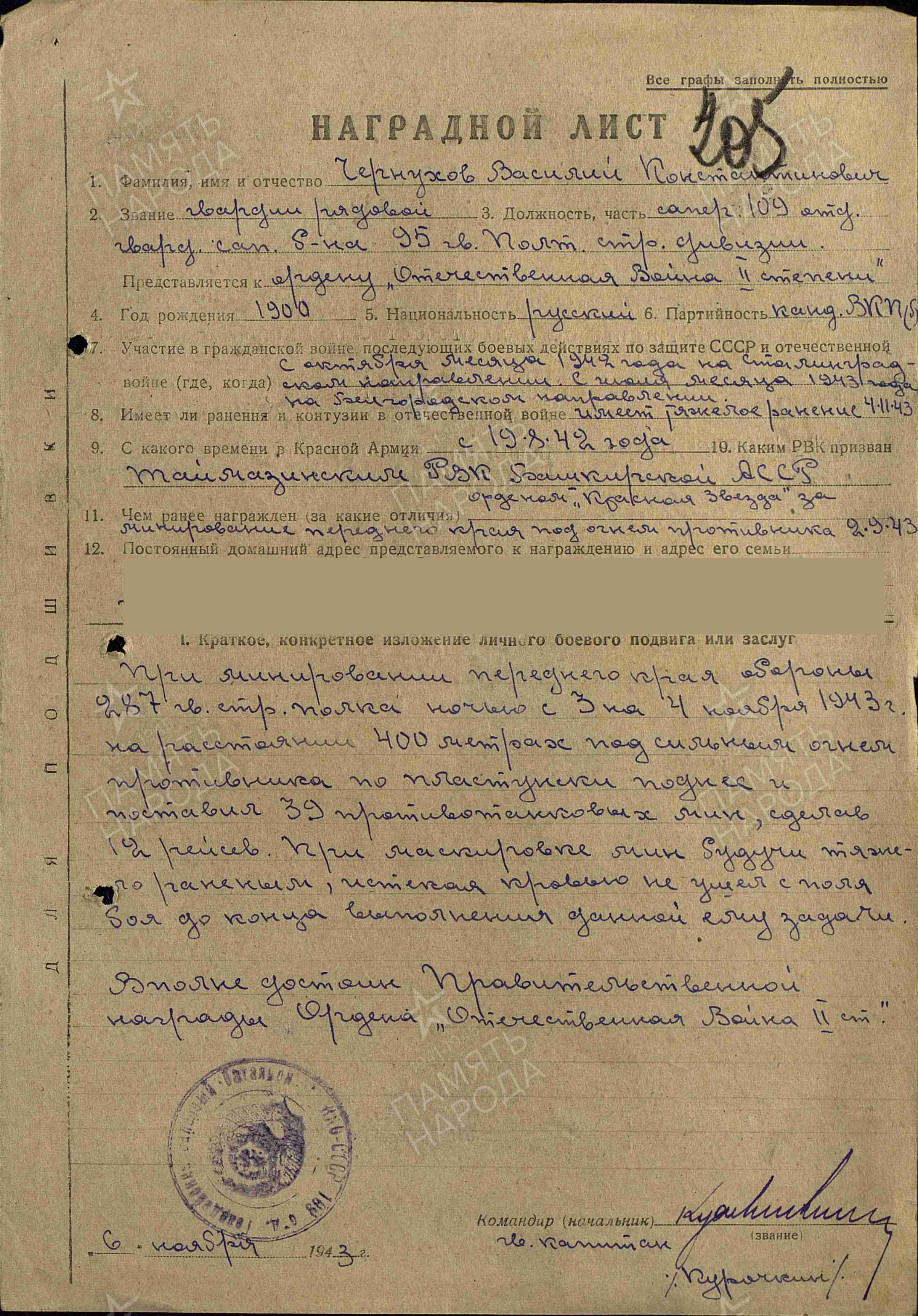 ЧЕРНУХОВ Василий Константинович, 1900, с. Ромодан. Мобилизован Туймазинским РВК БашАССР 19 авг. 1942. Красноармеец/ гв. красноармеец, сапёр 553 отд. СапБ (109 отд. гв. СапБ) 226 СД (с 4 мая 1943 – 95 гв. СД) Сталинградского фронта, 66 А Донского фронта, 5 гв. А Воронежского/ Степного/ 2 Украинского фронта. Канд. ВКП(б). Тяжело ранен 4 ноя. 1943. После излечения, 21 авг. 1944, направлен в 17 ж/д полк. Награждён медалью «За оборону Сталинграда», орденами Красной Звезды, Отечественной войны 2 ст.