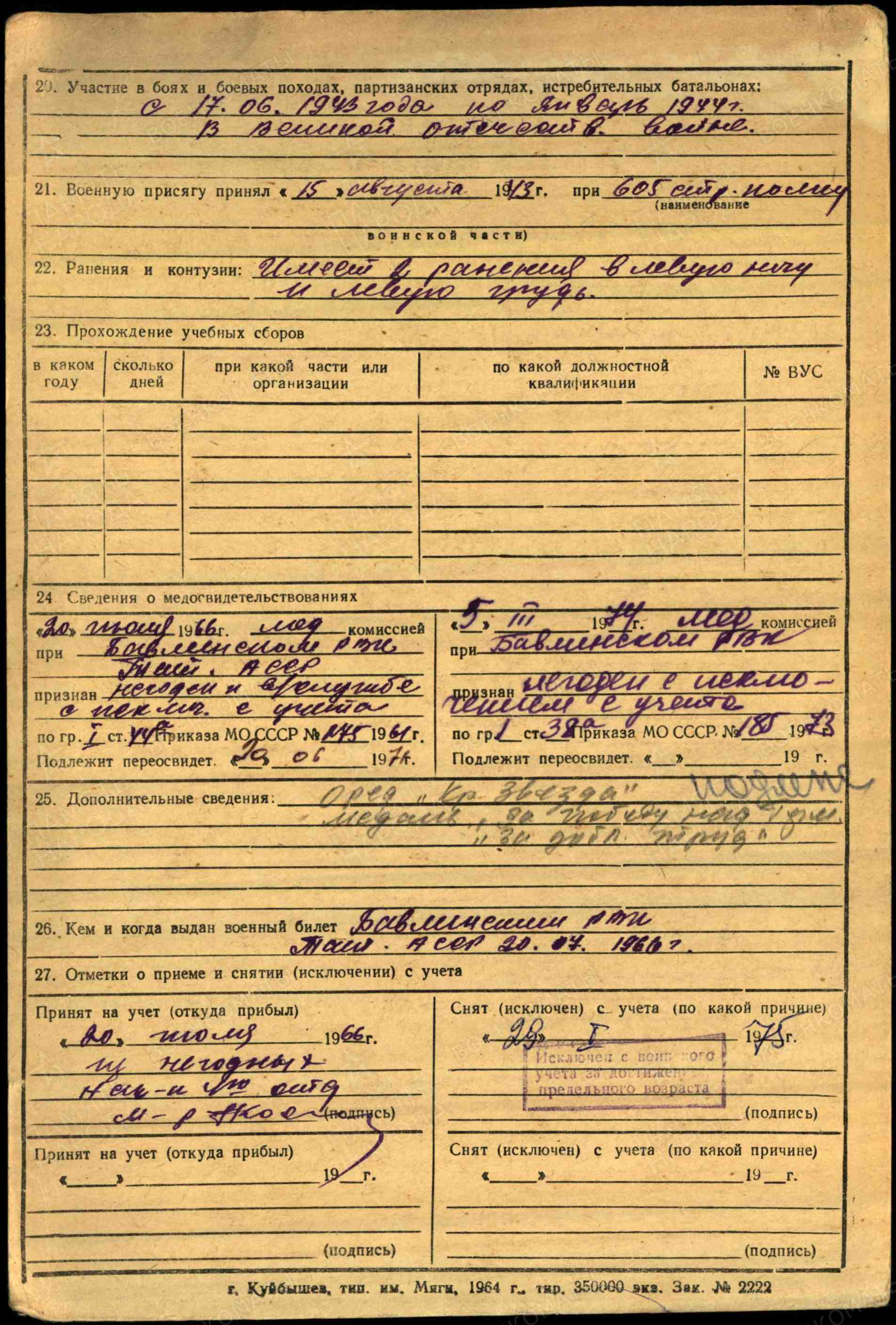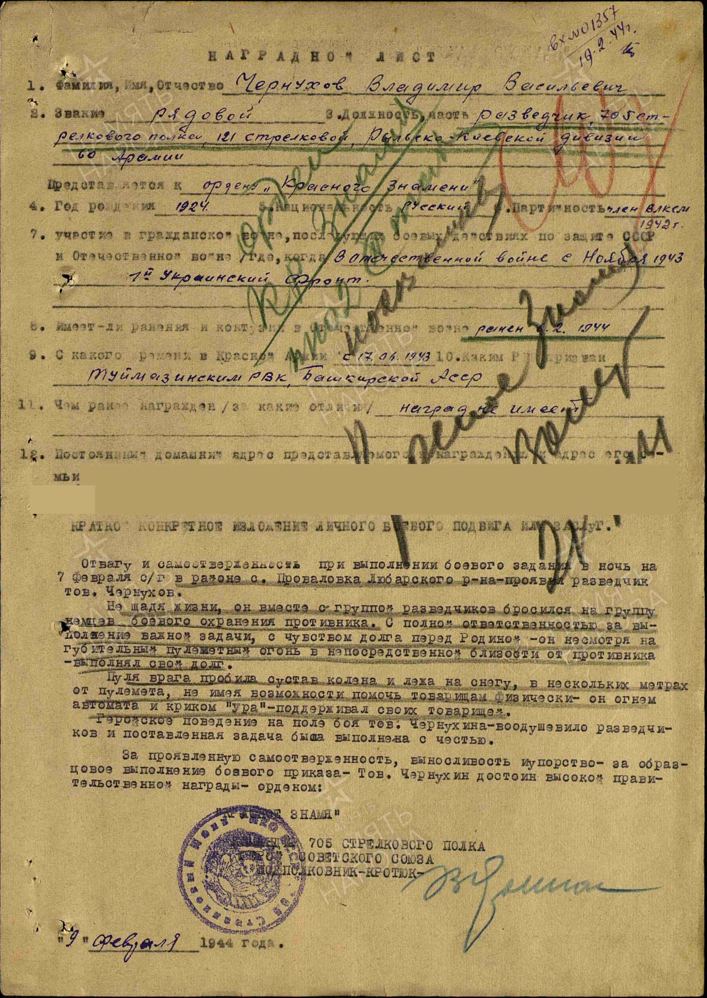 ЧЕРНУХОВ Владимир Васильевич, 1924, с. Ромодан. Член ВЛКСМ. До призыва в армию работал в тылу. Мобилизован Туймазинским РВК БашАССР 17 июня 1943. Красноармеец, разведчик 605 СП 132 СД 77 СК 60 А ЦентрФ. Был ранен в грудь. С дек. 1944 разведчик 705 СП 121 СД 30 СК 60 А 1 УкрФ. Героически проявил себя во время выполнения боевого задания в ночь с 6 на 7 фев. 1944 у с. Проваловка, Любарский р-н, Житомирская обл., УССР: будучи раненым пулей в левый коленный сустав продолжал поддерживать разведгруппу огнём автомата. До 15 окт. 1944 находился на излечении в ЭГ 1424, г. Тбилиси. Уволен по ранению. Награждён медалью «За доблестный труд в Великой Отечественной войне», орденами Красного Знамени, Отечественной войны 1 ст. (1985).