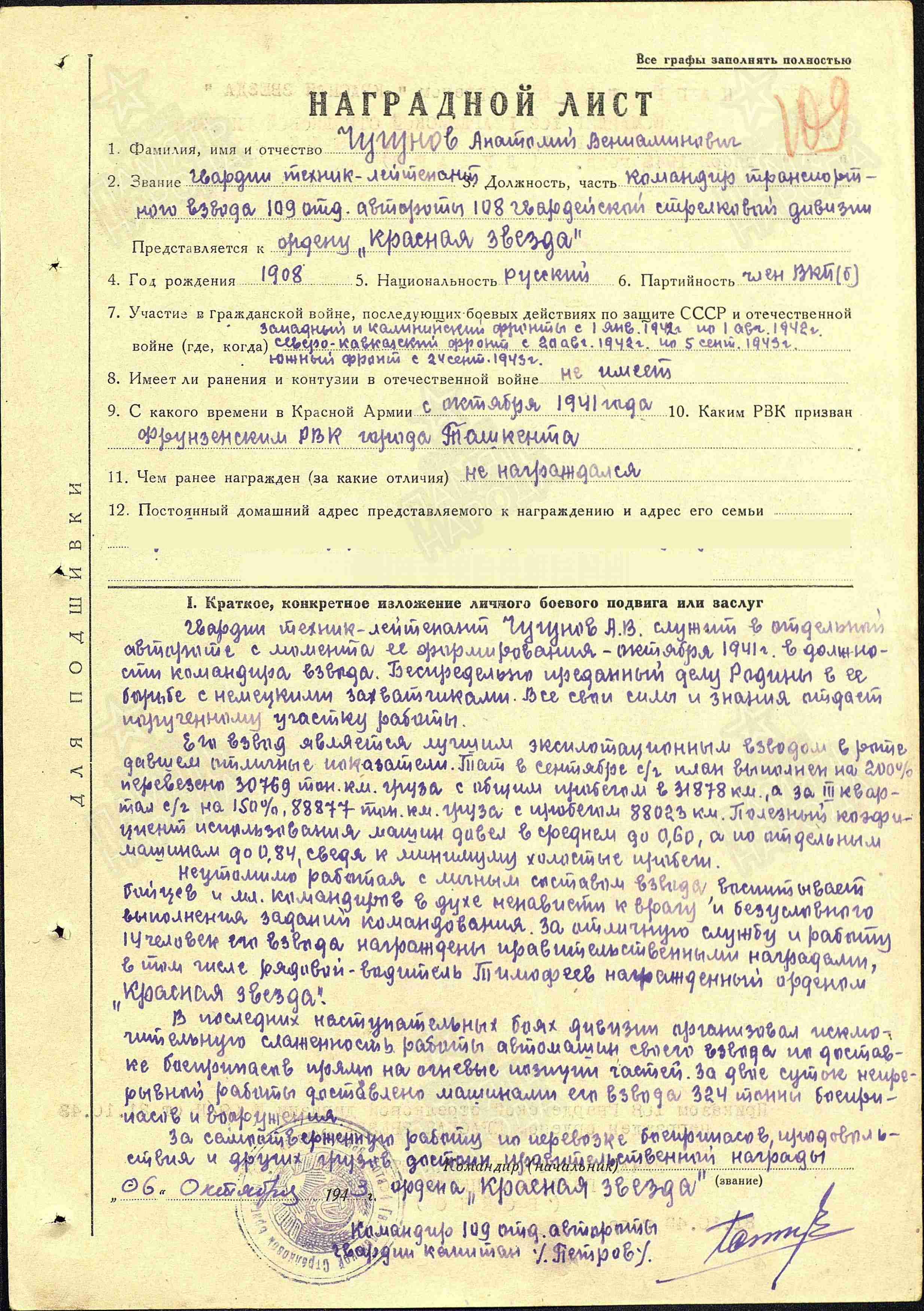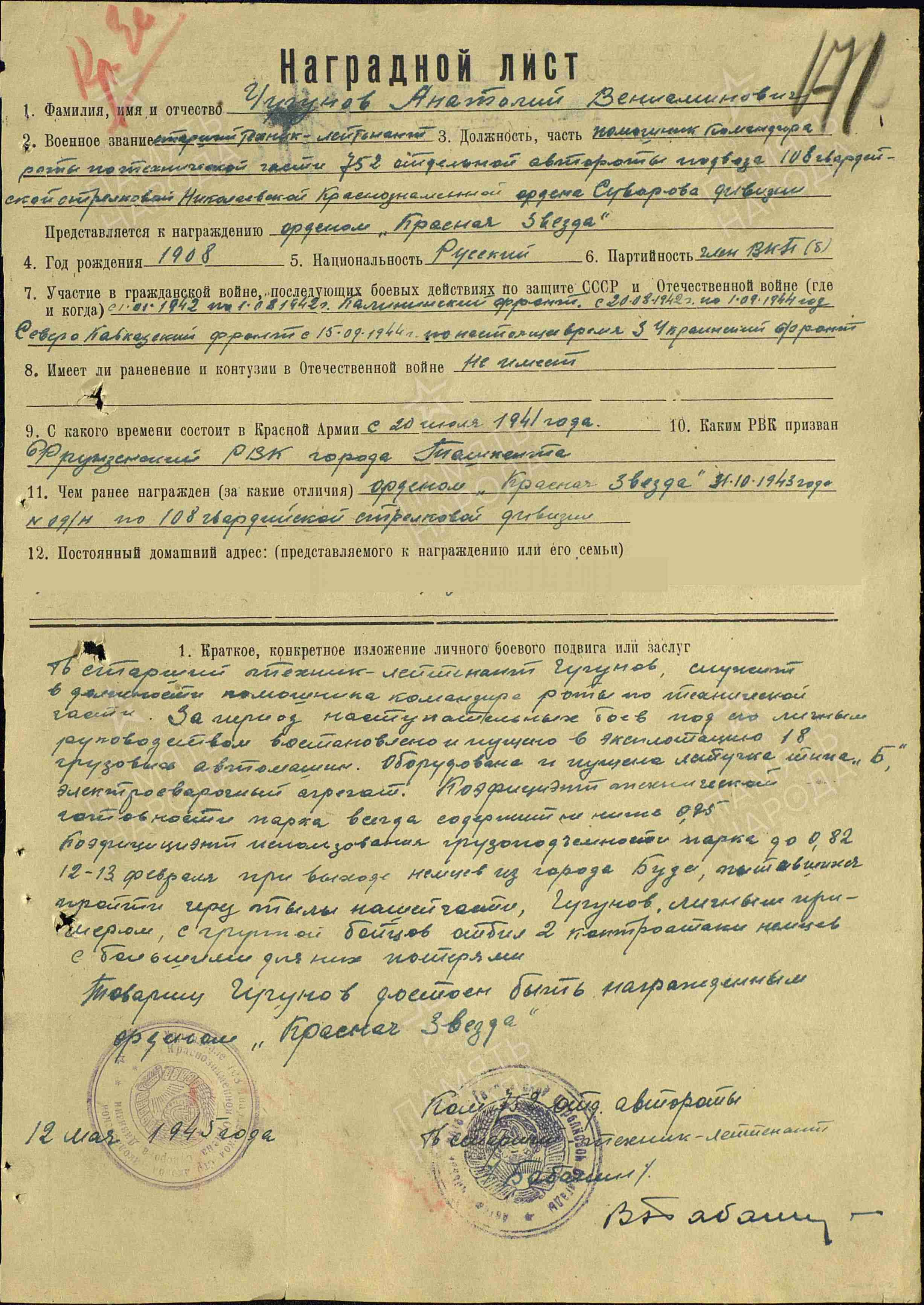 ЧУГУНОВ Анатолий Вениаминович, 1908, д. Войкино. Мобилизован Фрунзенским РВК г. Ташкент 20 июля 1941. Член ВКП(б). Воевал на Западном, Калининском, Северо-Кавказском (56 А), Южном (44 А), 4 (28 А), 3 (5 УдА/ 27 А), 2 Украинском (46 А) фронтах с окт. 1941 в составе 38 СБр, 4 гв. СБр, 108 гв. СД. Воентехник 2 ранга, техник-лейтенант, гв. ст. техник-лейтенант, ком. взвода 109 отд. автотранспортной роты, зам. ком. по технической части 752 отд. автороты подвоза. Награждён медалями «За оборону Кавказа», «За оборону Москвы», «За взятие Будапешта», двумя орденами Красной Звезды (1943, 1945).