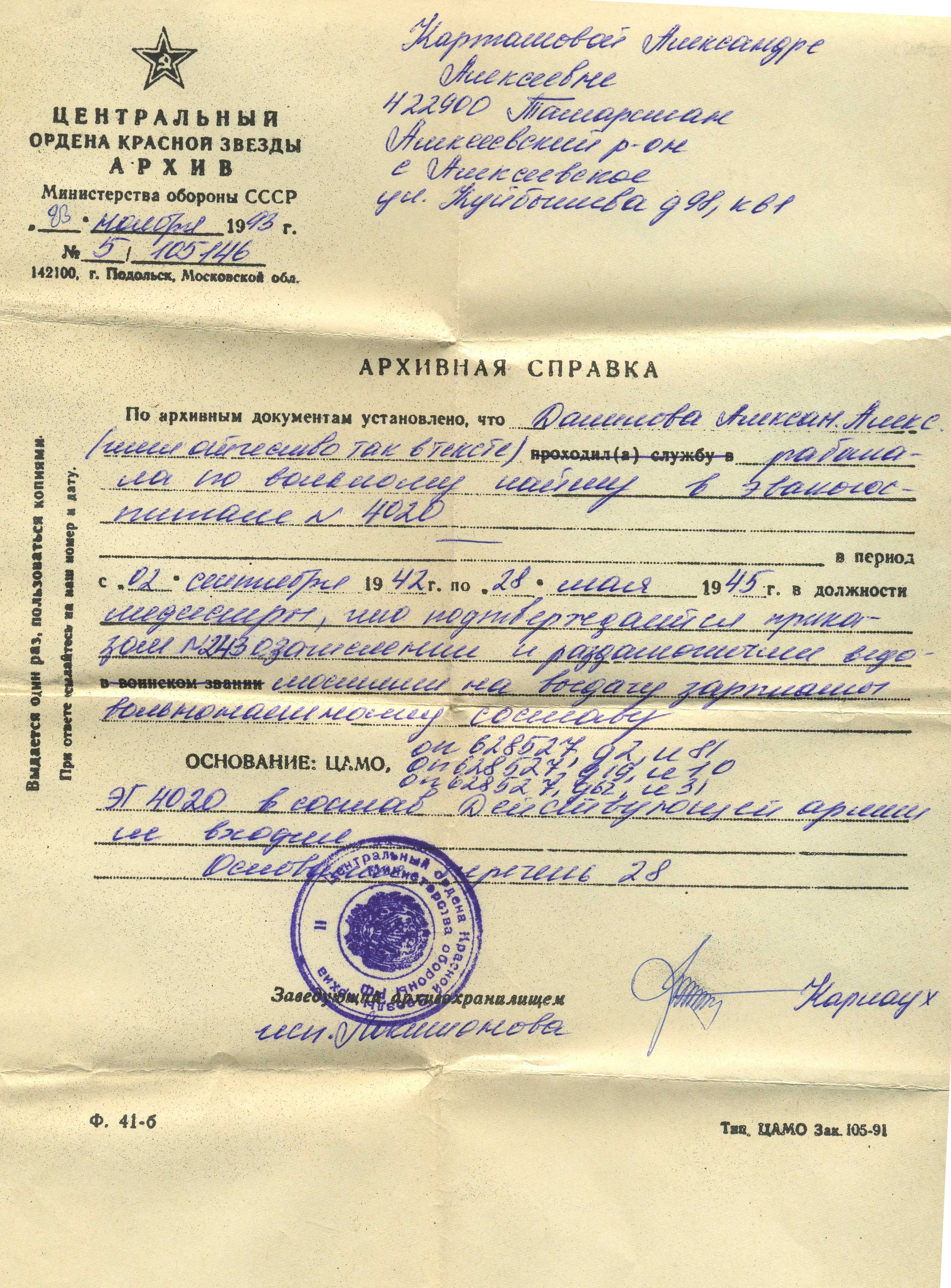 ДАНИЛИНА (КАРТАШЁВА) АЛЕКСАНДРА АЛЕКСЕЕВНА
