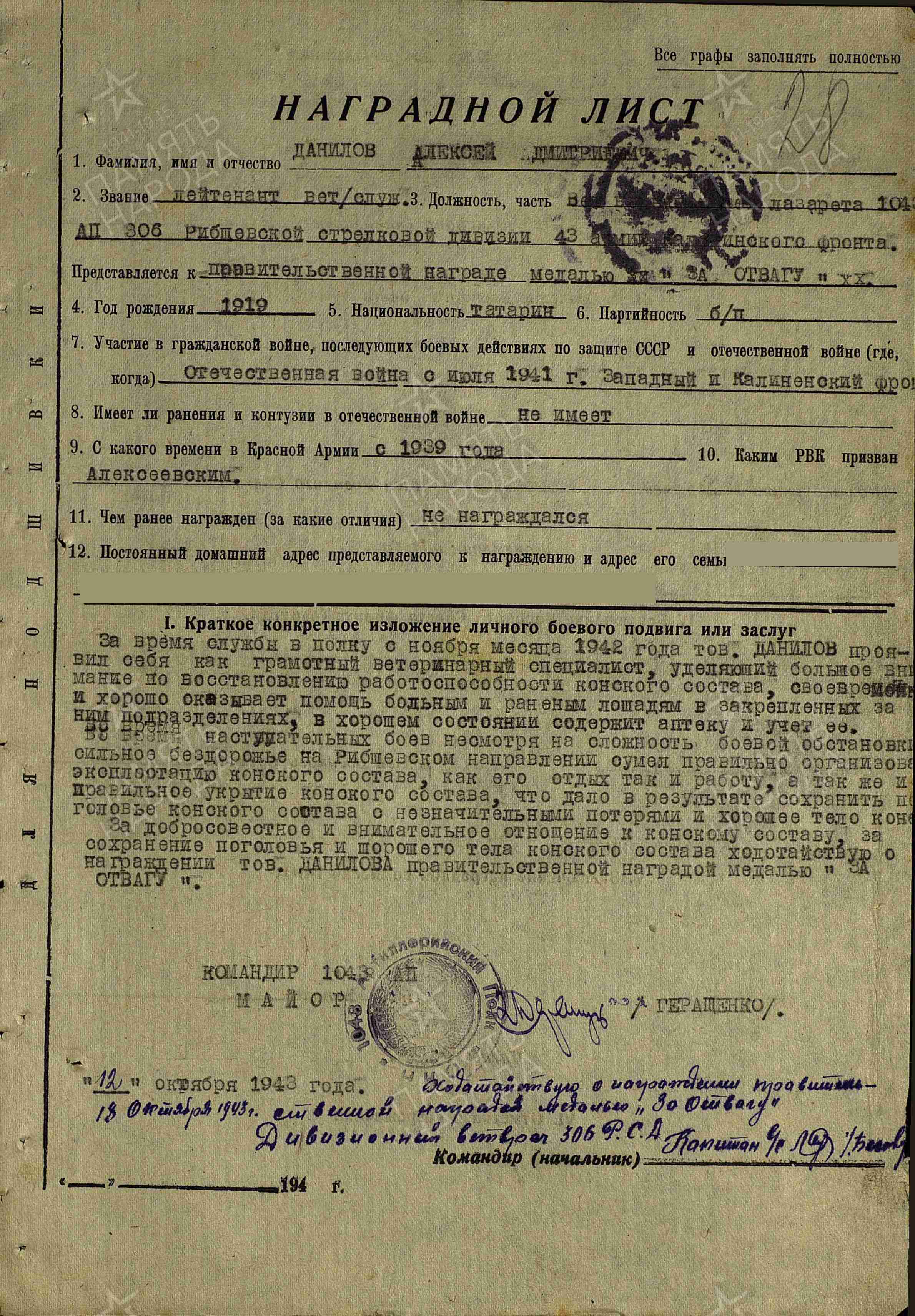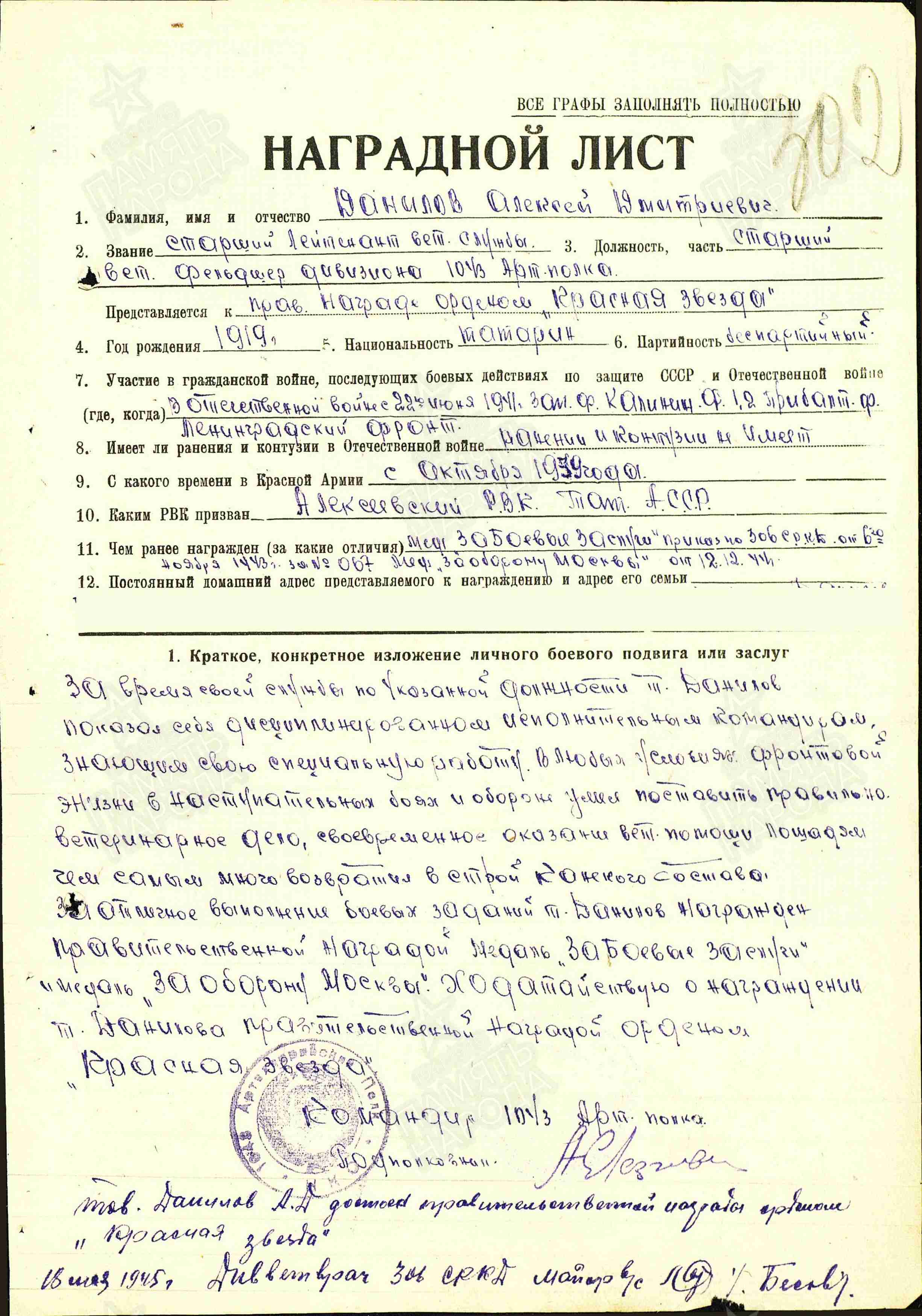 ДАНИЛОВ Алексей Дмитриевич, 1919, д. Хозесаново (Хузя-Хасан), Кайбицкий р-н. Мобилизован Алексеевским РВК в окт. 1939. В боях с июля 1941. Лейтенант ветеринарной службы/ ст. лейтенант/ капитан в/с, военветфельдшер ветлазарета, ст. ветфельдшер дивизиона 1043 АртП 306 СД 43 А Западного, Калининского, 1 и 2 Прибалтийского фронта. Награждён двумя медалями «За боевые заслуги» (1943, 1950), орденом Красной Звезды. Вышел в отставку 14 дек. 1950.