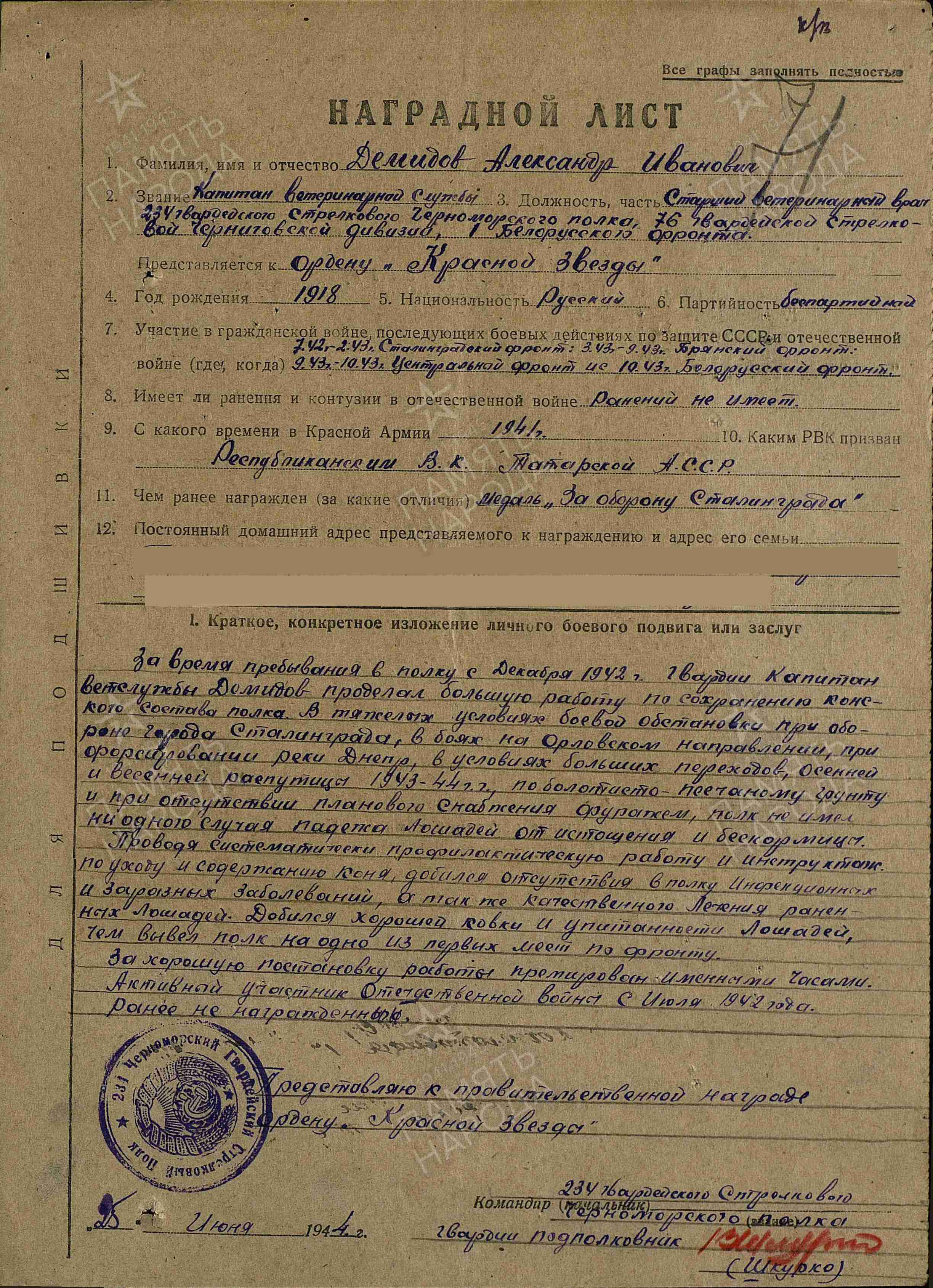 ДЕМИДОВ Александр Иванович, 1918(19), д. Пановка. Мобилизован Пильненским РВК Горьковской обл. 30 июля 1941. Военветврач 3 ранга, капитан вет. службы, гв. майор ветеринарной службы. Воевал на Сталинградском, Брянском, Центральном, Белорусском, 1 Белорусском фронтах в составе 125 СД, 157 СД, 101 гв. СД. Ст. ветврач 234 гв. СП 76 гв. СД 61 А/ 70 А 1 БелФ. Награждён медалями «За оборону Сталинграда», «За освобождение Варшавы», орденами Красной Звезды, Отечественной войны 2 ст. (1985).