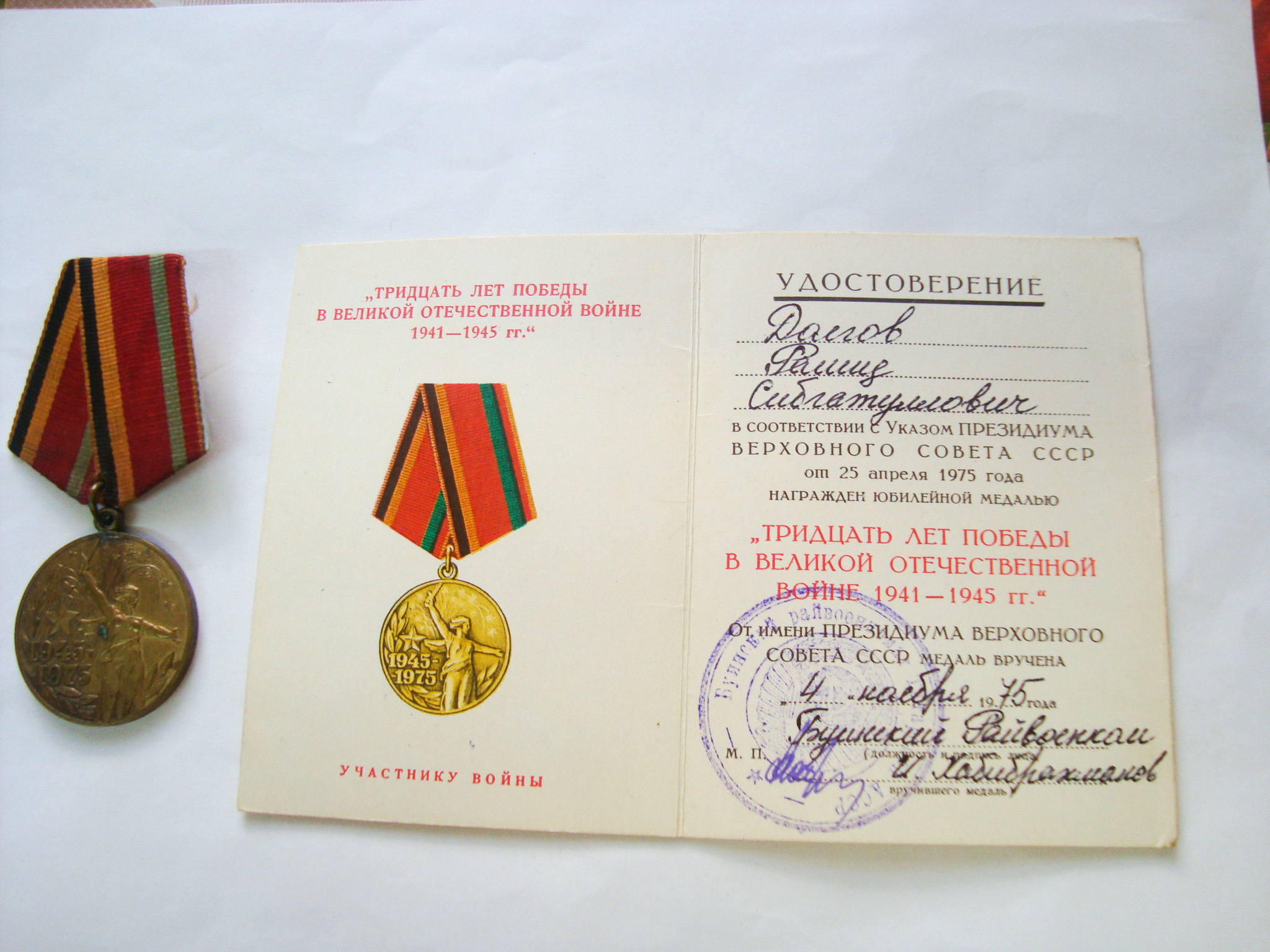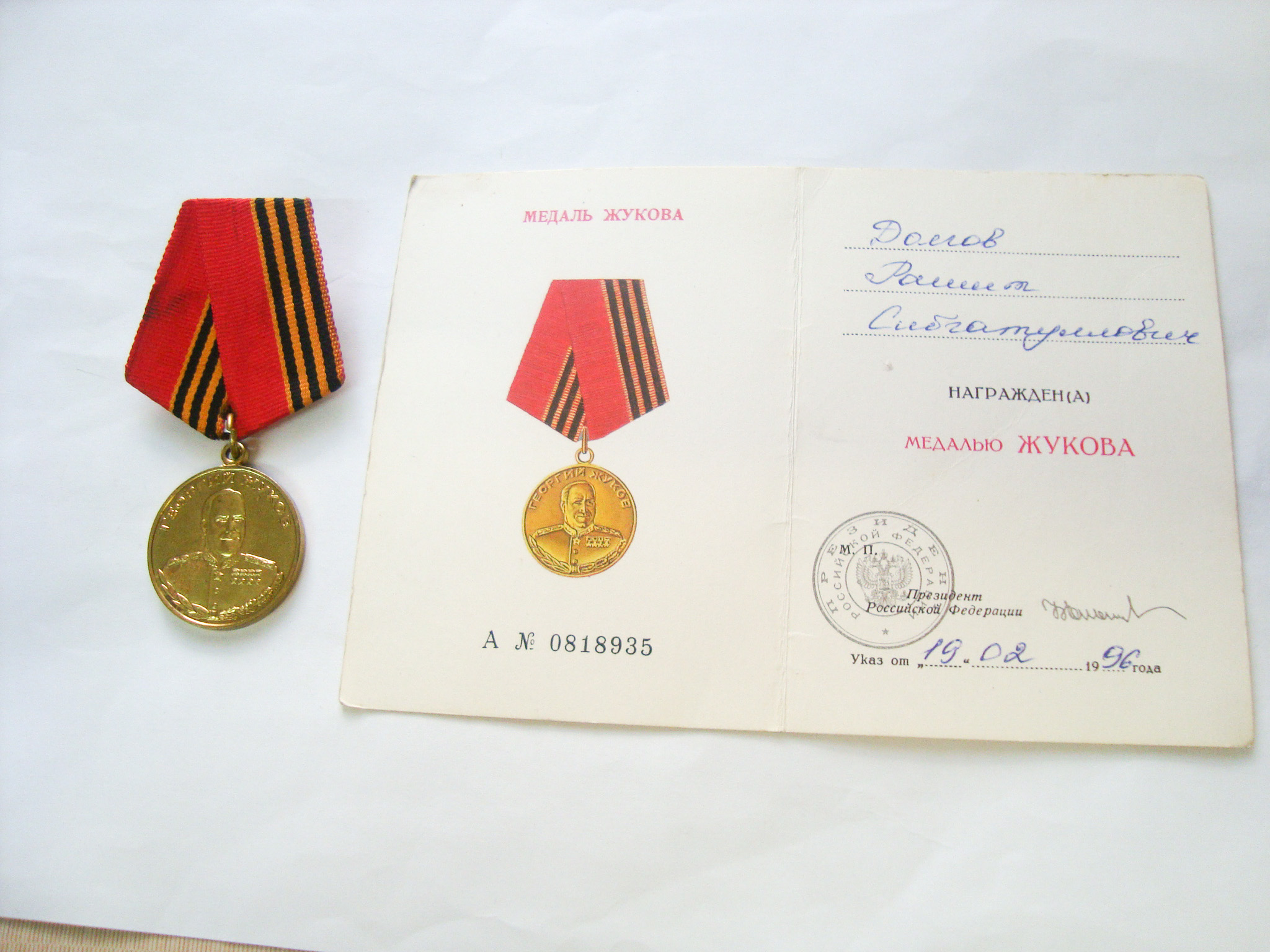 от имени Президиума Верховного Совета СССР, награжден медалью «Жукова».